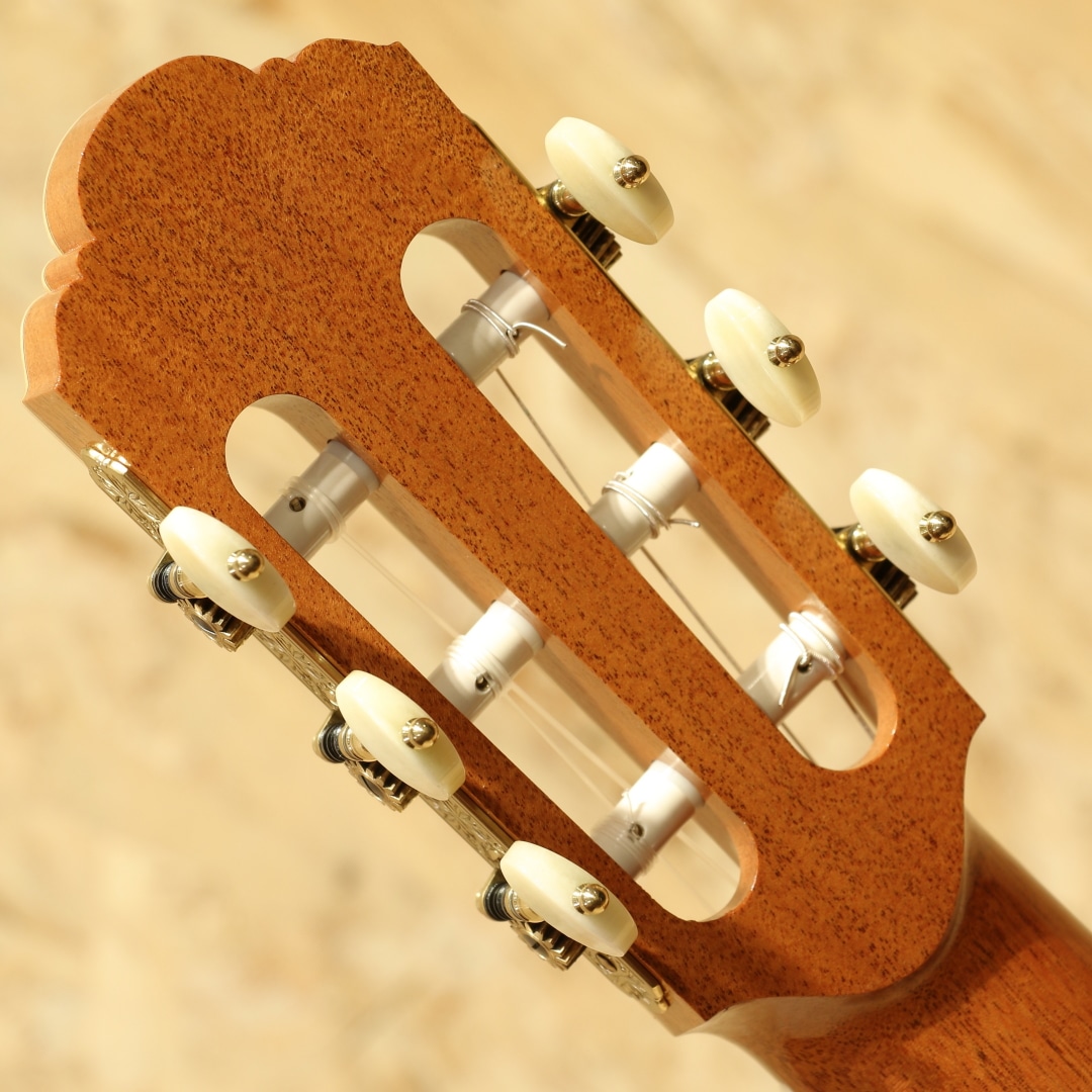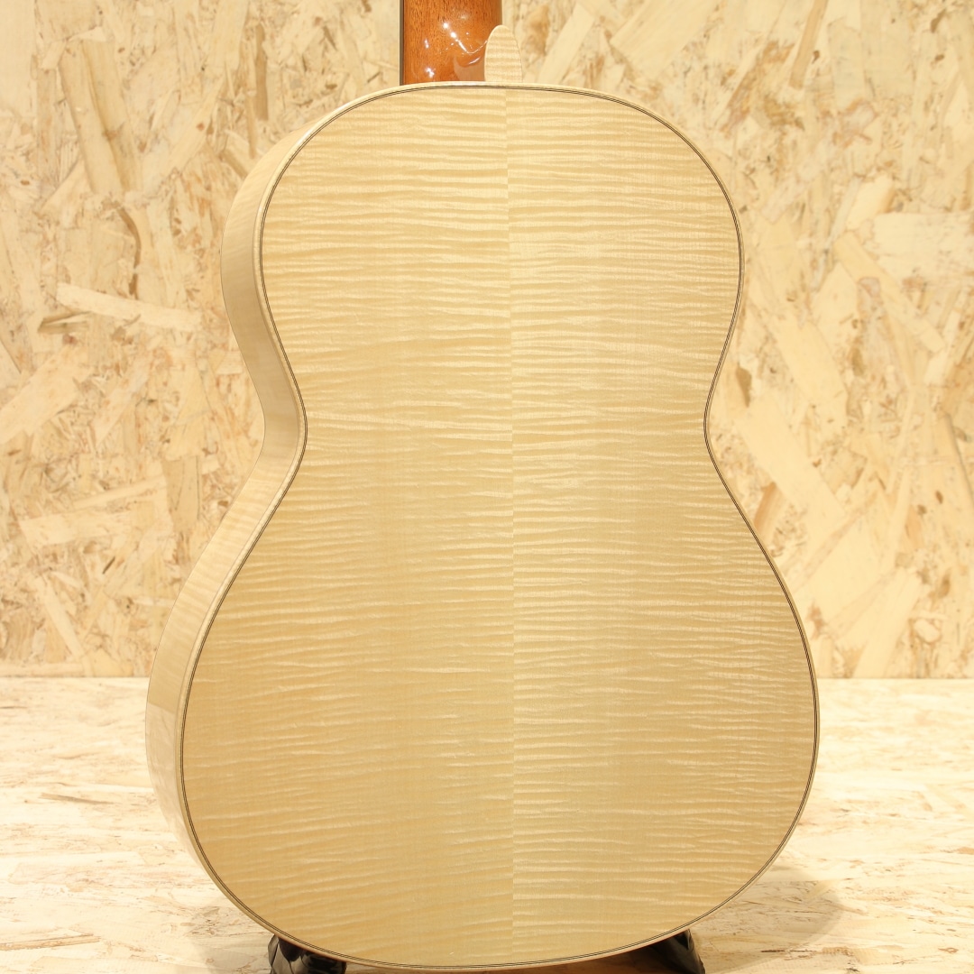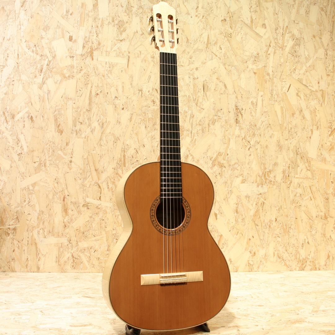 カナダの名門ラリビーに在籍した過去を持ち、オリジナリティのある発想や伝統的な手法をミックスした作風を持つ巨匠”サーゲー・デ・ヤング”。多くの門下生を持ち、その中には個人製作で活躍している方もおられます。そんなサーゲーの愛娘”ジョシア・デ・ヤング”。13歳の頃に初めてギター製作を行い、19歳の頃にはアメリカの弦楽器製作家大会で称賛を浴びるなど確かな技術を持つ製作家です。本器はコンサートモデルとして製作された”Classical Cedar Maple 650mm”。2020年製USED品。ウェスタンレッドシダートップ、メイプルサイド&バック、マホガニーネック、エボニー指板、メイプルブリッジ、オリジナルペグ、非常に緻密なウッドモザイクロゼッタ、ウッドパーフリング、メイプルバインディング、ラティスブレイシング、シェラック塗装。偉大なギター製作家であるサーゲー・デ・ヤングを家族に持つジョシア。その高い基準に応えるべく兄弟たちと日夜議論を交わし合い切磋琢磨していきました。その後サーゲーの下でギター製作講座の助手を務めています。またゲザ・バーグハート氏にフレンチポリッシュの教えを受けた経歴を持ちます。基本的な設計はラティスブレイシング、接着には膠を使用しており、フレンチポリッシュにはシェラックなどの天然樹脂を好んで使用しています。伝統的な製作手法と現代的なデザインをミニマリスト的な視点の美学で纏め上げて製作する実力派。実を追求したデザインと確かなサウンドを持ち合わせたギターです。音色は太くありながらしっかりと粒立ちの良いクリアなサウンド。ボリューミーで遠達性のありそうな響きからはステージでの演奏を考慮した音作りが感じられます。ウエスタンレッドシダーで軽い演奏タッチにも対応出来そうな反応性と繊細さを感じるしなやかなトーンを与えられています。湿り気はなく乾いた音色。箱が一体となって響いている感覚が心地よく、演奏の頼りになる作品です。質実共に高められた製作家の作品。ネック裏に帯状のシェラック塗装の反応跡、ボディサイドの6弦側と1弦側のボトム箇所にケースと反応したような跡が見られますが、塗装の性質上致し方無いでしょう。その他にはボディトップロゼッタ横に爪のような凹み跡が数個見られる程度。全体を通して使用感は少なく、キレイな状態をキープされています。ネック周りの演奏性も良し、サドル残もしっかりと残されておりこれからの使用にも対応できそうな1本です。カナダルシアー特有のサウンド、女流作家が創るしなやかな響きも持ち合わせた作品です。シンプルに纏め上げられた美学の見える1本。是非そのサウンドをお確かめ下さい。