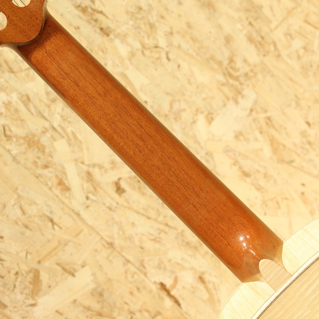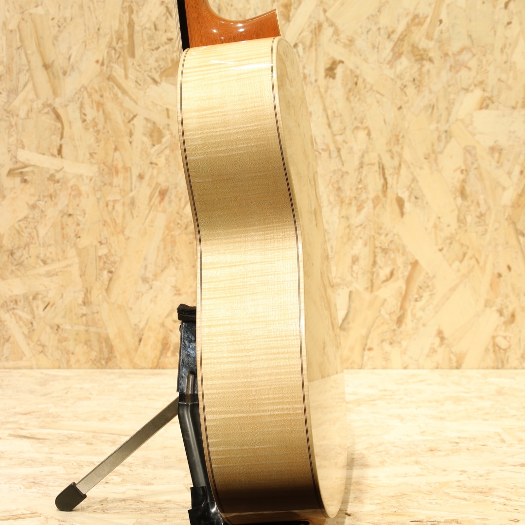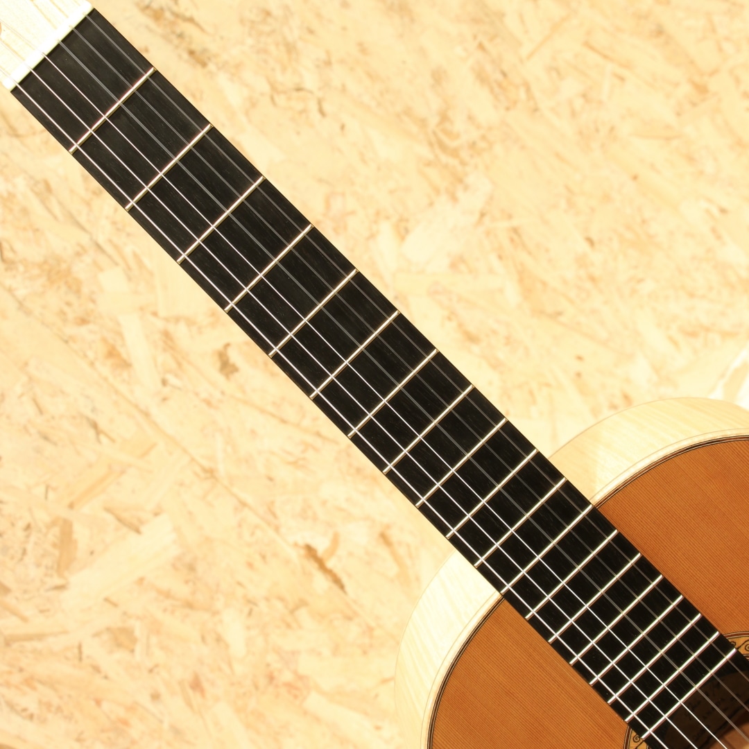 カナダの名門ラリビーに在籍した過去を持ち、オリジナリティのある発想や伝統的な手法をミックスした作風を持つ巨匠”サーゲー・デ・ヤング”。多くの門下生を持ち、その中には個人製作で活躍している方もおられます。そんなサーゲーの愛娘”ジョシア・デ・ヤング”。13歳の頃に初めてギター製作を行い、19歳の頃にはアメリカの弦楽器製作家大会で称賛を浴びるなど確かな技術を持つ製作家です。本器はコンサートモデルとして製作された”Classical Cedar Maple 650mm”。2020年製USED品。ウェスタンレッドシダートップ、メイプルサイド&バック、マホガニーネック、エボニー指板、メイプルブリッジ、オリジナルペグ、非常に緻密なウッドモザイクロゼッタ、ウッドパーフリング、メイプルバインディング、ラティスブレイシング、シェラック塗装。偉大なギター製作家であるサーゲー・デ・ヤングを家族に持つジョシア。その高い基準に応えるべく兄弟たちと日夜議論を交わし合い切磋琢磨していきました。その後サーゲーの下でギター製作講座の助手を務めています。またゲザ・バーグハート氏にフレンチポリッシュの教えを受けた経歴を持ちます。基本的な設計はラティスブレイシング、接着には膠を使用しており、フレンチポリッシュにはシェラックなどの天然樹脂を好んで使用しています。伝統的な製作手法と現代的なデザインをミニマリスト的な視点の美学で纏め上げて製作する実力派。実を追求したデザインと確かなサウンドを持ち合わせたギターです。音色は太くありながらしっかりと粒立ちの良いクリアなサウンド。ボリューミーで遠達性のありそうな響きからはステージでの演奏を考慮した音作りが感じられます。ウエスタンレッドシダーで軽い演奏タッチにも対応出来そうな反応性と繊細さを感じるしなやかなトーンを与えられています。湿り気はなく乾いた音色。箱が一体となって響いている感覚が心地よく、演奏の頼りになる作品です。質実共に高められた製作家の作品。ネック裏に帯状のシェラック塗装の反応跡、ボディサイドの6弦側と1弦側のボトム箇所にケースと反応したような跡が見られますが、塗装の性質上致し方無いでしょう。その他にはボディトップロゼッタ横に爪のような凹み跡が数個見られる程度。全体を通して使用感は少なく、キレイな状態をキープされています。ネック周りの演奏性も良し、サドル残もしっかりと残されておりこれからの使用にも対応できそうな1本です。カナダルシアー特有のサウンド、女流作家が創るしなやかな響きも持ち合わせた作品です。シンプルに纏め上げられた美学の見える1本。是非そのサウンドをお確かめ下さい。