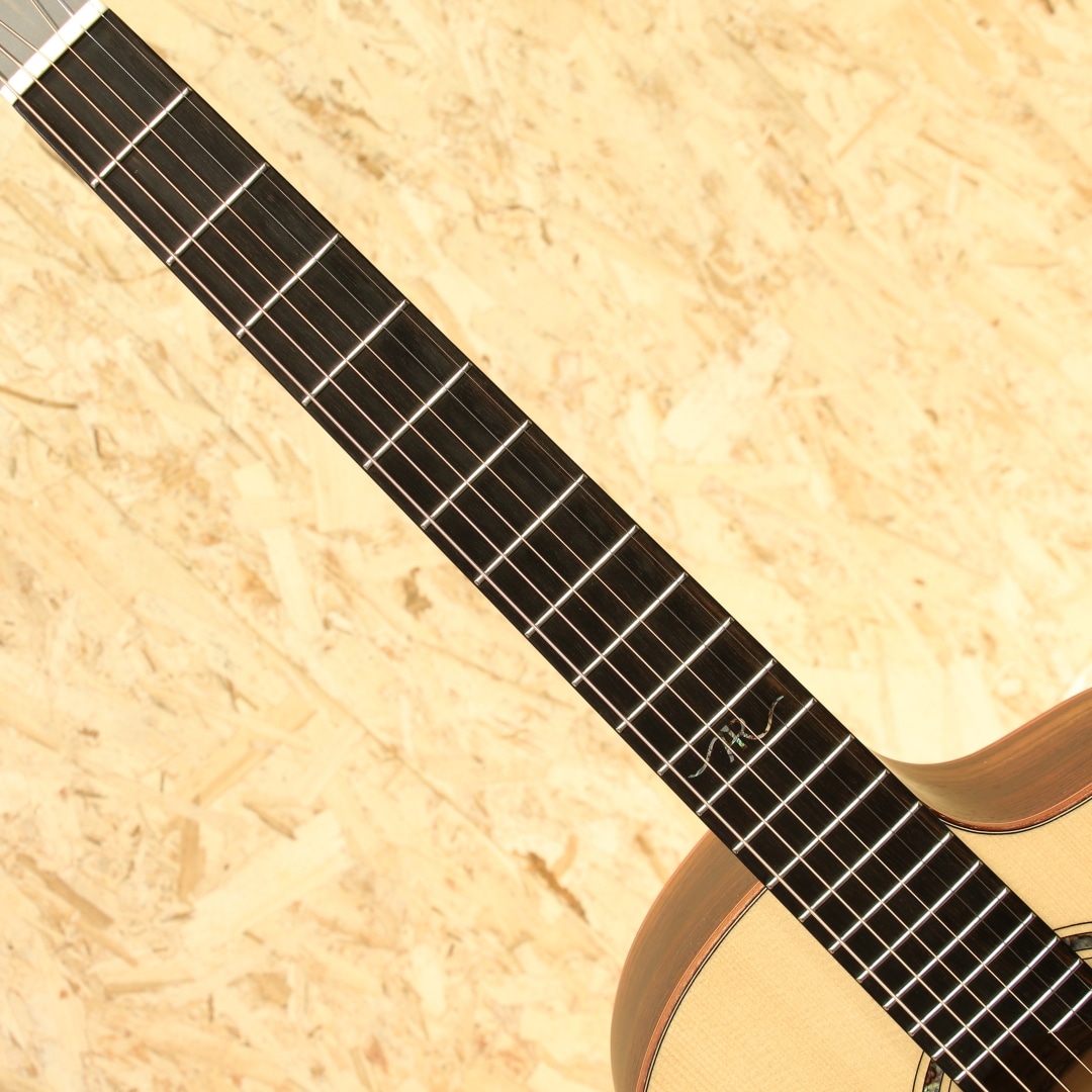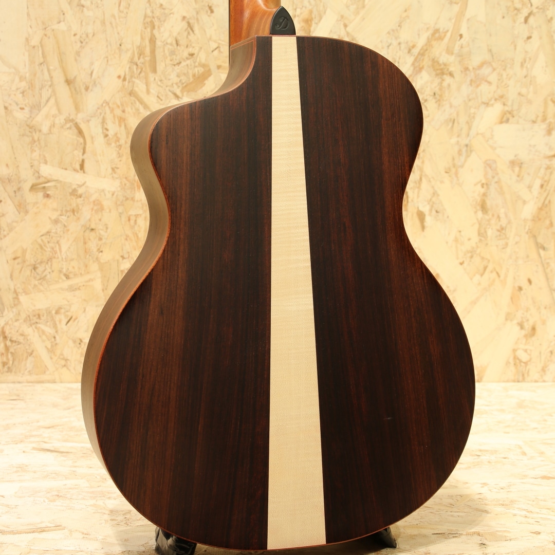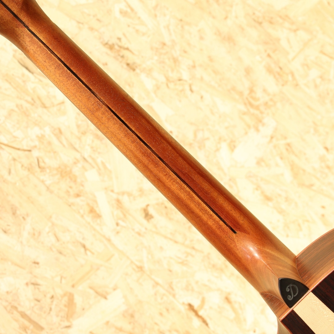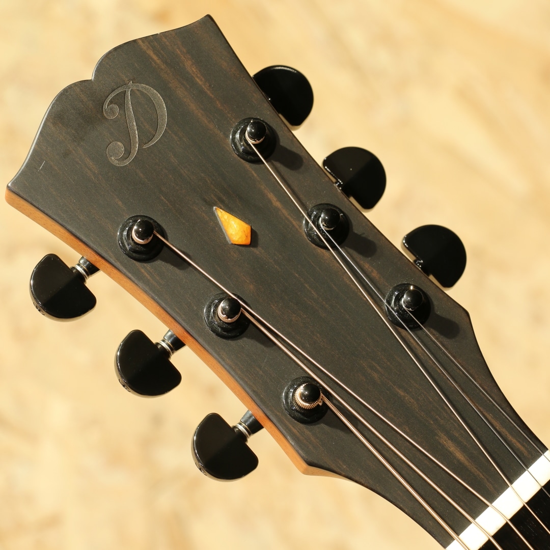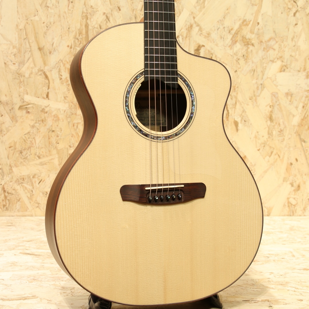 東欧のスロバキアに工房を構えるギターブランド"Dowina(ドウィナ)"。その中でも古くは琥珀を運ぶ貿易網であったアンバーロード、その中継地点にスロバキアがあったことにあやかりネーミングされた”Amber Road”シリーズ。本器はグランドオーディトリアムサイズ”GACE-ds”。2020年代製のUSED品。ドロミテ・スプルーストップ、インディアンローズウッドサイド、インディアンローズウッド&メイプル3Pバック、カヤマホガニー&ウェンジネック、エボニー指板、エボニーブリッジ、クリアピックガード、45mmナット幅、カッタウェイ&L.R.Baggs Anthem搭載。トップは艶のあるグロス仕上げ、ネック裏とサイド&バックは艶無しサテン仕上げの仕様。北欧のヨーロピアンブランドだけに近い国々のブランドと似た仕様を持っているところに、製作理念のようなものを感じさせます。ナット幅は45mmとなっておりフィンガースタイルにも対応し易くなっており、カッタウェイの搭載によってポジションを問わない演奏性を獲得。どちらもソロギターでは嬉しい点でしょう。ヘッドにはアンバー(琥珀)のようなものが埋め込まれており、シリーズ名にちなんだ外観となっています。更に特筆すべき点はトップ材のドロミテスプルース。北イタリアはアルプス・ドロミテ地方で産出される材で、古くから弦楽器の表板として使われ、ストラディバリがこの木を使っていたことでも知られています。そしてクラシックテイストを感じさせる、低音の落ち着いている出方と高音弦の抜け方が気持ち良いトーン。やや奥ゆかしさを感じる音色、ボワつかず、ややタイト気味に音が立ち上がります。それでも箱で増幅している感覚やオープンなトーンも持ち合わせており、出過ぎている帯域が無いところにバランスの良さを感じられます。仕様やサウンドからフィンガースタイルプレイヤーに好まれそうな、ヨーロッパブランド特有の音色を持ちつつ演奏性の高い1本。L.R Baggs Anthemピックアップシステムを製造時に搭載。クッキリとした音像を拾えるピエゾ、そこにボディの空気感を拾えるマイクを足して出力できるシステムです。任意でマイクのミックス具合を調整でき、ソリッドなピエゾサウンドから空気感のある自然なサウンドまでその場に応じて可変出来る優秀なシステムです。ボディトップ面6弦側のボトム箇所、トップ面の指板6弦側横、ブリッジ1弦側下部に若干の当てキズが見られるのが惜しい点、全体を通しても使用感は少なく状態の良いまま保たれた個体。ネック周りの演奏性も整えられ、フィンガースタイルの要望にも応えられるであろう弾きやすい1本です。生での演奏からラインサウンドまで。拘り派の方にも満足して頂けるであろう優秀なギター。金額を考えると非常にコストパフォーマンスの良いUSED品です。是非ご検討下さいませ。
