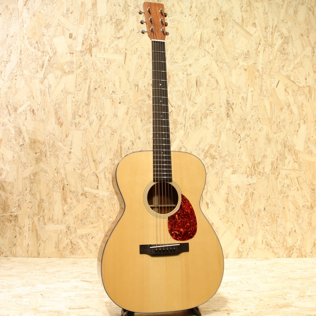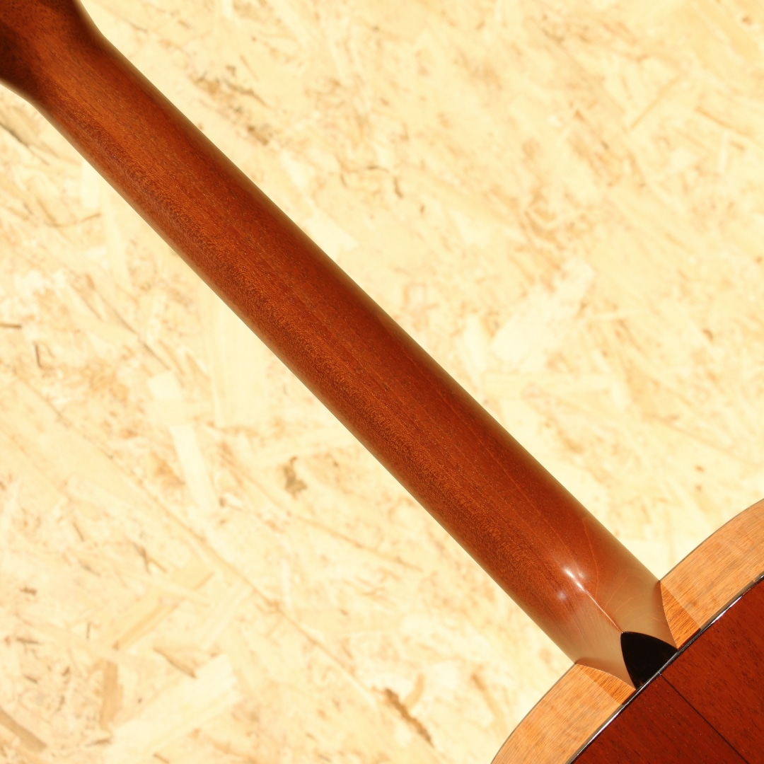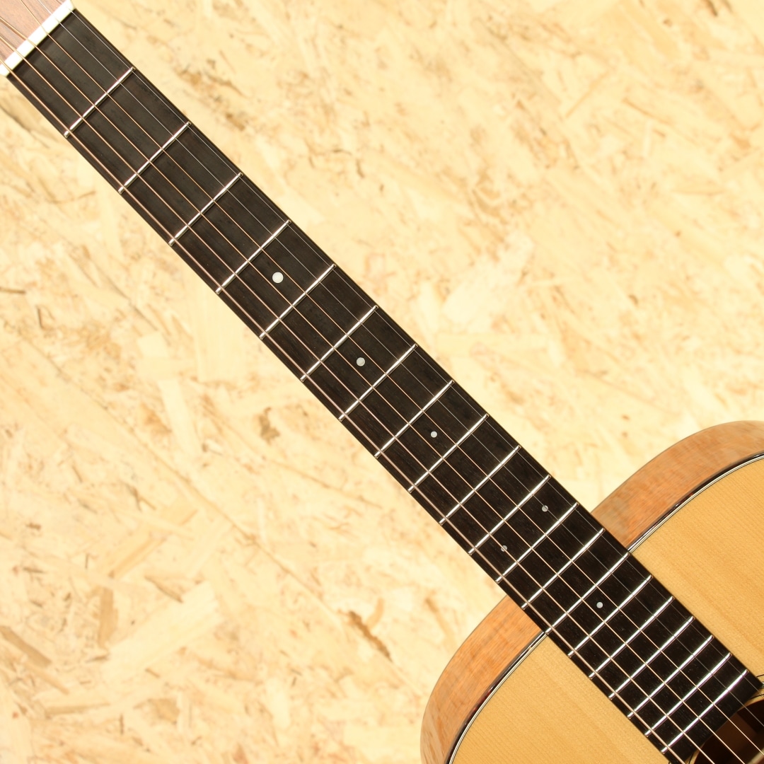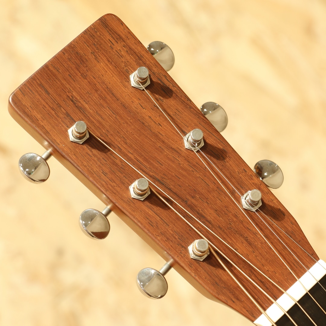 HEADWAYのマスタービルダー、”信州の名工”百瀬恭夫氏。ヘッドウェイ立ち上げにも関わり、長年ヘッドウェイのギター造りをリードしていた日本を代表する熟練の職人の1人です。惜しくも2024年に亡くなられましたが、これまで数多くの作品を作り、そして信念と技術は今では愛弟子たちが継承し製作を行っています。本器は百瀬氏製作”OM-180 Custom”。2021年の晩年期製作のUSED品です。アディロンダックスプルーストップ、ホンジュラスマホガニーサイド&バック、ホンジュラスマホガニー1Pネック、エボニー指板&ブリッジ、ロングサドル、ゴトーSXB-510Vニッケルペグ、ドット指板アバロンインレイ、べっ甲柄塗り込みピックガード、べっ甲柄バインディング、ADJトラスロッド、34セミフォワードシフテッドスキャロップドXブレイシング、ラッカーフィニッシュ。百瀬氏は丈夫で長い期間安心して弾ける「育てるギター」を信念に長い間製作を行ってきました。その中で響きと強度のバランスを日々研究、熟考しており亡くなられる直前まで新しいブレイシングパターンを研究していました。その人生をかけた作品たちは各地に散らばり、今なお多くのギター弾きの手元でそのサウンドを響かせています。本機は戦前期のスタイル18にインスパイアされた仕様。恐らく1933年辺りの仕様を狙ったのだと推測されます。そのスペックを基に若干のアレンジを施して製作。ナット幅は43mmで握り込みやすい仕様とされており、戦前期のサウンド傾向と39年以降の演奏性をミックスされています。若干V気味のやや肉付きの良いグリップですが、しっかりとした手応えには安心感を覚えます。トラスロッドはADJ仕様で調整しやすい構造とされ、現代的に。古き良きと扱いやすさの両立を図ったカスタム品です。その実、太く芯のあるトーンと地に足の付いたブレない響き。百瀬氏の作品には共通して、やや丸く落ち着いたトーンでありつつも押し出し感のあるサウンドがあります。この個体もその例に漏れず耳障りな成分は少なく、それでいて欲しい鉄弦的な響きは損なわれていない絶妙な音作り。音の分離感も良く、ギター1本での演奏にも対応できることでしょう。乾いた質感の音色が心地よく、やや明るくも哀愁を帯びたサウンドにふと聴き入ってしまいそうになる1本。プレイスタイルを問うことはありません。ピックガードの上部横に2カ所当てキズが見られるのが惜しい点。その点を除けばボディバック面やボディサイド1弦側ボトム箇所の線キズこそ見られるモノの、全体的にはクロスで拭いたような薄い擦れキズ程でキレイな状態を保たれています。ネック周りに定評のあるヘッドウェイ、百瀬氏らしくバッチリな状態。サドルの残り代も充分、これからもしっかり使っていけるであろう質実剛健な1本です。トラディショナルなスペックを踏襲しミックスさせたハイブリッド仕様、古き良きスタイルに思いを馳せた百瀬氏晩年のフルカスタム品。百瀬氏の創りだすトーンを堪能できる個体です。是非ご検討下さいませ。