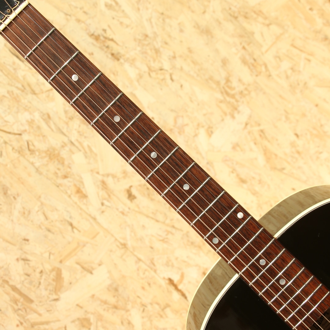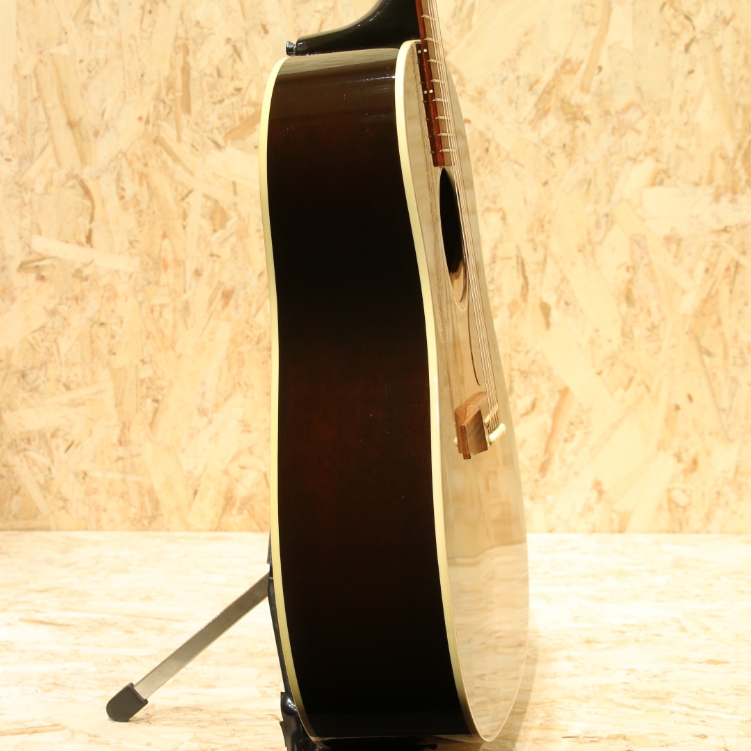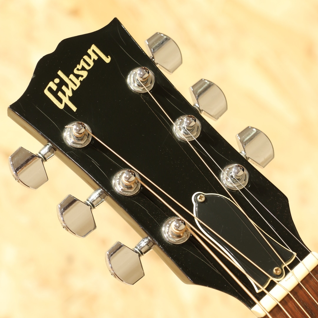 世界中のミュージシャンが愛用するギブソンフラットトップの銘器。本器は発売当時からの伝統的なスタイルを踏襲しながら、時代ごとのニーズに合わせた仕様変更を繰り返し製造を続けている"J-45 VS"。2008年製USED品です。シトカスプルーストップ、マホガニーサイド&バック、マホガニーネック、ローズウッド指板&ブリッジ、GOTHO製クロームペグ、MOP指板ドット、べっ甲柄スモールガード、スキャロップド・Xブレイシング、ビンテージサンバーストフィニッシュ、後付けにてL.R.Baggs Lyric ピックアップ搭載。ワーキングホースの2つ名の通り、ダイナミックなストロークからフィンガープレイまで幅広く応えてくれるオールラウンドな1本。スムーズな運指をフォローする丸みを帯びた指板サイド処理などこだわりのスペック、ダイナミックレンジの広いサウンドメイクなど様々な工夫を凝らした現代仕様の1本です。1942年の発売から80年ほどのあいだ数々のマイナーチェンジがなされましたが、基本的なスタイルは不変です。ブライトで気っ風の良いレスポンス、ドライでどこか泥臭さを感じさせる倍音、外観と違わぬ荒削りなサウンド。やはり歌モノで弾きたくなるギターです。後付けにてL.R Baggs Lyricを搭載。ボディ内部に内蔵されたマイクによって収音し、ボディ内の空気を拾い上げるシステム。箱全体で響くところを拾うので生の響きに近い音色を出力できるシステムです。ガランとした響きやボワっと膨らむ出方はマイク特有。弾き語りやアコースティックの小編成のライブなどで本領を発揮。ステージやレコーディングで即戦力として活躍が期待できます。ボディトップ6弦側から1弦側にかけて当てキズが散見され特に1弦側に纏まっている当てキズ、サイド6弦側くびれ部と1弦側ボトム部には米粒程の当てキズ、バック面にはバックルキズの様な擦れた後が上部に、下部には米粒に満たない当てキズが3ヵ所と数々のステージを超えたであろう歴戦のオーラが滲み出ている本器。表面上の使用感こそ多いもののネック・プレイコンディション共に良好で、まだまだこれからも働いてくれるワークホースです。発表以来、数々の名演を支えてきた"J-45"、移りゆく時代の中でも変わらぬ憧れが今なお此処にあります。オリジナルハードケース付属致します。