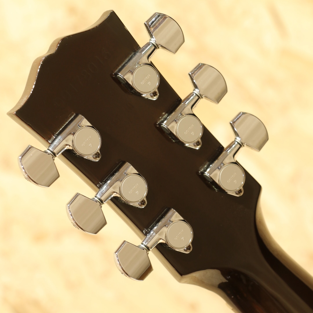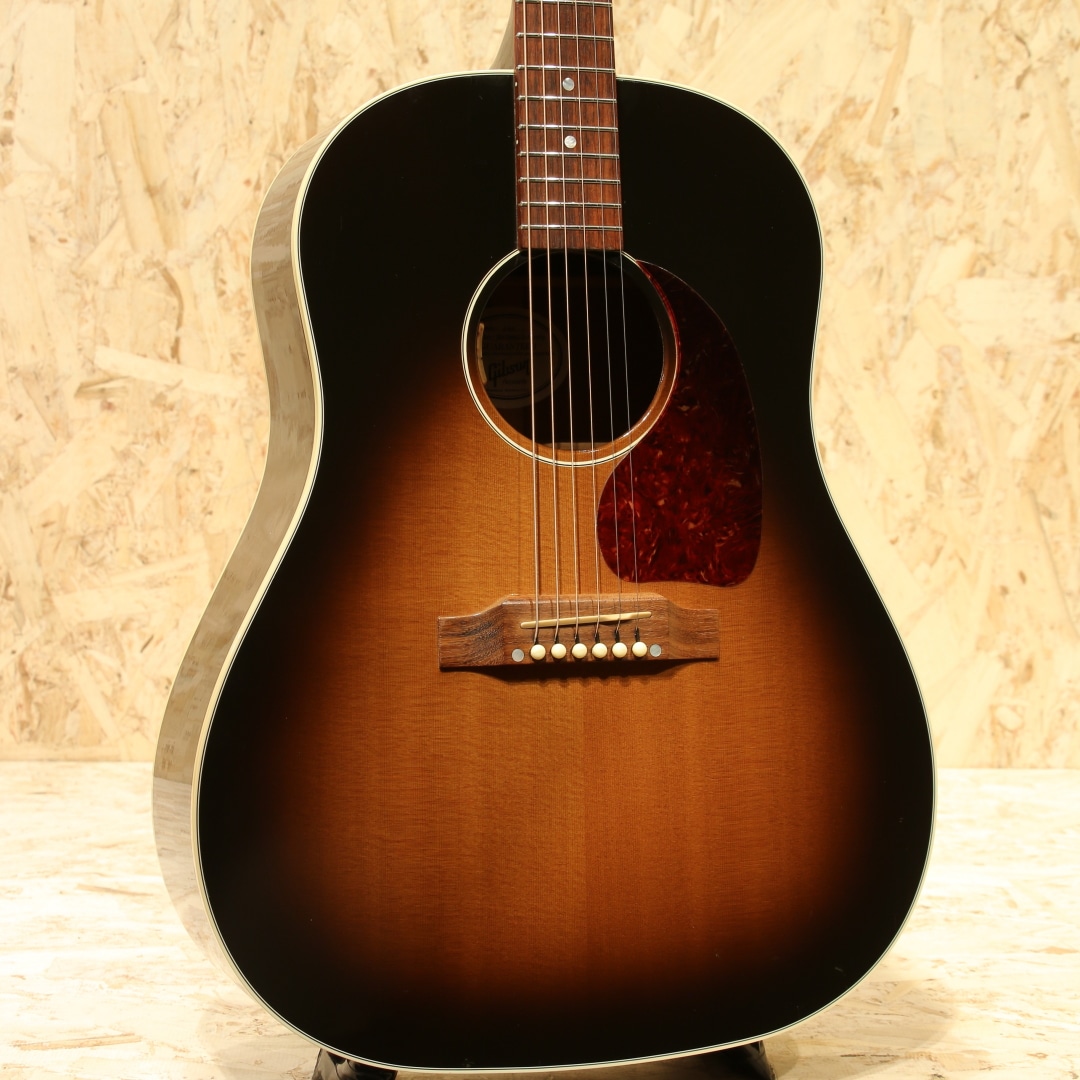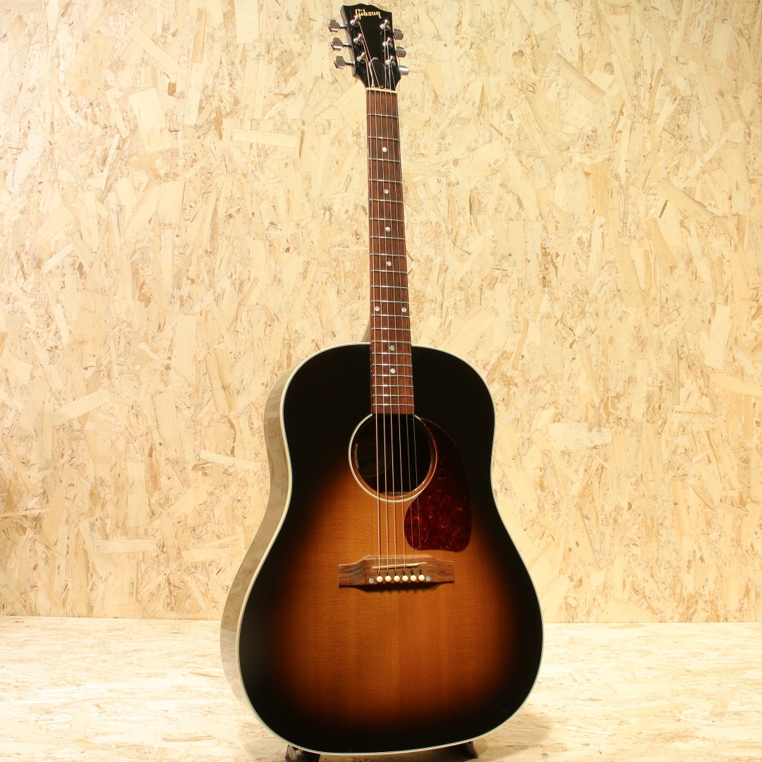 世界中のミュージシャンが愛用するギブソンフラットトップの銘器。本器は発売当時からの伝統的なスタイルを踏襲しながら、時代ごとのニーズに合わせた仕様変更を繰り返し製造を続けている"J-45 VS"。2008年製USED品です。シトカスプルーストップ、マホガニーサイド&バック、マホガニーネック、ローズウッド指板&ブリッジ、GOTHO製クロームペグ、MOP指板ドット、べっ甲柄スモールガード、スキャロップド・Xブレイシング、ビンテージサンバーストフィニッシュ、後付けにてL.R.Baggs Lyric ピックアップ搭載。ワーキングホースの2つ名の通り、ダイナミックなストロークからフィンガープレイまで幅広く応えてくれるオールラウンドな1本。スムーズな運指をフォローする丸みを帯びた指板サイド処理などこだわりのスペック、ダイナミックレンジの広いサウンドメイクなど様々な工夫を凝らした現代仕様の1本です。1942年の発売から80年ほどのあいだ数々のマイナーチェンジがなされましたが、基本的なスタイルは不変です。ブライトで気っ風の良いレスポンス、ドライでどこか泥臭さを感じさせる倍音、外観と違わぬ荒削りなサウンド。やはり歌モノで弾きたくなるギターです。後付けにてL.R Baggs Lyricを搭載。ボディ内部に内蔵されたマイクによって収音し、ボディ内の空気を拾い上げるシステム。箱全体で響くところを拾うので生の響きに近い音色を出力できるシステムです。ガランとした響きやボワっと膨らむ出方はマイク特有。弾き語りやアコースティックの小編成のライブなどで本領を発揮。ステージやレコーディングで即戦力として活躍が期待できます。ボディトップ6弦側から1弦側にかけて当てキズが散見され特に1弦側に纏まっている当てキズ、サイド6弦側くびれ部と1弦側ボトム部には米粒程の当てキズ、バック面にはバックルキズの様な擦れた後が上部に、下部には米粒に満たない当てキズが3ヵ所と数々のステージを超えたであろう歴戦のオーラが滲み出ている本器。表面上の使用感こそ多いもののネック・プレイコンディション共に良好で、まだまだこれからも働いてくれるワークホースです。発表以来、数々の名演を支えてきた"J-45"、移りゆく時代の中でも変わらぬ憧れが今なお此処にあります。オリジナルハードケース付属致します。