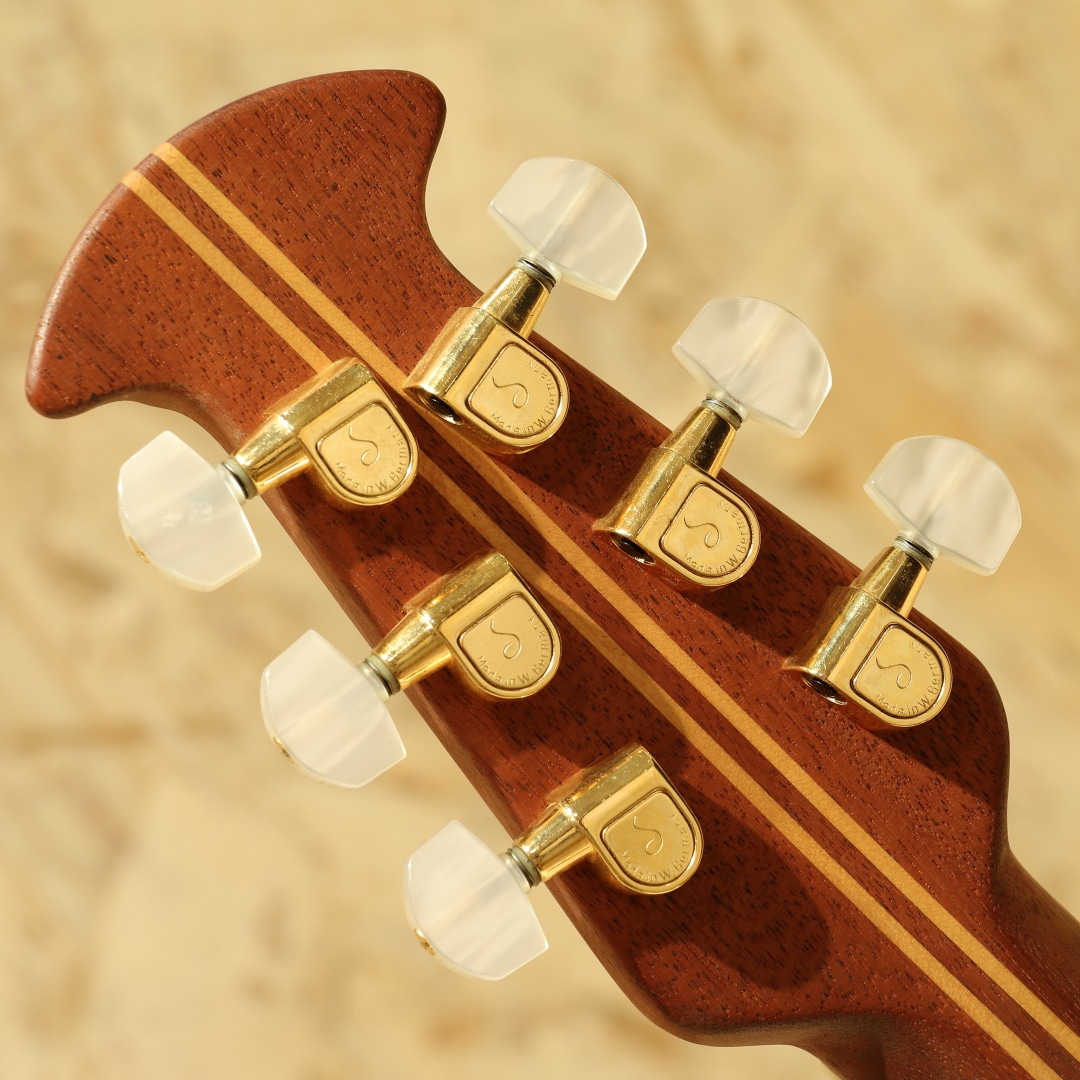 1966年、ヘリコプターの製造会社の社長であり、有名なギタリストでもあったチャールズ・カーマンによって設立されたオベーションは航空機の技術をギターに活かしたエレクトリックアコースティックギターを発売。保守的なミュージシャンにも受け入れられ、エレアコの代名詞的ブランドへと成長します。本器はディープボウル、センターサウンドホールのルックスが特徴的な"Custom Legend"。スプルーストップ、リラコード樹脂製ディープボウルカッタウェイ、マホガニーネック、エボニー指板、ウォルナットブリッジ、パーロイドボタンのゴールドシャーラーペグ、サンバーストフィニッシュ、不動の人気を誇るOP24プリアンプはシンプルイズベストの決定版プリアンプ。3バンドEQ、1ボリュームノブを備えた特有のラインサウンドを生み出します。コンプ感のある独特の音色はオベーションギターならではの味わい。深胴からなる奥深い満足な量の生鳴りを得られる点が今なお人気のある理由です。彫刻入りブリッジ、ゴールドパーツ、アバロン装飾など上位グレードらしい美しいルックスも魅力の1つです。ロゼッタデザインも塗装上のチェッキングは見られるものの欠損は無くきれいに残っています。トップ面に2カ所僅かな打痕、ロゼッタリングに所々空気が入って白っぽく見える箇所が確認できますが、30年強の経過を思えば大変美しいコンディションをキープした本器。ネックコンディションも良好、オベーションらしく弾きやすいプレイアビリティで激しく刻むカッティング、ザクザク鳴らすストロークから爪弾くアルペジオまでバーサタイルな1本。是非ご検討ください。オリジナルハードケースが付属します。