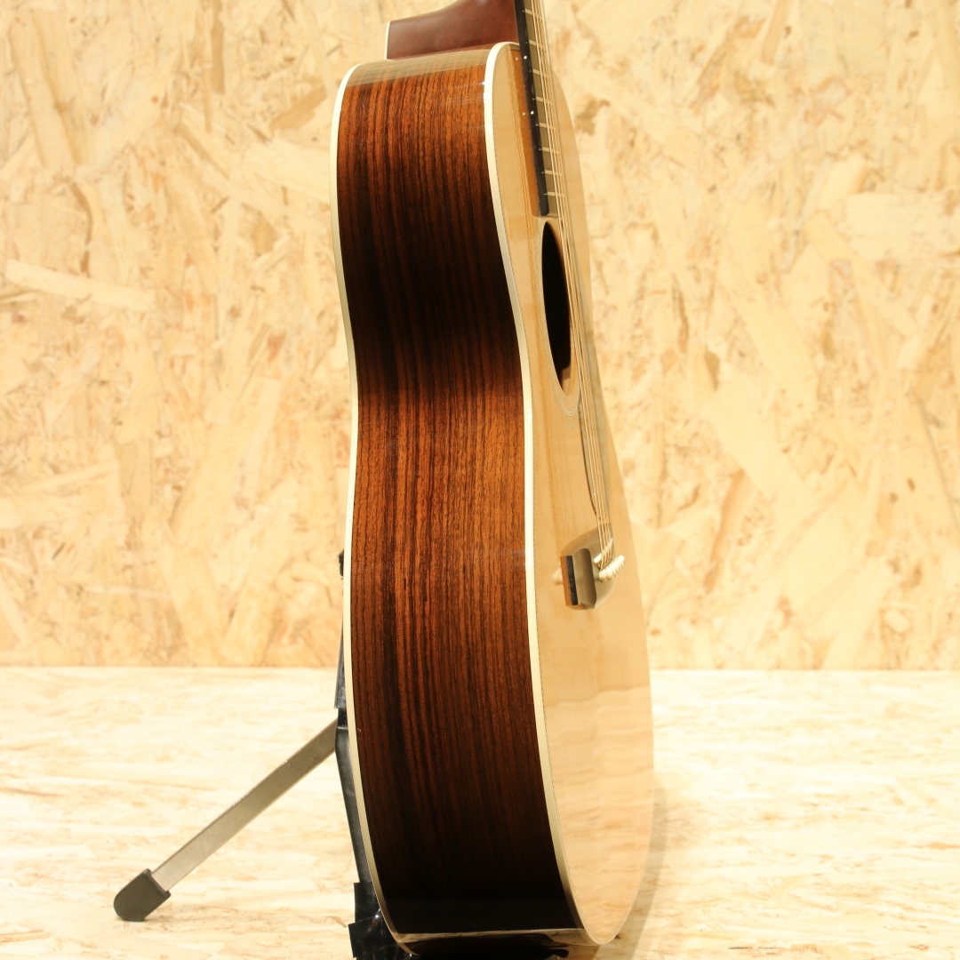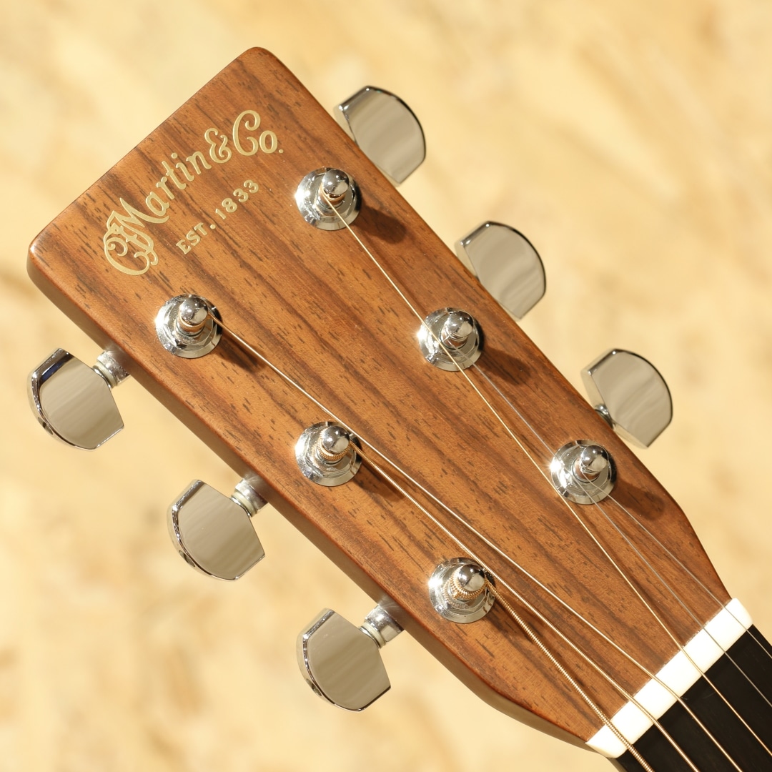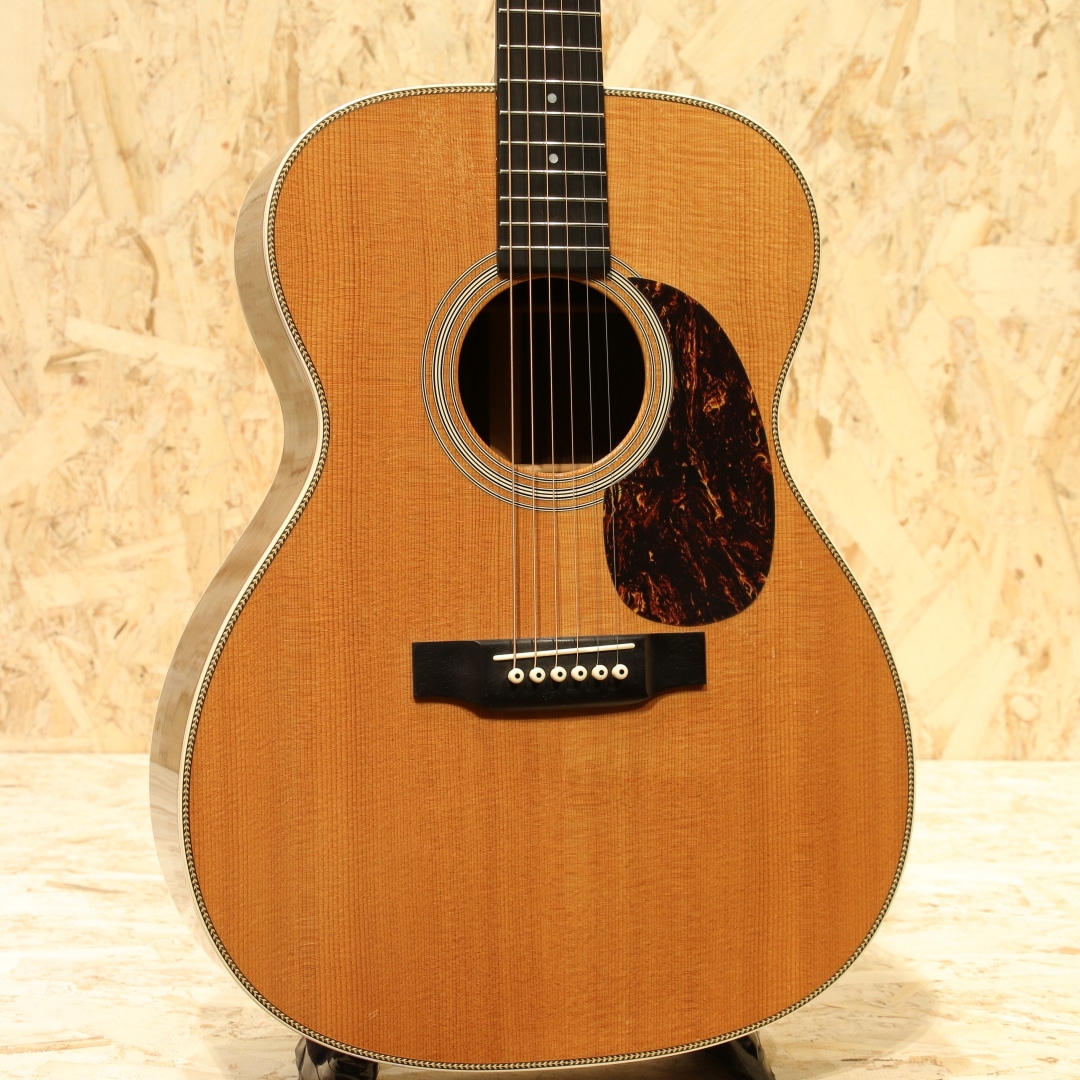 今やワールドスタンダードとなっている"D-28"と並びマーチンを代表するもうひとつの顔的モデル、トリプルオーサイズのロングセラーモデル"OOO-28"。本器はヘリンボーンを備えたルックスの2001年製USED品。シトカスプルーストップ、ローズウッドサイド&バック、エボニー指板&ブリッジ、シャーラーロトマチックペグ、ADJロッド、MOP指板ドット、ブラックピックガード、チェッカーフラッグバックストリップ、スキャロップドXブレイシング。OOO-28は2018年に大きく仕様が変わり、よりオールドテイストを取り入れた姿へと変化しました。2025年にも細やかな個所が変更されゴールデンエラ期に近づいた特徴を与えられています。本器はそれらの変更が入る前の旧仕様。現行品では標準でヘリンボーンが入っていますが、この当時はヴィンテージタイプのみでした。やはりヘリンボーンが入るだけでデザインが引き締まりクールな印象を受けます。ナット幅は現行品と異なり42.9mm、ブレイシングはノンスキャロップ、ペグはグローバーのロトマチックタイプ。現行品のナット幅が広く握り込みにくいと感じられる方には一度体感して欲しいネック、親指を使った押弦にも対応しやすいグリップ。この仕様を探している方が一定数おられることにも納得です。スキャロップドブレイシングとなったことで空気感を含んだふくよかなトーンを獲得。柔軟な音色を持ち包容力を感じさせる響きを持っています。ペグ自体も比較的重量がある為に重たい響きとスーッと伸びるサスティーンを生み出しやすく、音を切る、伸ばすの加減も演奏者次第。自分が思い描く演奏へ応えてくれるであろう世界のスタンダードモデル。プレイスタイルも特段選ばず、ストロークでのパワフルなサウンド、フィンガーでの繊細な響きを堪能できる1本です。後付けにてアクティブタイプのアンダーサドルピエゾを搭載。音の芯を捉えたサウンド、輪郭感のある響きを出力し、立ち上がりの速さも充分なシステム。アクティブタイプの為出力を稼げており、扱いやすさも良しです。コントローラーはなく、繋ぐだけのシンプルな操作性。すぐに演奏を始められるピックアップとなっています。ボディトップ下部に極僅かな膨らみの跡が見られ、トップ面各所にピックや爪が当たったであろう細かな当てキズや弾きキズ、ボディ全体に見られる極々薄い擦れキズ、ネック裏が若干テカっている箇所など見られますが、年式を考えると比較的キレイなコンディションをキープ。ネック周りの演奏性は整えられており、トラスロッドの回し幅も残され、サドル残も残されている個体です。マーチンを代表するモデルの1つ、もう一つのワールドスタンダードとも言える28です。現行品のナット幅が合わなかった方には是非一度お試し頂きたい1本。是非ご検討下さいませ。