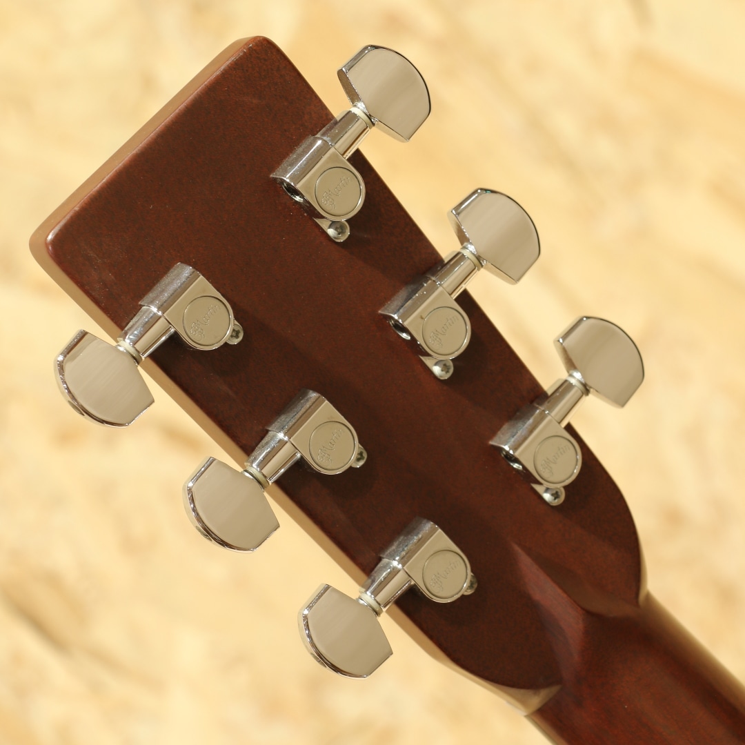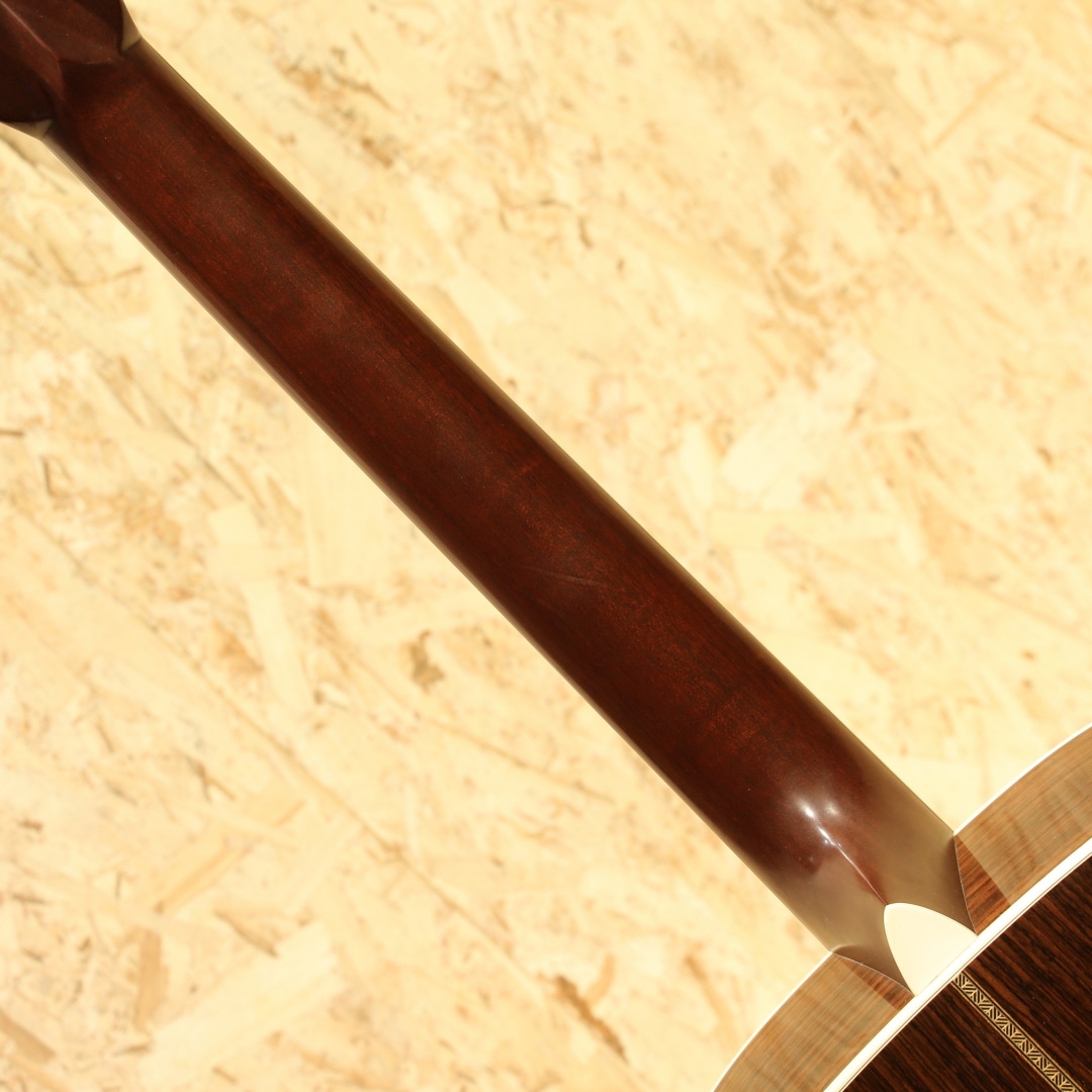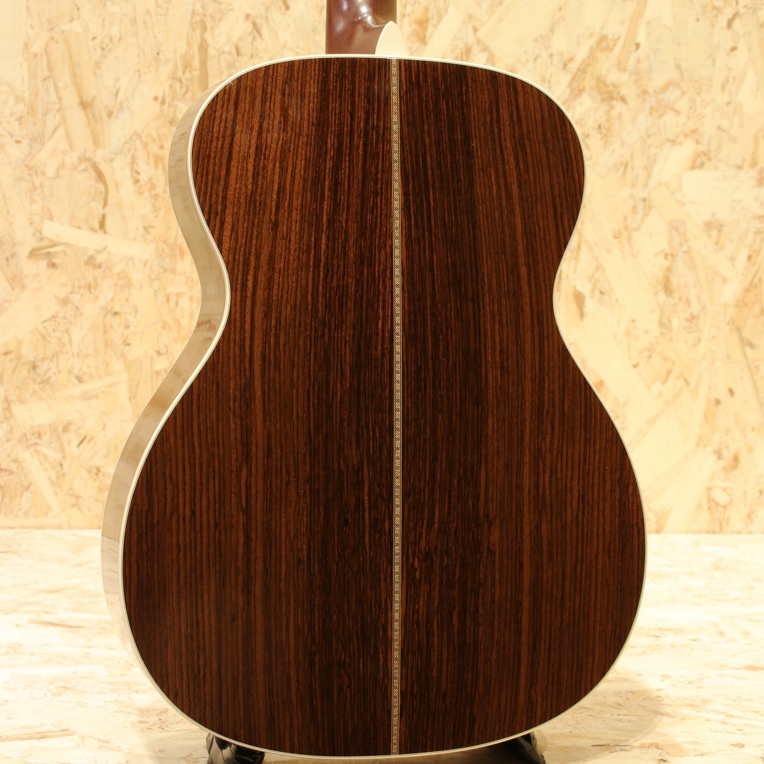 今やワールドスタンダードとなっている"D-28"と並びマーチンを代表するもうひとつの顔的モデル、トリプルオーサイズのロングセラーモデル"OOO-28"。本器はヘリンボーンを備えたルックスの2001年製USED品。シトカスプルーストップ、ローズウッドサイド&バック、エボニー指板&ブリッジ、シャーラーロトマチックペグ、ADJロッド、MOP指板ドット、ブラックピックガード、チェッカーフラッグバックストリップ、スキャロップドXブレイシング。OOO-28は2018年に大きく仕様が変わり、よりオールドテイストを取り入れた姿へと変化しました。2025年にも細やかな個所が変更されゴールデンエラ期に近づいた特徴を与えられています。本器はそれらの変更が入る前の旧仕様。現行品では標準でヘリンボーンが入っていますが、この当時はヴィンテージタイプのみでした。やはりヘリンボーンが入るだけでデザインが引き締まりクールな印象を受けます。ナット幅は現行品と異なり42.9mm、ブレイシングはノンスキャロップ、ペグはグローバーのロトマチックタイプ。現行品のナット幅が広く握り込みにくいと感じられる方には一度体感して欲しいネック、親指を使った押弦にも対応しやすいグリップ。この仕様を探している方が一定数おられることにも納得です。スキャロップドブレイシングとなったことで空気感を含んだふくよかなトーンを獲得。柔軟な音色を持ち包容力を感じさせる響きを持っています。ペグ自体も比較的重量がある為に重たい響きとスーッと伸びるサスティーンを生み出しやすく、音を切る、伸ばすの加減も演奏者次第。自分が思い描く演奏へ応えてくれるであろう世界のスタンダードモデル。プレイスタイルも特段選ばず、ストロークでのパワフルなサウンド、フィンガーでの繊細な響きを堪能できる1本です。後付けにてアクティブタイプのアンダーサドルピエゾを搭載。音の芯を捉えたサウンド、輪郭感のある響きを出力し、立ち上がりの速さも充分なシステム。アクティブタイプの為出力を稼げており、扱いやすさも良しです。コントローラーはなく、繋ぐだけのシンプルな操作性。すぐに演奏を始められるピックアップとなっています。ボディトップ下部に極僅かな膨らみの跡が見られ、トップ面各所にピックや爪が当たったであろう細かな当てキズや弾きキズ、ボディ全体に見られる極々薄い擦れキズ、ネック裏が若干テカっている箇所など見られますが、年式を考えると比較的キレイなコンディションをキープ。ネック周りの演奏性は整えられており、トラスロッドの回し幅も残され、サドル残も残されている個体です。マーチンを代表するモデルの1つ、もう一つのワールドスタンダードとも言える28です。現行品のナット幅が合わなかった方には是非一度お試し頂きたい1本。是非ご検討下さいませ。