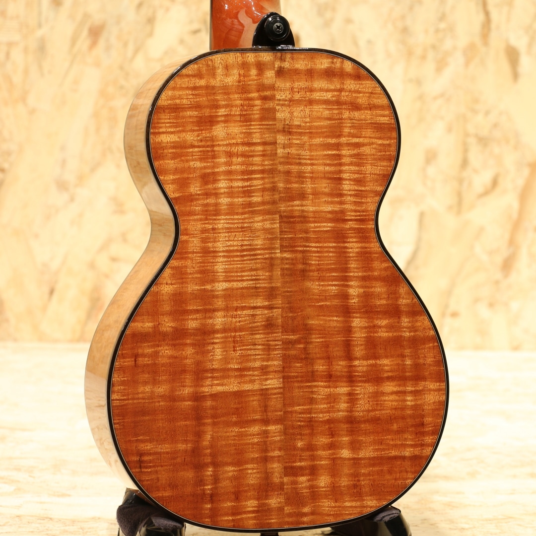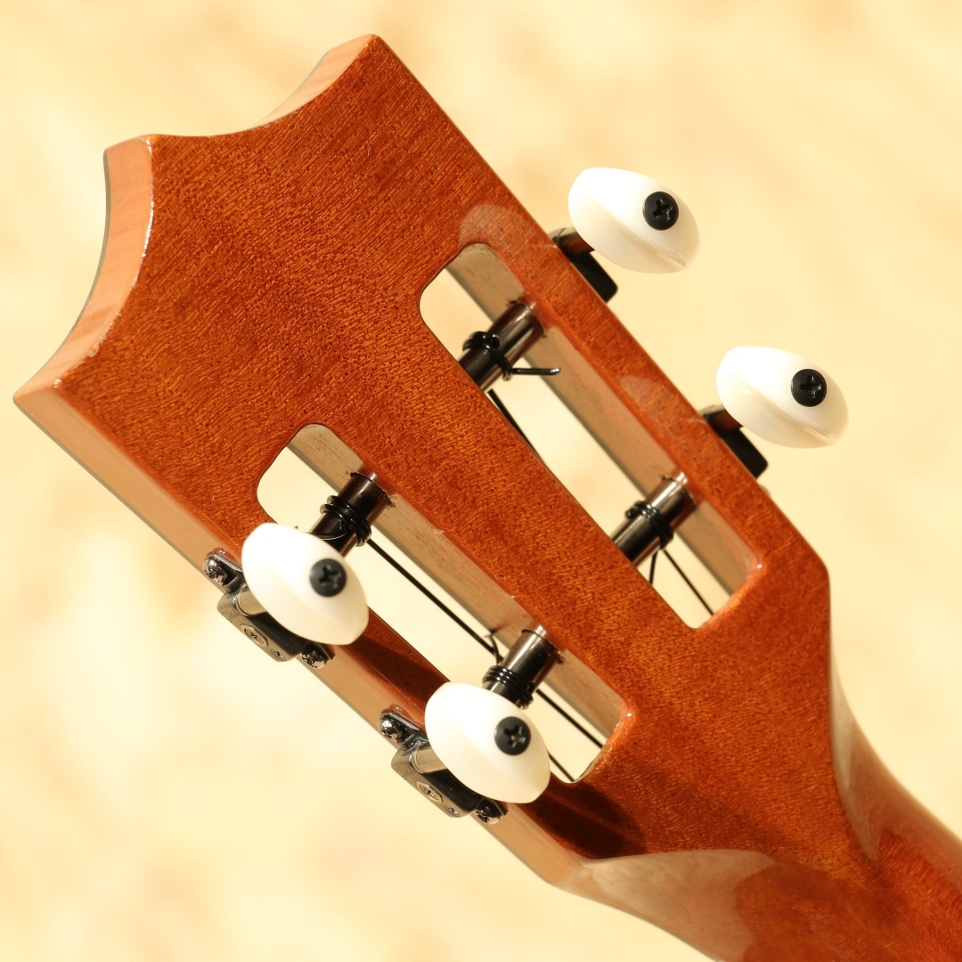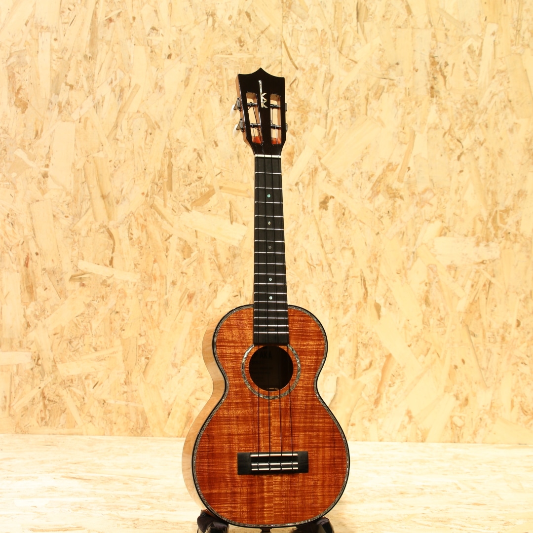 1916年よりの創業以来、ハワイアンウクレレブランドのトップを走り続けるカマカ。ジェイクシマブクロ氏を始め、数えきれないほどのプロアマミュージシャンが愛用する信頼度の高い老舗ブランドです。本器はカマカウクレレのラインナップの中でも最上級とも言えるスロテッドヘッド仕様のデラックスコンサートモデル"HF2 D2I"。2020年製USED品。杢目の美しいフィギャードハワイアンコアをボディ材に使用。マホガニーネック、エボニー指板&ブリッジ、ウッドバインディング、ヘッドトップにはアバロンシェルのKKマーク、ペグボタンのみホワイトカラーに変更された小型で軽量なゴトー製ステルスペグ搭載、ボディートップに採用された色目の濃い上品なアバロンパーフリング&ロゼッタ装飾が非常に美しくこの上無い程の高級感を味わうことができます。コンサートサイズで扱い易く、カマカらしい太く甘いトーン。スロテッドヘッドの効果もありしっかりとしたテンション感にサイズを超えたやや広めのレンジ感、輪郭の明瞭さが際立ったサウンドです。優しく爪弾く演奏から激しいストラミングプレイまで幅広いプレイスタイルにしっかりと対応。ピックアップには後付けにて定評のあるアンダーサドルピエゾシステム、L.R.Baggs Five.Oが搭載。ボタン電池駆動のアクティブ仕様、パワーがありながらウクレレらしい柔らかく暖かみのあるトーンをナチュラルにアウトプットします。コントローラーはサウンドホール縁に取り付けられた1vol.のみと大変シンプルな操作性で芯のあるラインサウンドをアウトプットし、演奏の幅を広げます。ヘッドに僅かな打痕があるのが惜しいですが、その他は光にかざせば視認できる程度の表面上の拭きキズが見られる程度と大変綺麗な状態が保たれています。ネック周りやプレイコンディションも良好、オールジャンルで扱える演奏性抜群な1本です。本場ハワイ老舗ブランドの上位機種、是非ご体感下さい。オリジナルハードケースが付属します。