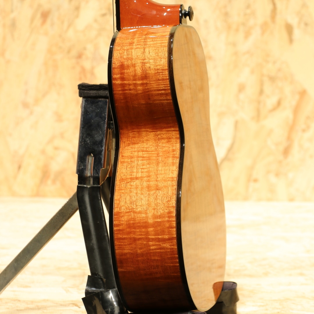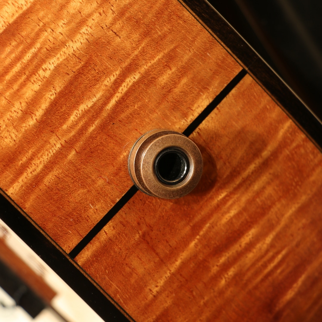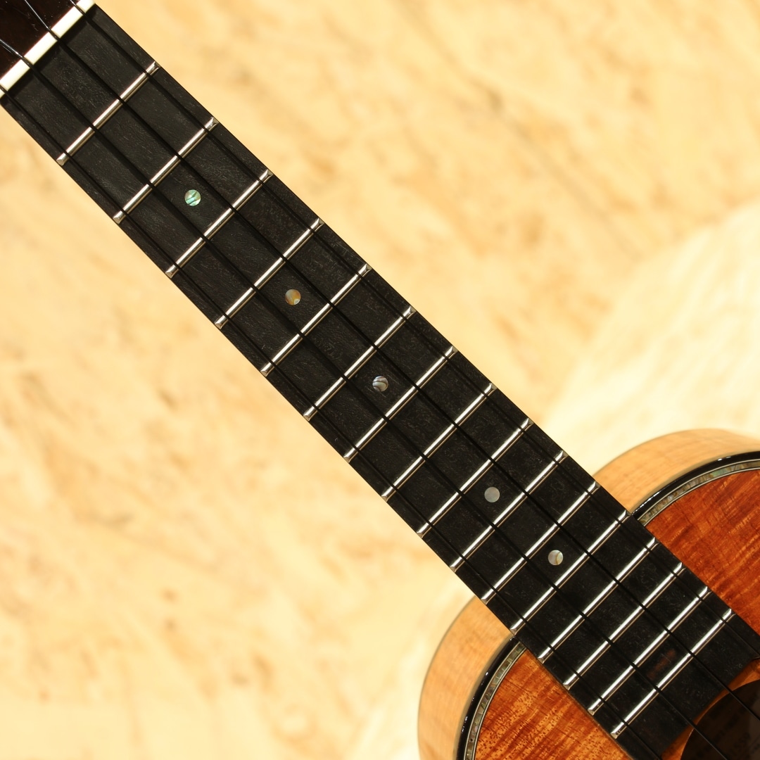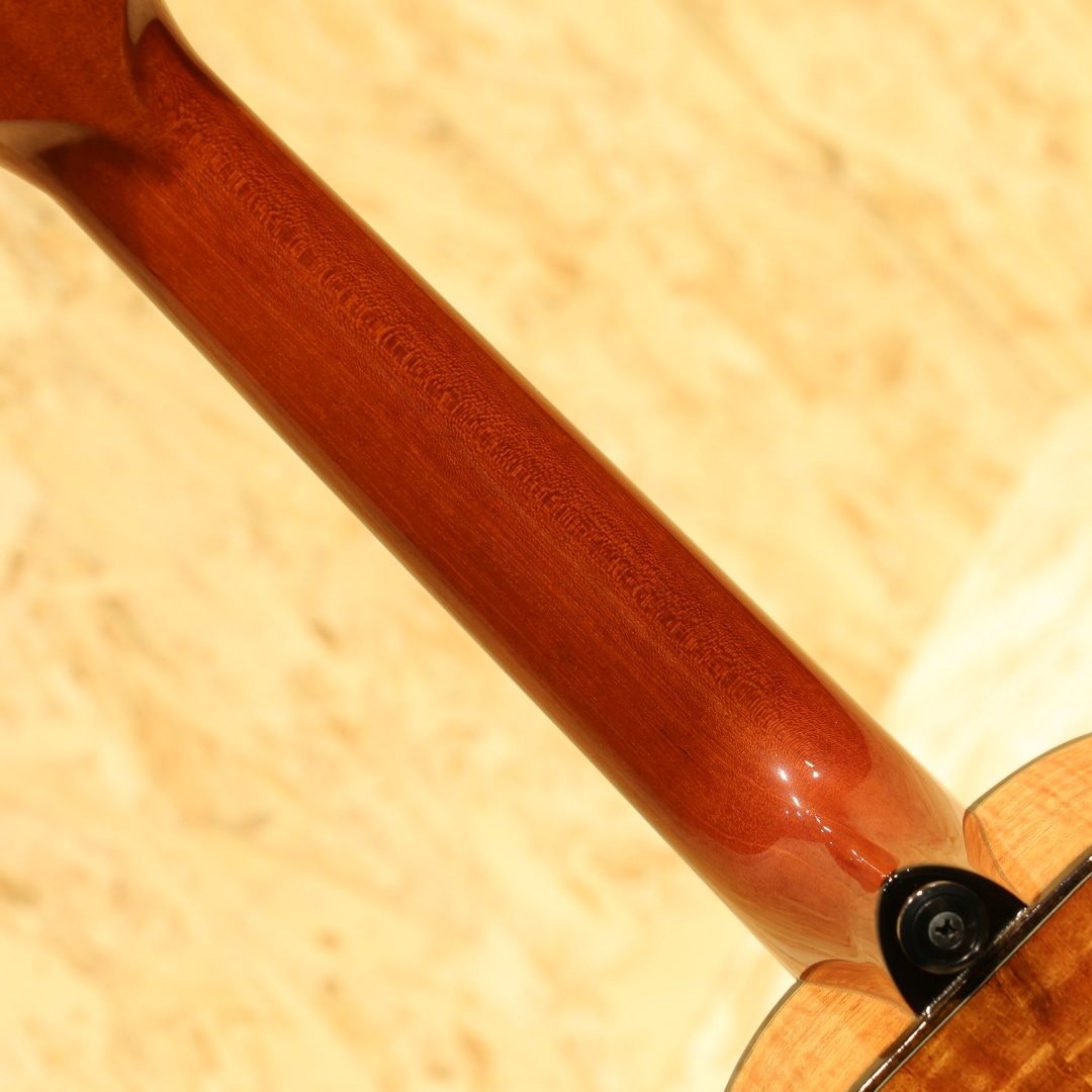 1916年よりの創業以来、ハワイアンウクレレブランドのトップを走り続けるカマカ。ジェイクシマブクロ氏を始め、数えきれないほどのプロアマミュージシャンが愛用する信頼度の高い老舗ブランドです。本器はカマカウクレレのラインナップの中でも最上級とも言えるスロテッドヘッド仕様のデラックスコンサートモデル"HF2 D2I"。2020年製USED品。杢目の美しいフィギャードハワイアンコアをボディ材に使用。マホガニーネック、エボニー指板&ブリッジ、ウッドバインディング、ヘッドトップにはアバロンシェルのKKマーク、ペグボタンのみホワイトカラーに変更された小型で軽量なゴトー製ステルスペグ搭載、ボディートップに採用された色目の濃い上品なアバロンパーフリング&ロゼッタ装飾が非常に美しくこの上無い程の高級感を味わうことができます。コンサートサイズで扱い易く、カマカらしい太く甘いトーン。スロテッドヘッドの効果もありしっかりとしたテンション感にサイズを超えたやや広めのレンジ感、輪郭の明瞭さが際立ったサウンドです。優しく爪弾く演奏から激しいストラミングプレイまで幅広いプレイスタイルにしっかりと対応。ピックアップには後付けにて定評のあるアンダーサドルピエゾシステム、L.R.Baggs Five.Oが搭載。ボタン電池駆動のアクティブ仕様、パワーがありながらウクレレらしい柔らかく暖かみのあるトーンをナチュラルにアウトプットします。コントローラーはサウンドホール縁に取り付けられた1vol.のみと大変シンプルな操作性で芯のあるラインサウンドをアウトプットし、演奏の幅を広げます。ヘッドに僅かな打痕があるのが惜しいですが、その他は光にかざせば視認できる程度の表面上の拭きキズが見られる程度と大変綺麗な状態が保たれています。ネック周りやプレイコンディションも良好、オールジャンルで扱える演奏性抜群な1本です。本場ハワイ老舗ブランドの上位機種、是非ご体感下さい。オリジナルハードケースが付属します。
