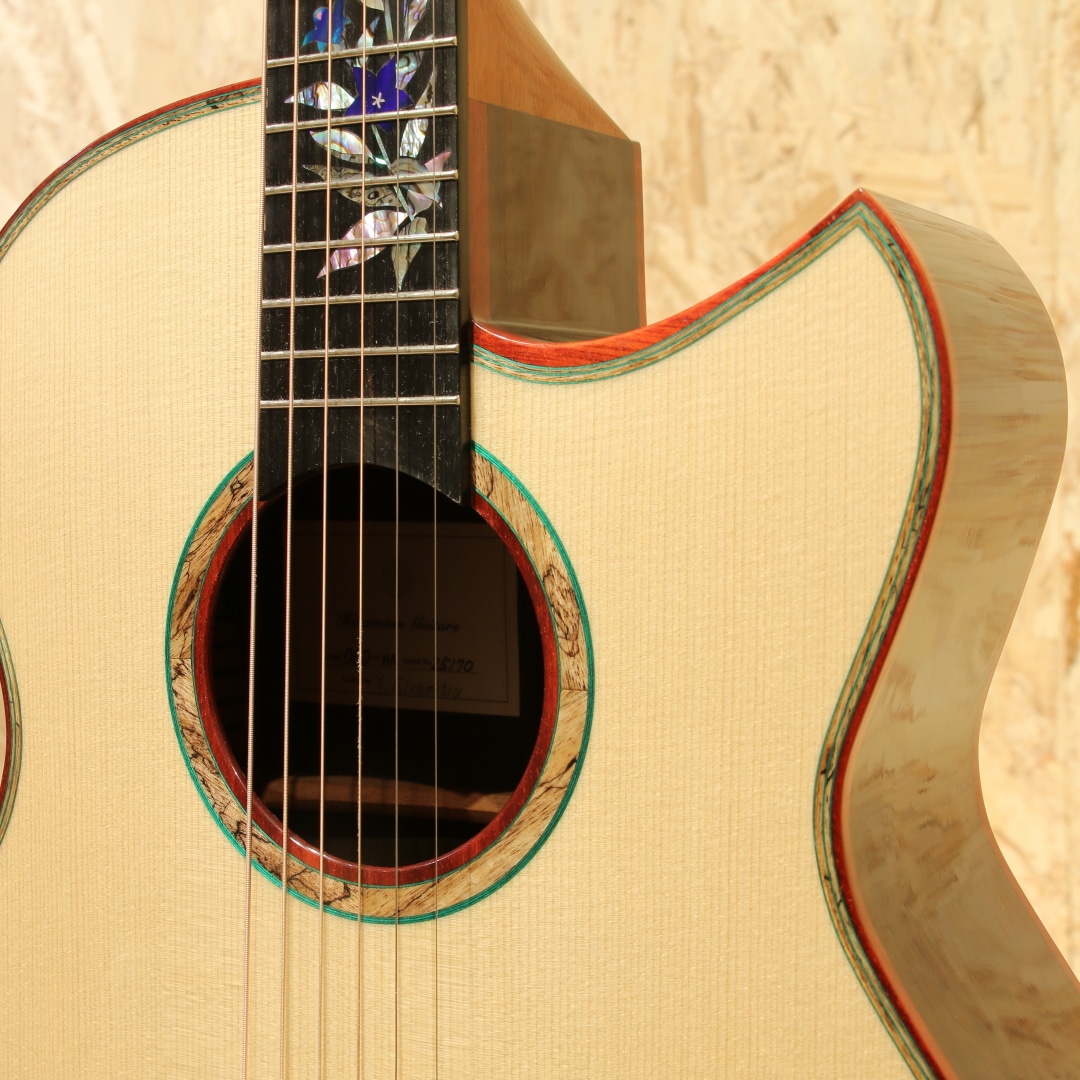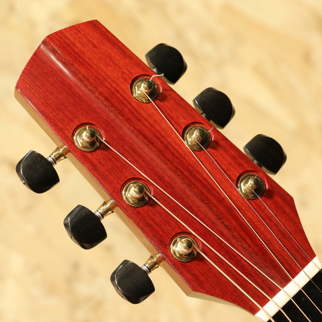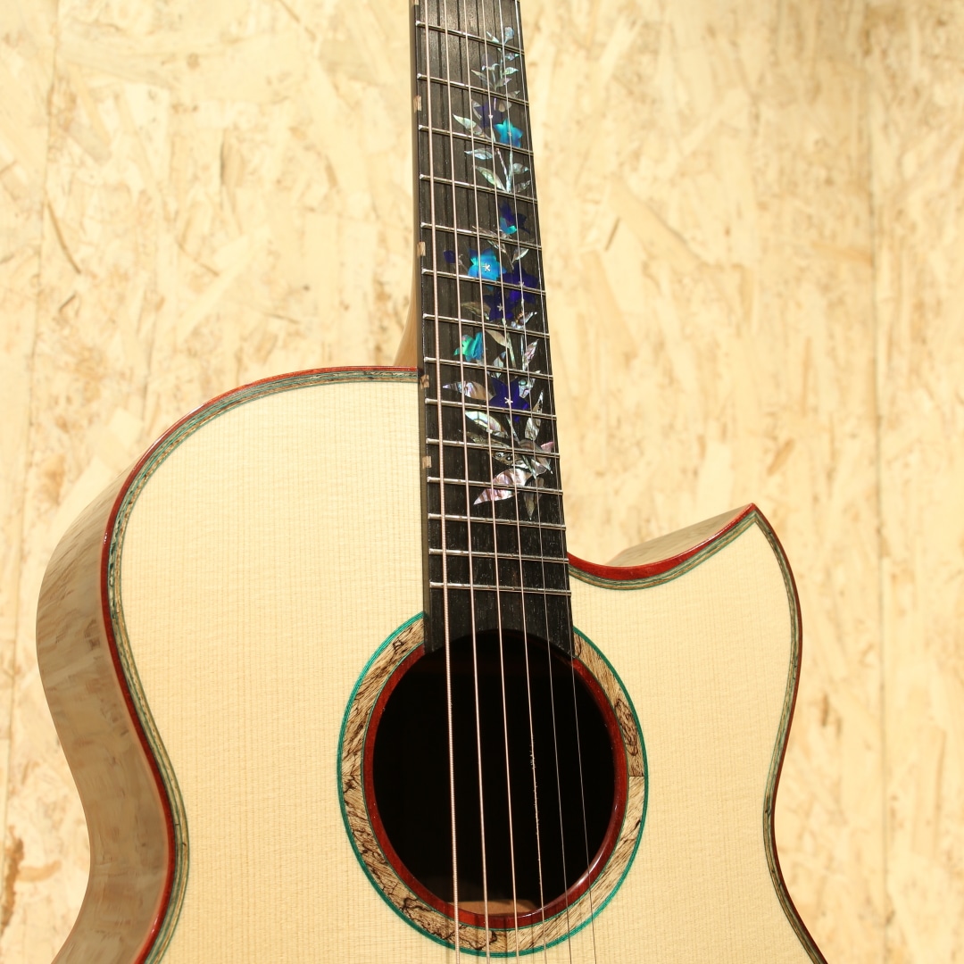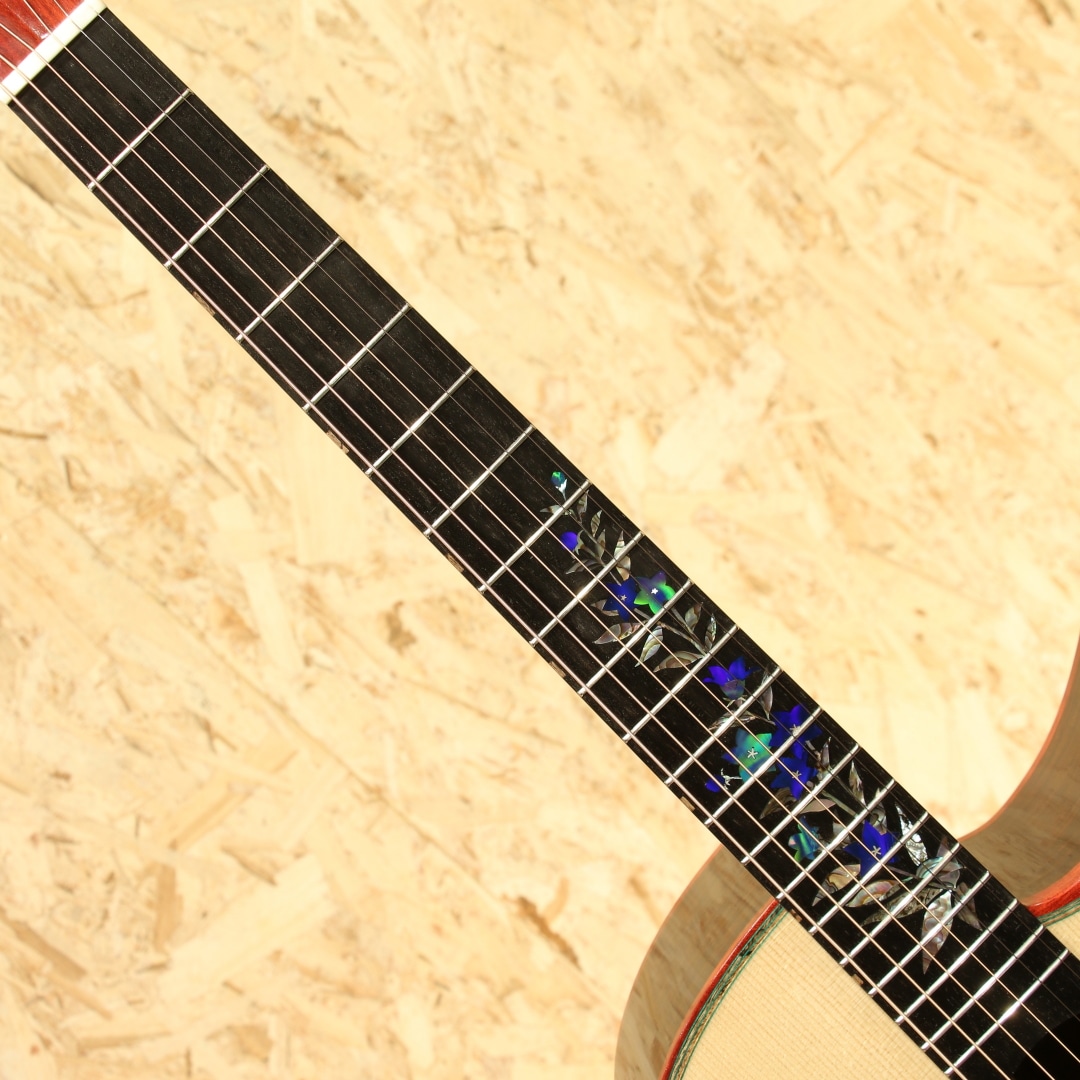 本器はOOOのカッタウェイをベースに作成されたモデル、ジョイントは14Fです。ドレッドより一回り小さく抱えやすいサイズでくびれも深いため、体にフィットします。やや余裕のある深さとフローレンタインカッタウェイを持つ1本。端正でぎっしり目が詰まった厳選のジャーマンスプルーストップ、近頃は少なくなったダークで杢目の整ったマダガスカルローズウッド、サイド&バック、ホンジュラスマホガニーネック、エボニー指板、4段構造にアーティスティックに彫り込まれたマダガスカルローズブリッジ、ゴトー製510ロトマチックペグ(ゴールドカラー、エボニーつまみ)、マンゴースポルテッドのパーフリング&ロゼッタ、バインディングはBlood Woodとも通称呼ばれる自然の赤が際立つSatine材。指板の7FRETから18にかけては桔梗をコンセプトにした小川氏がデザインをし、一つ一つ手作業で丁寧に手掛けられた貝や石を組み合わせた極上のインレイが施されています。