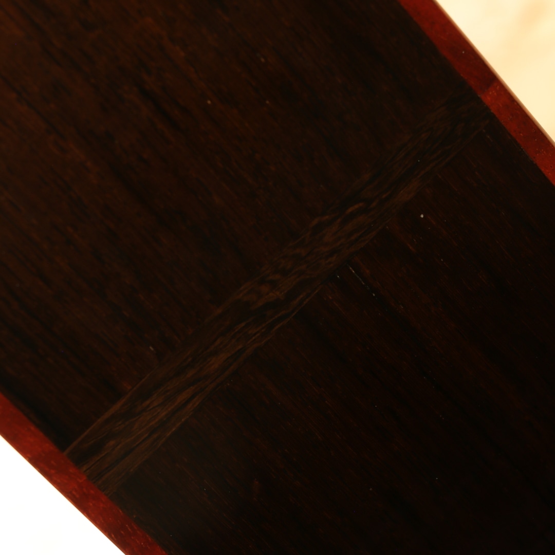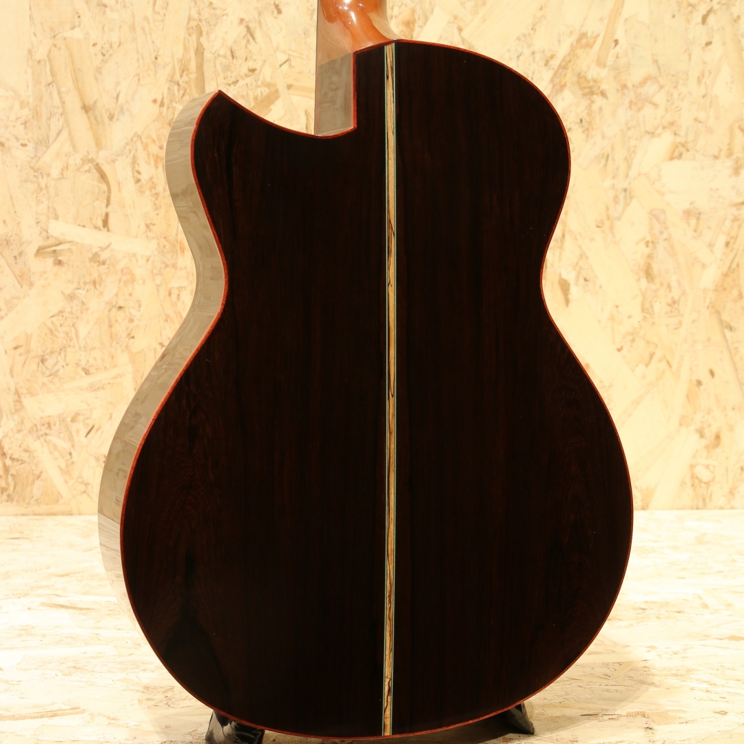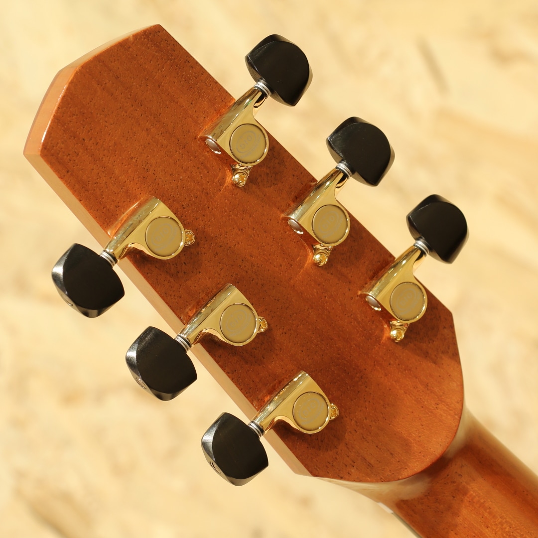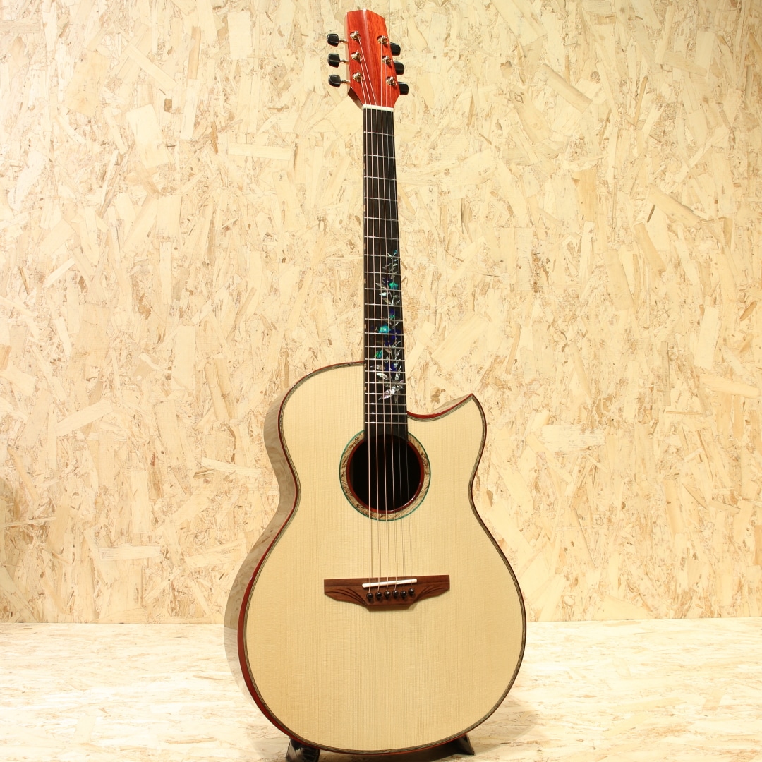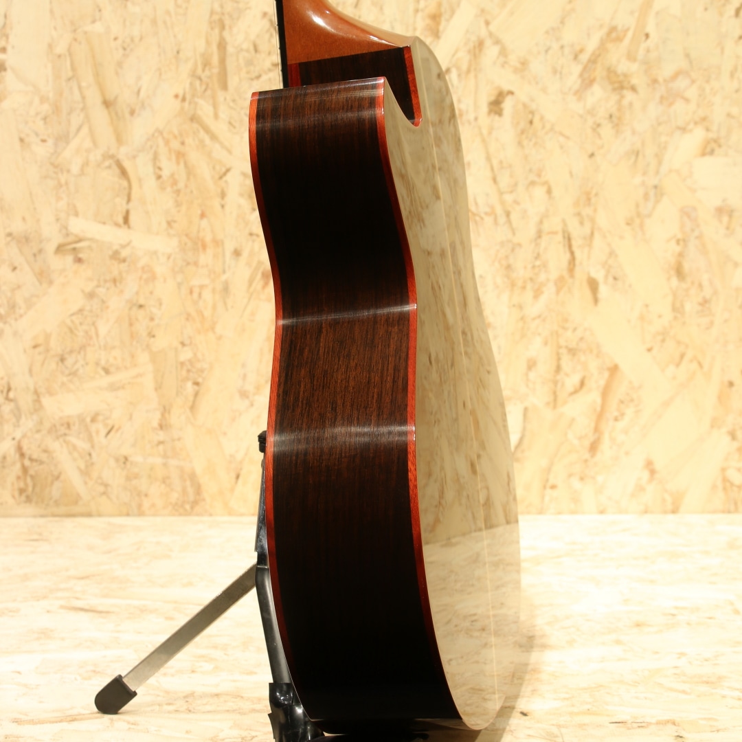 本器はOOOのカッタウェイをベースに作成されたモデル、ジョイントは14Fです。ドレッドより一回り小さく抱えやすいサイズでくびれも深いため、体にフィットします。やや余裕のある深さとフローレンタインカッタウェイを持つ1本。端正でぎっしり目が詰まった厳選のジャーマンスプルーストップ、近頃は少なくなったダークで杢目の整ったマダガスカルローズウッド、サイド&バック、ホンジュラスマホガニーネック、エボニー指板、4段構造にアーティスティックに彫り込まれたマダガスカルローズブリッジ、ゴトー製510ロトマチックペグ(ゴールドカラー、エボニーつまみ)、マンゴースポルテッドのパーフリング&ロゼッタ、バインディングはBlood Woodとも通称呼ばれる自然の赤が際立つSatine材。指板の7FRETから18にかけては桔梗をコンセプトにした小川氏がデザインをし、一つ一つ手作業で丁寧に手掛けられた貝や石を組み合わせた極上のインレイが施されています。