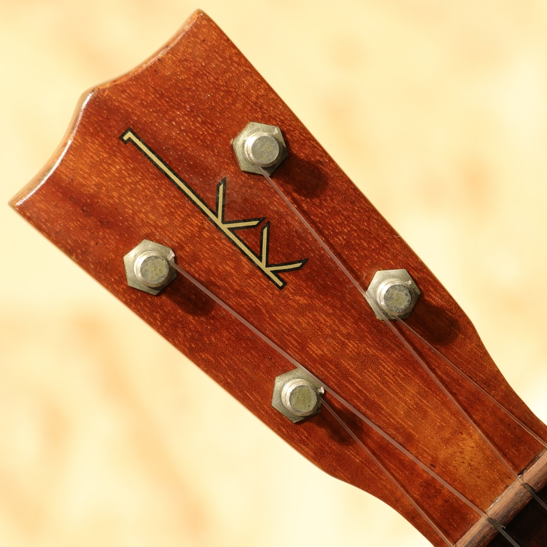 1916年、サミュエル・K・カマカによって創業された"カマカウクレレ"。熟練した職人技と徹底した品質管理を誇り、ハワイアンウクレレメーカーのトップブランドとして君臨し続ける人気ブランド。「If you make instruments and use the family name, don't make junk.(もし楽器を作って、家系の名前を付けるなら、ジャンク品は作るな)」という創業者の言葉通り、ハワイの文化の中で培われた職人達の技術と精神、徹底した品質管理より変わらない音を作り続け、100年以上経った現在も失われることなく受け継がれ多くのプレイヤーに愛されています。本器はゴールドラベルのソプラノモデル。仕様から1960年半ばから後期のものと推測されます。ハワイアンコアボディ、ハワイアンコアネック、ローズウッド指板&ブリッジ、デカールロゴ、フリクションペグ。伝統的なスタイルのソプラノサイズは小ぶりで抱えやすく、太くたっぷりとした音量。甘くコロンとした愛らしい響きとヴィンテージならではの軽快なサウンドは弾き手、聴き手を癒してくれます。1フレットネック裏、ネックヒールの継ぎ目箇所に亀裂の修正跡がありますが、しっかりとリペア済で問題なくご使用いただけます。4弦側のネックジョイント付近の塗装にやや剥離が見られ白く濁っていますが、外観上のみで演奏面への支障はございません。製造から約60年の経過の為、打痕や指板のへこみなど確認できますが、先述の割れを除けば大きく目立つ使用感は無く綺麗といえるコンディションが保たれています。僅かにネックの反りが見られ、少し高めな弦高設定ですがローポジションあたりでは難なく演奏いただけます。先述の理由の為、格安価格でのご案内となります。汎用ハードケースが付属します。