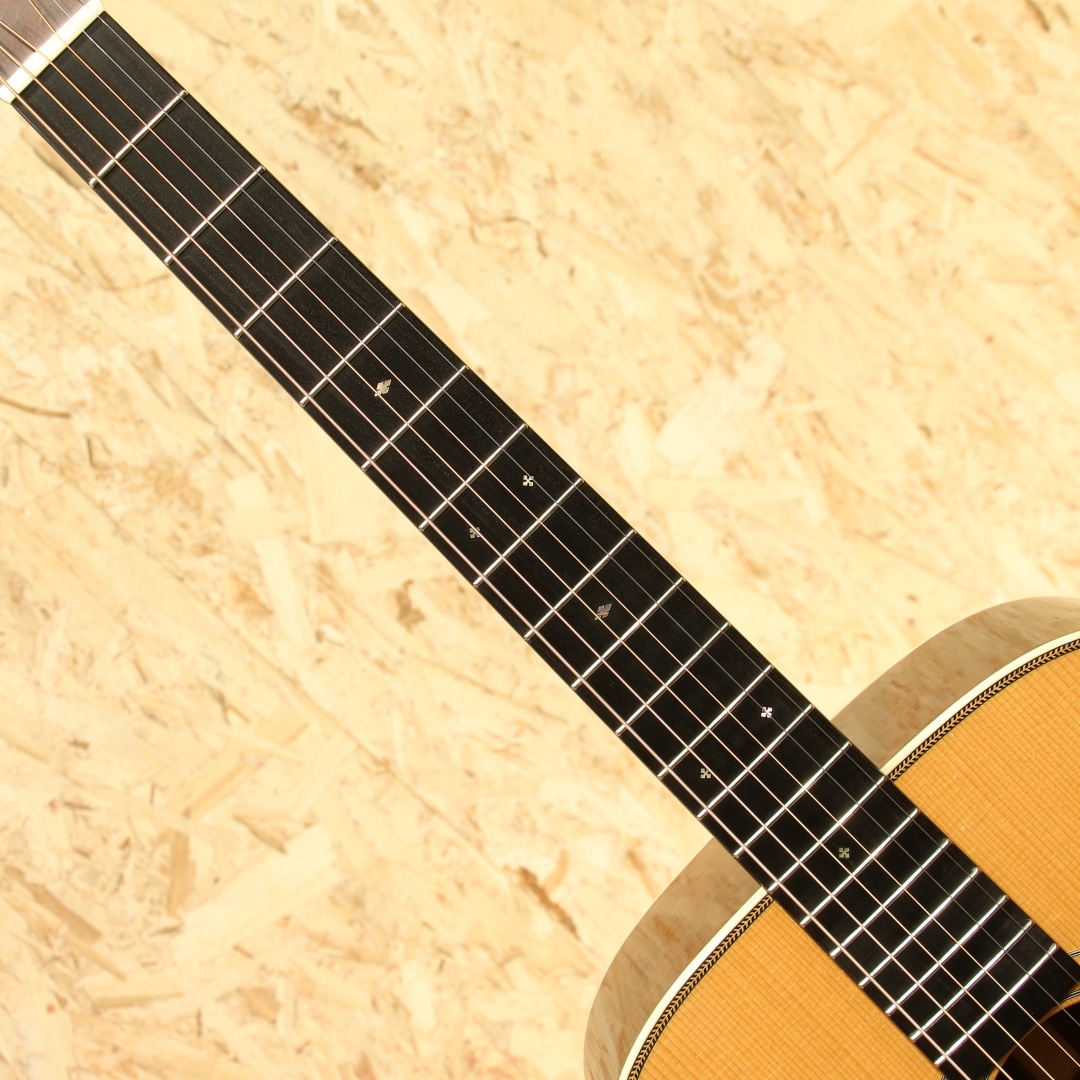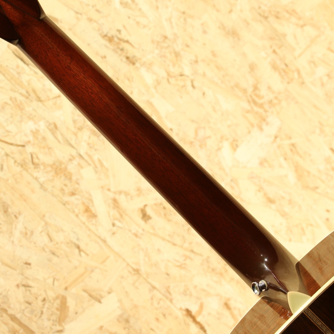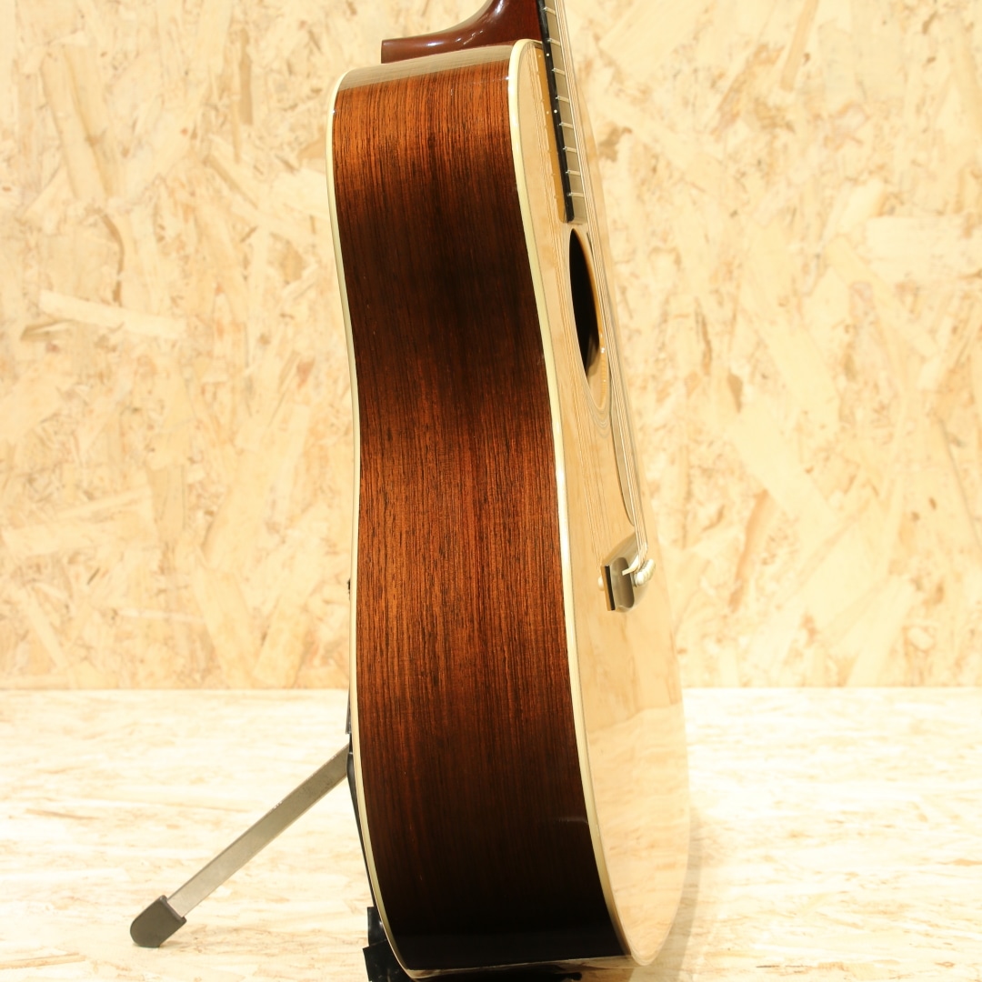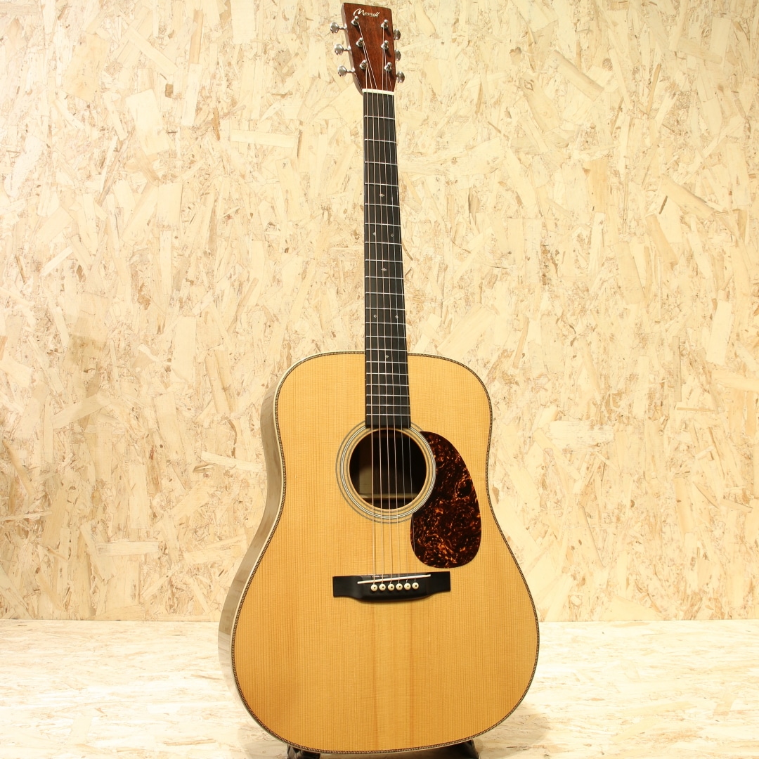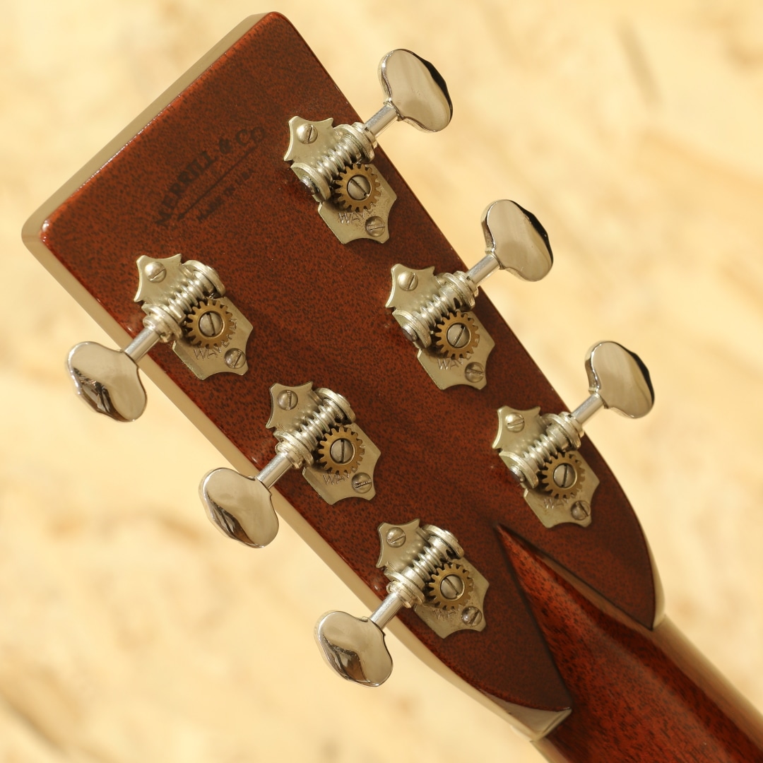 アメリカ、バージニア州にて製作される”Merrill”。ジム・メリルは1981年からリペアショップでリペア業に従事し、1983年に初めてギターを製作。それ以降も合間を縫って製作を続け2000年には自身のブランドを立ち上げ現在でも製作を行っています。そのリペアで培った知識を持ってプリウォーマーチンの再現モデルを製作、プリウォーマーチンレプリカの分野において人気を博し、ブルーグラス系ミュージシャンを筆頭に米国を中心に高い支持を得ています。近年は日本への入荷もほぼなく、流通が少なくなり入手が難しくなってきました。本器は王道のD28タイプ。2002年製作のUSED品。スプルーストップ、ホンジュラスローズウッドサイド&バック、マホガニーネック、エボニー指板&ブリッジ、ダイアモンドスクエア指板インレイ、ヘリンボーントリム&アイボロイドバインディング、ジグザクバックストリップ、タンブレース無しの戦前式フォワードシフテッドスキャロップドXブレイシング。プリウォースタイルを再現度高く作られることで評価の高いジム・メリル。それはルックスだけではなく、内部構造のディティールやサウンドにも至り、戦前の楽器に近しい雰囲気を出すことの出来る作品を製作しています。ドレッドノートモデルは1936-1937年頃のブレイシングを再現し、硬さなどを考慮しつつ全て手作業によるスキャロップ作業とボイシングを行います。材は硬く軽量なものをチョイスし、全体重量は軽く製作。ネックシェイプはやはりVシェイプ、しかし丸みを帯びた形状の為に握りにくさは感じさせずしっかりとした手応えには頼もしさを感じます。これらのバランス感から生み出される、軽いタッチ感でも立ち上がるレスポンスの良さ、ふくよかで爆発力を伴った音色。重苦しさはなくマホガニーのようなカラッとしたドライなトーンを持っていますが、レンジ感は広く表現力の幅広さを感じさせます。そして何より音色の太さ、大きく振動するような手応えとボリューム感。力強いサウンド、トルクフルな響きはまさにドレッドノートならではといった出音を体感できます。小細工無しの王道ドレッドノート、パワフルな演奏でラウドに弾きたくなる1本です。ボディトップ6弦側くびれ付近に爪が当たったような当てキズが1ヶ所、指板端両サイドの塗装が剥がれている点、ヘッド表の細かい当てキズや擦れキズ、ヘッドサイドのワインダー跡など多少の使用感が見られますがそれらを除くと全体的に薄い擦れキズが見られる程度と25年近くの経年を感じさせない良好な状態をキープされている個体。ネックコンディションも非常に良いまま保たれており、サドルの高さにもまだまだ余裕を残されております。これからもそのグッドサウンドを響かせてくれるであろう1本。アメリカ国内でも人気が高く、現在ではオーダーを停止している作家です。マーチンタイプの一つの正解となり得るポテンシャルを持つドレッドノート。是非ご体感下さい。
