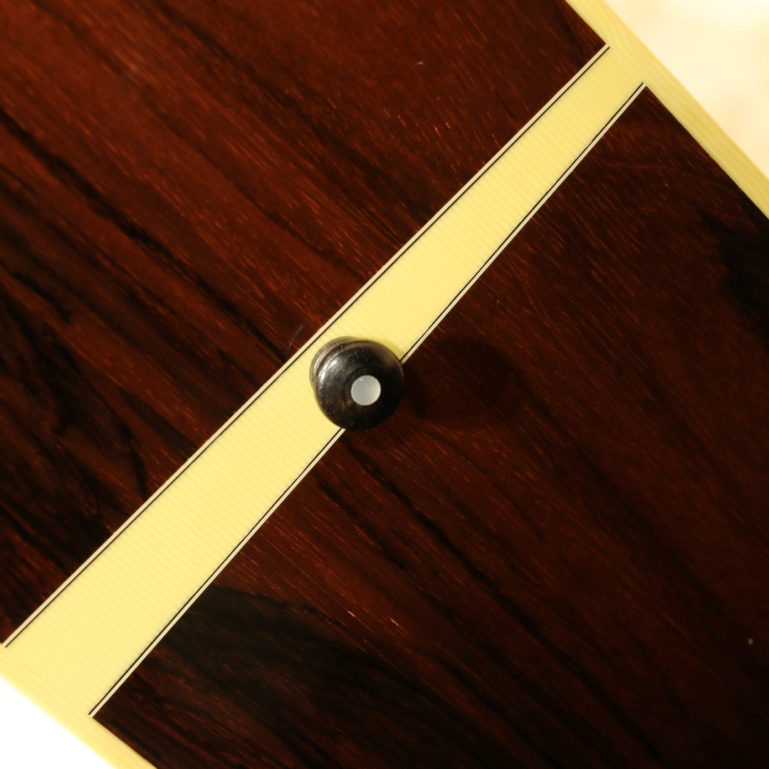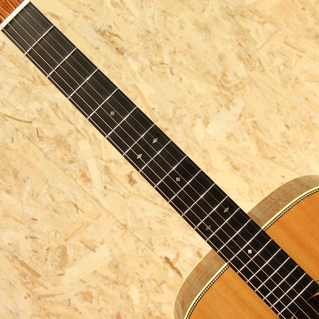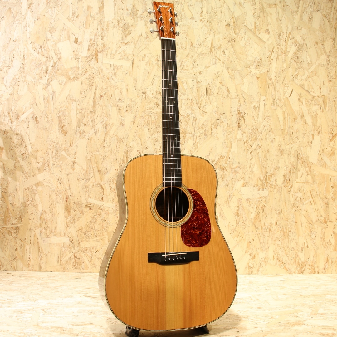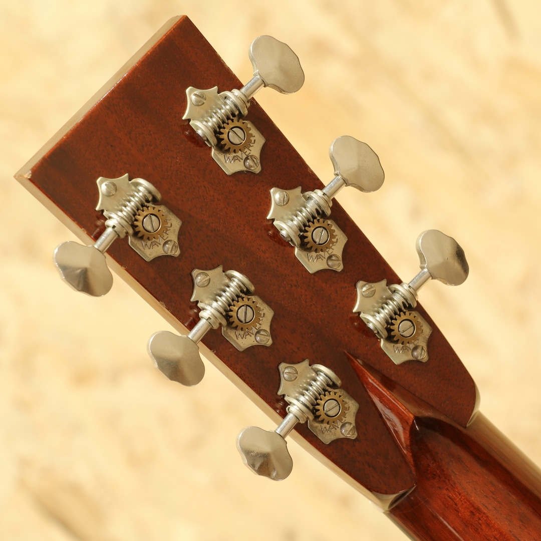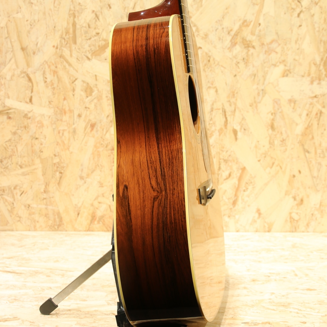 1980年代に創業者ビル・コリングスが小さな工房からスタートしたコリングス。戦前マーティンよりインスパイアされたスタイルで製造を開始し、みずからに昇華させたスタイルは唯一無二となり、世界的にもっとも高く評価を得ているブランドの一つとなっています。コリングスの高く保たれたその完成度は、プレイヤーがその楽器を手に持つだけで見惚れてしまう美しさを持ち、音を出せば納得する響きを放ちます。本器はスタイル28を基にした"D2H"をベースにアディロンダックスプルーストップ、ハカランダS&B仕様の流通少なく希少なモデル”D2H Ba Jacaranda”。ラッカー塗装最終期に作られた1本、1998年製USED品。端正な目幅で柾目杢が浮き出る美しいスプルーストップ、濃い色味の美しいハカランダサイド&バック、ホンジュラスマホガニーネック、エボニー指板&ブリッジ、ウェバリーオープンバックペグ、べっ甲柄ピックガード、ヘリンボーントリムパーフリング、ジグザグバックストリップ、アイボロイドバインディング、トップ構造は戦前マーチンの問題点を考慮したオリジナルスキャロップブレイシング、ラッカーフィニッシュ、ネックヒールストラップピン取付。D2HはトラッドなD-28スタイルを踏襲し、迫力のあるサウンドや空気感を含んだレンジ感の広いトーンを継承。その中でもエキゾチックウッドS&Bモデル自体の流通は少なく、またハカランダモデルは他社に比べても珍しいコリングス。音色の太さとキメの細やかな解像度の高いサウンド、磨き抜かれたような艶やかさのある響き。ハカランダ特有の硬質さや抜けの良いハイレンジサウンドも相まって透明感を持った音色を生み出してくれます。トップ材のアディロンダックスプルースによって生み出される弾力の強い分厚いトーン、ドレッドサイズの迫力とコリングス特有の音像のハッキリとした音色との相性は素晴らしく、倍音の乗ったファットなトーンとサスティンに富んだコシのある響き。繊細なタッチにも敏感に反応してくれる広いダイナミクスレンジも持ち合わせ、フラットピックでガツンと鳴らすもよし、柔らかなタッチで煌びやかで明瞭なトーンを楽しむもよしとコリングスらしい魅力を存分に体感できる1本。45mmナット幅で各弦の分離感にも優れています。トップ面ブリッジ下にクラック修正跡がございますが、裏から補強材も当てられており丁寧にリペアされています。杢目に沿った割れの為、補修跡もさほど目立たない仕上がりです。6弦側、1弦側のくびれ付近の両サイド面にもクラック修正跡が見られますが、こちらも接着リペア済です。ヘッドサイドに弦交換等の際にできたと思われるワインダー傷、その他使用に伴うへこみ傷や打痕、小傷は見られますが、約30年の経過を鑑みれば綺麗な状態が保たれており、大切に扱われてきたことがうかがえます。ネックまわりのコンディションも大変良好。扱いやすいコンディションで弾き心地ともに抜群です。流通稀なアディロンダック×ハカランダモデルのドレッドノートコリングス。是非お見逃しなく。オリジナルハードケースが付属します。