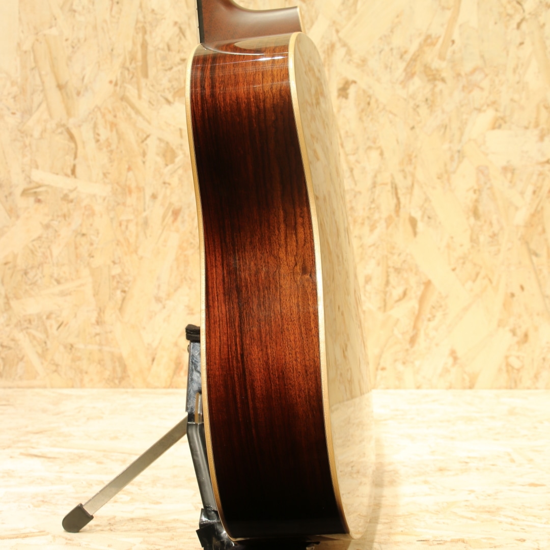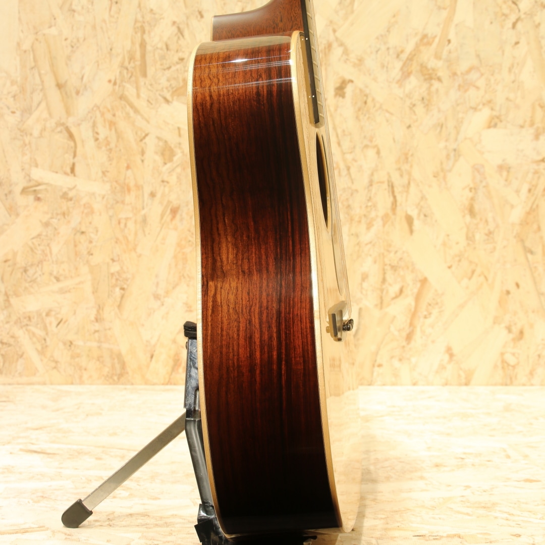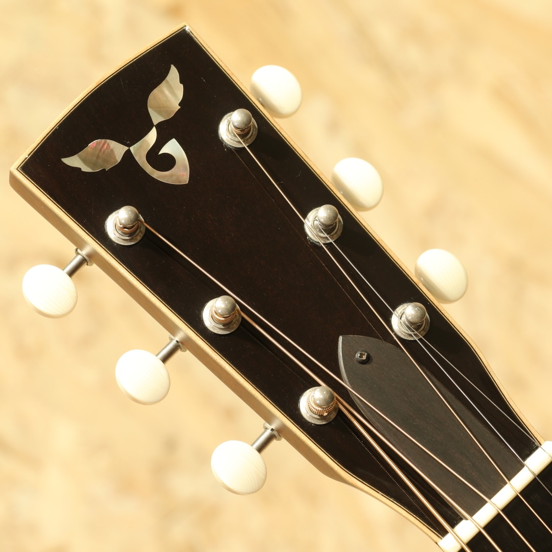 ハワイ発、"James Goodall"。現在は故郷のカリフォルニアに工房を戻し、小規模での製作がされていますが、以前はハワイにて製作をしていた個人手工クラスの大変丁寧な造りのメーカー。本器はトラディショナルなドレッドノートスタイル”TRD”。2000年代製USED品です。アディロンダックスプルーストップ、イーストインディアンローズウッドサイド&バック、マホガニーネック、エボニー指板&ブリッジ、ウェバリークロームペグ、ダイアモンド指板インレイ、べっ甲柄ピックガード、ヘリンボーンロゼッタ&トリム、メイプルバインディング、スキャロップドXブレイシング。トラディショナルなルックスを押さえつつ、手工に近いテイストを随所に感じさせるアレンジ。木材が持つ自然な美しさを融合させたデザインを与えられた1本です。ネックシェイプはCとされ、現代的な演奏性を確保。このサイズならではのダイナミクスに富んだサウンド、設計にはフラットピッカーやブルーグラス奏者の演奏を念頭に行われています。迫力の低音、伸びやかに広がる高音とレンジ感の広さにおいてもボディサイズの恩恵を感じさせます。ゴツッとした重さのある響き、芯のあるサウンド、輪郭感を感じる解像度の高いトーン。音色の太さやラウドさはアディロン由来のモノだと感じられます。プレイスタイルを問うことの無い楽器ではありますが、やはりこの迫力を存分に活かすにはフラットピックでの演奏が最適でしょう。ゴリゴリとドライブ感のあるトーンで弾きたくなる1本です。全体を通してみても塗装表面の極々薄い擦れキズが見られる程で非常に使用感の少ない個体。ネック周りの演奏性もグッド、しっかりと整えられておりロッド残りやサドル残りと充分な演奏性良好な個体です。素材の質の高さや作りの良さで世界的に評価されているハワイ時代の作品。一味違うドレッドノートをお探しだった方に是非オススメしたい1本です。