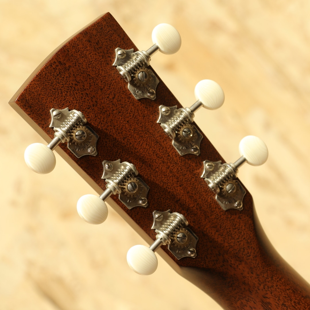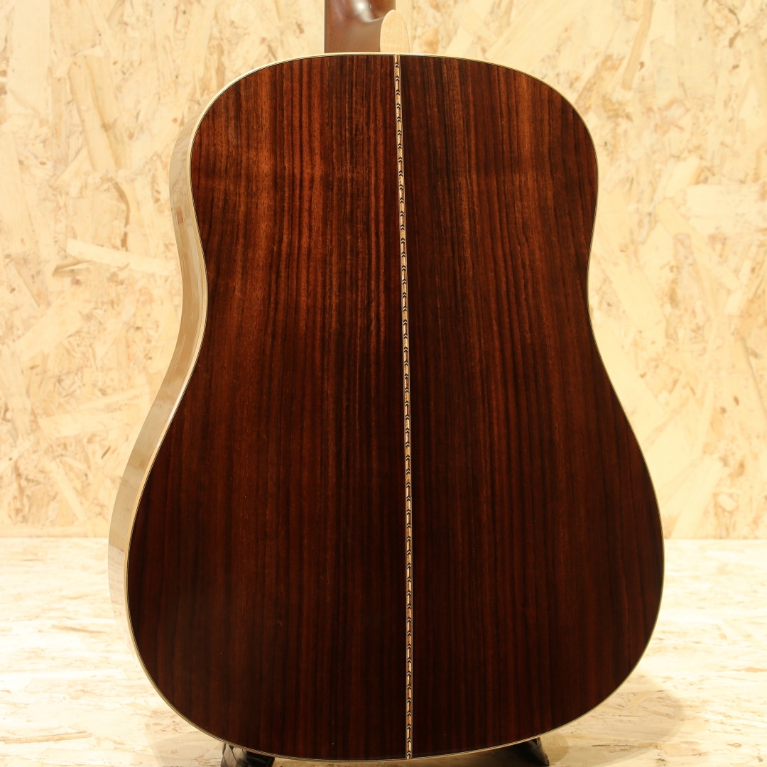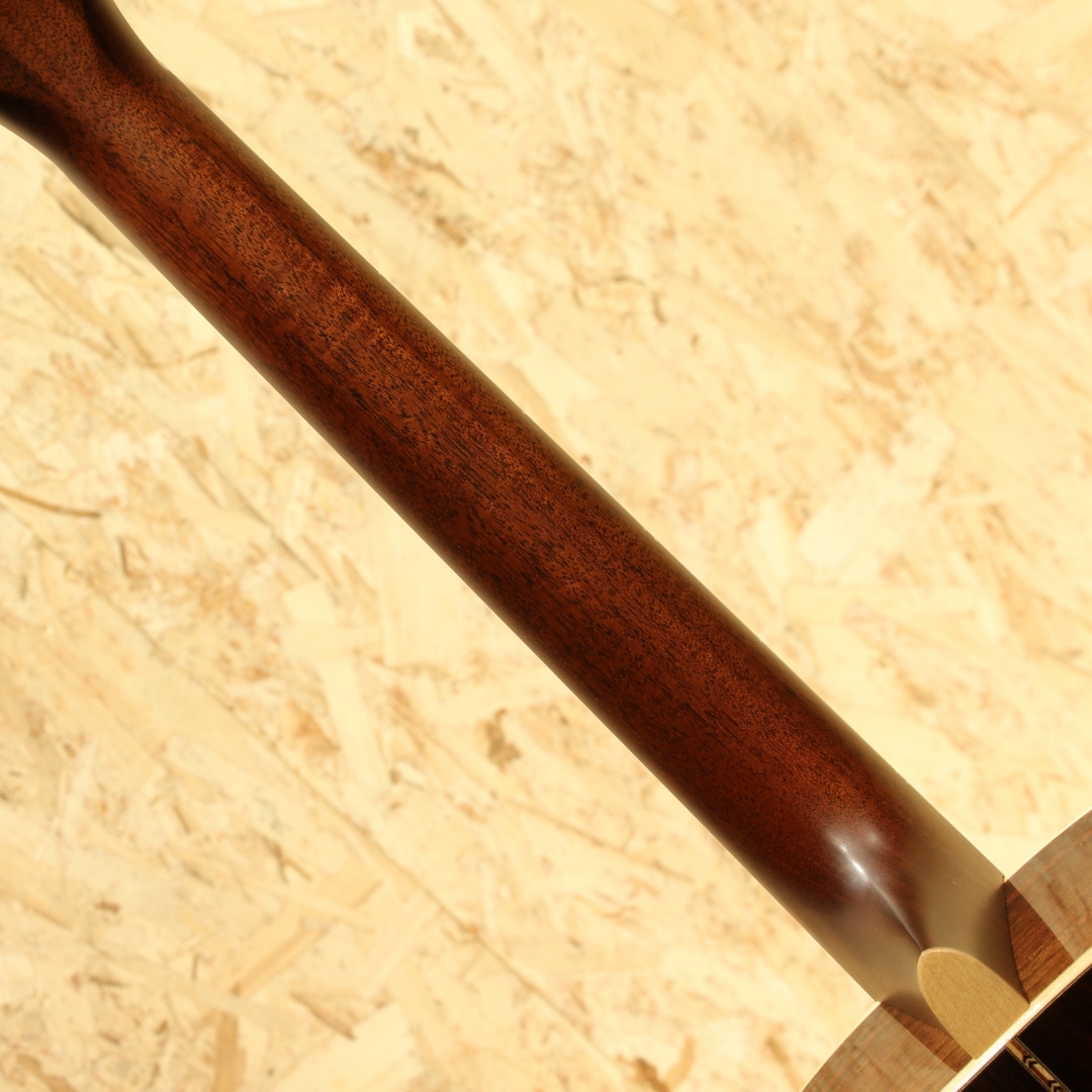ハワイ発、"James Goodall"。現在は故郷のカリフォルニアに工房を戻し、小規模での製作がされていますが、以前はハワイにて製作をしていた個人手工クラスの大変丁寧な造りのメーカー。本器はトラディショナルなドレッドノートスタイル”TRD”。2000年代製USED品です。アディロンダックスプルーストップ、イーストインディアンローズウッドサイド&バック、マホガニーネック、エボニー指板&ブリッジ、ウェバリークロームペグ、ダイアモンド指板インレイ、べっ甲柄ピックガード、ヘリンボーンロゼッタ&トリム、メイプルバインディング、スキャロップドXブレイシング。トラディショナルなルックスを押さえつつ、手工に近いテイストを随所に感じさせるアレンジ。木材が持つ自然な美しさを融合させたデザインを与えられた1本です。ネックシェイプはCとされ、現代的な演奏性を確保。このサイズならではのダイナミクスに富んだサウンド、設計にはフラットピッカーやブルーグラス奏者の演奏を念頭に行われています。迫力の低音、伸びやかに広がる高音とレンジ感の広さにおいてもボディサイズの恩恵を感じさせます。ゴツッとした重さのある響き、芯のあるサウンド、輪郭感を感じる解像度の高いトーン。音色の太さやラウドさはアディロン由来のモノだと感じられます。プレイスタイルを問うことの無い楽器ではありますが、やはりこの迫力を存分に活かすにはフラットピックでの演奏が最適でしょう。ゴリゴリとドライブ感のあるトーンで弾きたくなる1本です。全体を通してみても塗装表面の極々薄い擦れキズが見られる程で非常に使用感の少ない個体。ネック周りの演奏性もグッド、しっかりと整えられておりロッド残りやサドル残りと充分な演奏性良好な個体です。素材の質の高さや作りの良さで世界的に評価されているハワイ時代の作品。一味違うドレッドノートをお探しだった方に是非オススメしたい1本です。