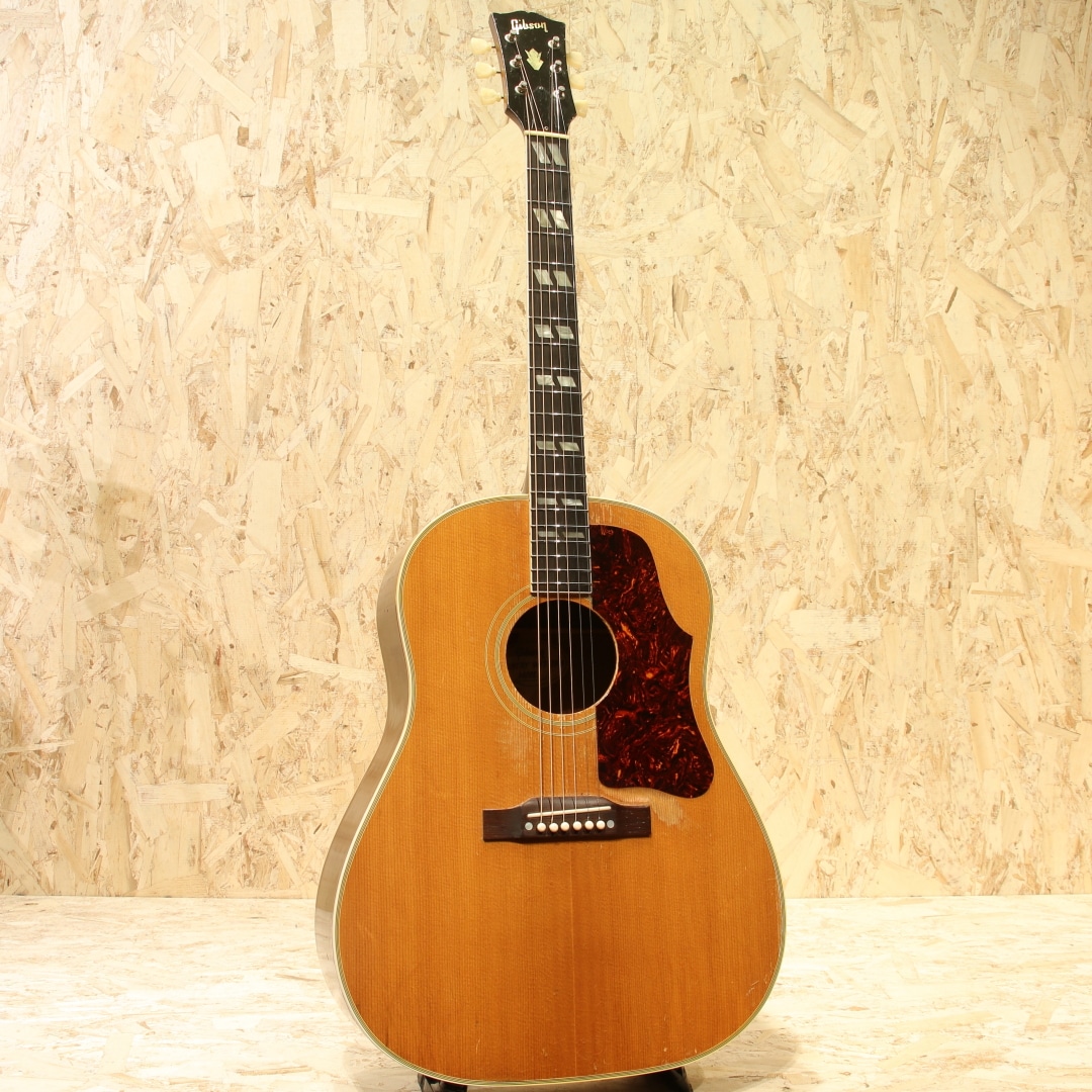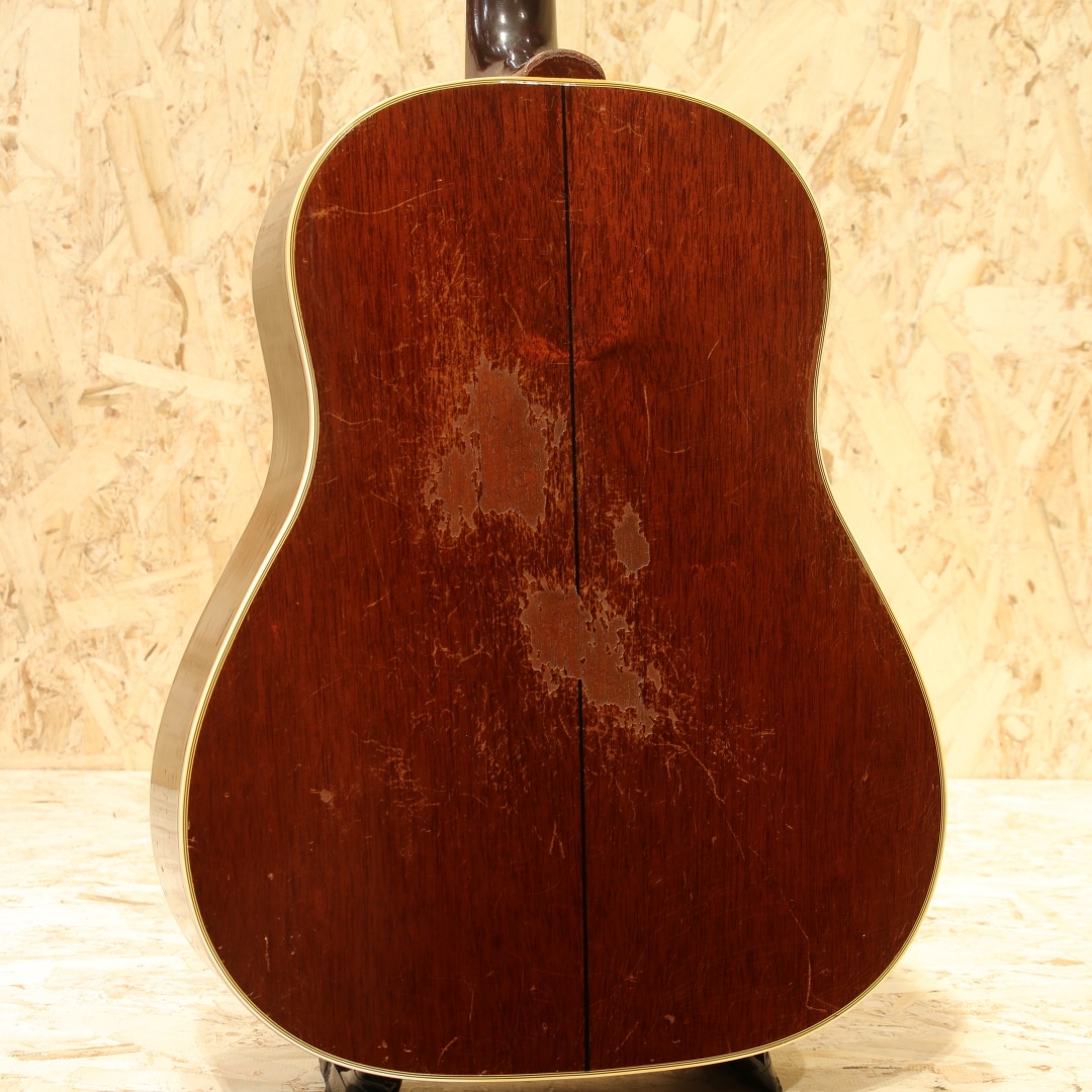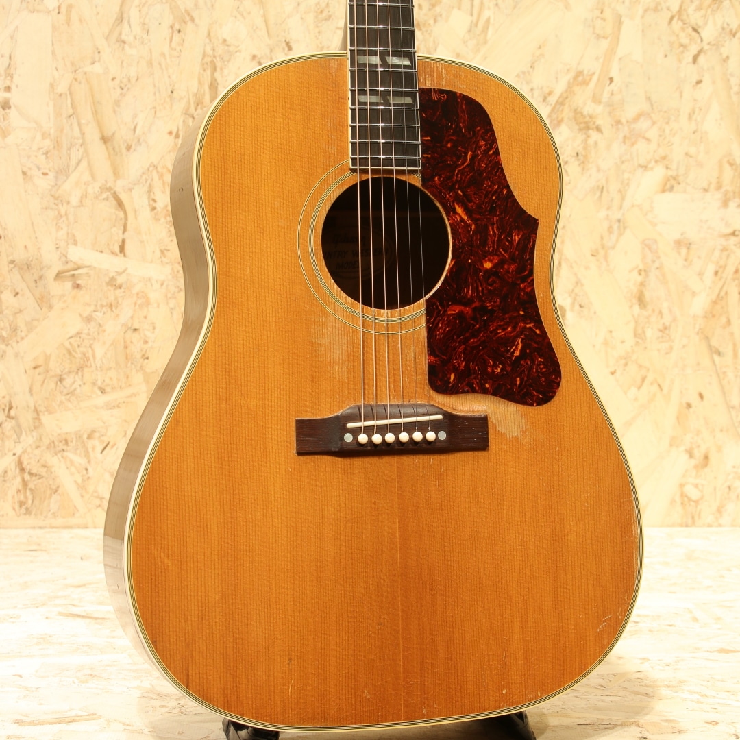 ギブソンカントリーウェスタンは"サザンジャンボ"のナチュラルモデル(通称SJN)として、1954年より製造が開始されました。本器は製造開始から間もなくの1955年製、初期モデルです。スペックはサザンジャンボに準じた形となります。1955年は大幅にスペックが変更された年で本器は20フレットトータル、ノンスキャロップドXブレイシングが採用されたスペック変更後の仕様を持った個体となります。ラウンドショルダーボディー、スプルーストップ、マホガニーサイドバック、ハカランダ指板&ブリッジ、マホガニーネック、ノーマルスロットサドル、オリジナルクルーソンペグ、ダブルパラレログラムパーロイド指板インレイ、ダブルリングロゼッタ、べっ甲柄セルロイドピックガードはガードクラック修正のためオーバーサイズにリプレイス、ノンスキャロップドXブレイシング、ナット幅約43ミリ、ヘッド角17度、オリジナルフィニッシュ、ブリッジピンは交換されています。40年代ほどではありませんが、やや厚みを持たせた硬派な握りのUネック。しっかりと弾きこまれた個体でビーフィーなサウンド、L50sギブソンの良さを存分に味わえます。空気を多く含み、煌びやかさも持ち合わせながらも少ししゃがれたノスタルジックな音立ち、カラカラに乾いたアスファルトに水が滴るように立ち上がりの熱量から一転クリスピーに散るように減衰していくサウンドはオールドギブソンの醍醐味。まさにこの時代の個体に求めるサウンドです。前述でも述べた通り、ピックガードクラックの修正痕が内側の上下に見られ、木部修正されており、その上を隠すようにリプレイスされたオーバーサイズのピックガードに交換されています。ややサウンドホールを覆うデザインに変更はされていますが、ピックガードの厚みやセルロイドの色味や質感は自然で違和感はありません。ボディートップのくびれの大きい部分付近の両端に軽微なクラック修正タッチアップ跡、ピックガード下部からブリッジの隙間あたりのトップ面がオーナーの弾き癖せに良く当たったのか深く削れており、木部の地肌がかなり見える状態にエグレはありますが現状リペアなく使用できます。過去にピックアップをマウントしていたと思われ、エンドピンがピックアップサイズに拡張されていますがジャックサイズの牛骨製エンドピンがマウントされています。ボディーはサウンドホールまわりによく見られる弾き傷や全体に見られるウェザーチェックやうち傷や打痕は多く見られます。ボディーバックにはバックル傷にて多面に渡り塗装の削れが見られます。ネック裏もローポジションから10F付近までカポ傷と見られる傷、塗装の剥がれは全体的に見られます。良く使われた個体ですが、オリジナルフィニッシュをキープしており、風合いは抜群。ネックはストレートで良いコンディションをキープ、フレットは交換されており、トラスロッドにも余裕があります。弾きやすい状態がキープされており、サウンド面はとても満足度が高い一本です。かなり出の少ないカントリーウェスタンの初期モノ。多少の手入れはありますが良い個体です。チップボードケースが付属します。