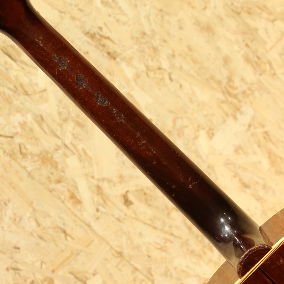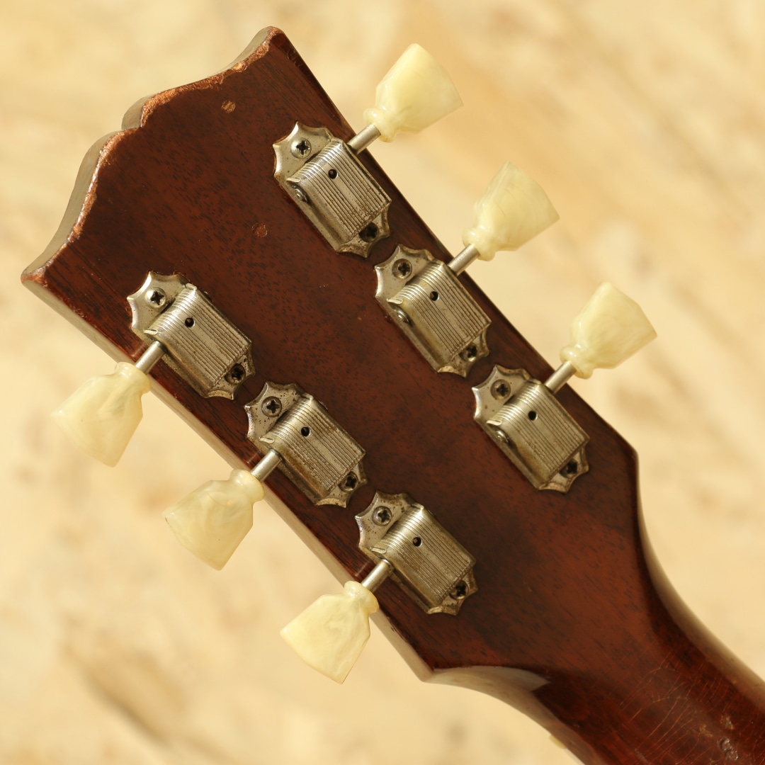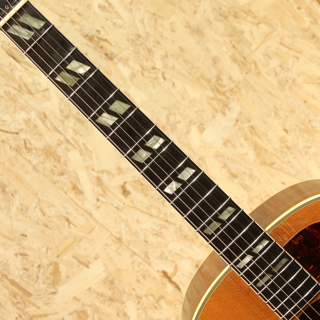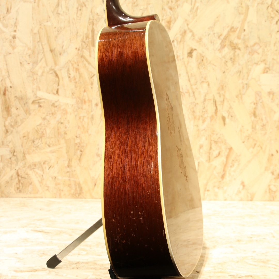 ギブソンカントリーウェスタンは"サザンジャンボ"のナチュラルモデル(通称SJN)として、1954年より製造が開始されました。本器は製造開始から間もなくの1955年製、初期モデルです。スペックはサザンジャンボに準じた形となります。1955年は大幅にスペックが変更された年で本器は20フレットトータル、ノンスキャロップドXブレイシングが採用されたスペック変更後の仕様を持った個体となります。ラウンドショルダーボディー、スプルーストップ、マホガニーサイドバック、ハカランダ指板&ブリッジ、マホガニーネック、ノーマルスロットサドル、オリジナルクルーソンペグ、ダブルパラレログラムパーロイド指板インレイ、ダブルリングロゼッタ、べっ甲柄セルロイドピックガードはガードクラック修正のためオーバーサイズにリプレイス、ノンスキャロップドXブレイシング、ナット幅約43ミリ、ヘッド角17度、オリジナルフィニッシュ、ブリッジピンは交換されています。40年代ほどではありませんが、やや厚みを持たせた硬派な握りのUネック。しっかりと弾きこまれた個体でビーフィーなサウンド、L50sギブソンの良さを存分に味わえます。空気を多く含み、煌びやかさも持ち合わせながらも少ししゃがれたノスタルジックな音立ち、カラカラに乾いたアスファルトに水が滴るように立ち上がりの熱量から一転クリスピーに散るように減衰していくサウンドはオールドギブソンの醍醐味。まさにこの時代の個体に求めるサウンドです。前述でも述べた通り、ピックガードクラックの修正痕が内側の上下に見られ、木部修正されており、その上を隠すようにリプレイスされたオーバーサイズのピックガードに交換されています。ややサウンドホールを覆うデザインに変更はされていますが、ピックガードの厚みやセルロイドの色味や質感は自然で違和感はありません。ボディートップのくびれの大きい部分付近の両端に軽微なクラック修正タッチアップ跡、ピックガード下部からブリッジの隙間あたりのトップ面がオーナーの弾き癖せに良く当たったのか深く削れており、木部の地肌がかなり見える状態にエグレはありますが現状リペアなく使用できます。過去にピックアップをマウントしていたと思われ、エンドピンがピックアップサイズに拡張されていますがジャックサイズの牛骨製エンドピンがマウントされています。ボディーはサウンドホールまわりによく見られる弾き傷や全体に見られるウェザーチェックやうち傷や打痕は多く見られます。ボディーバックにはバックル傷にて多面に渡り塗装の削れが見られます。ネック裏もローポジションから10F付近までカポ傷と見られる傷、塗装の剥がれは全体的に見られます。良く使われた個体ですが、オリジナルフィニッシュをキープしており、風合いは抜群。ネックはストレートで良いコンディションをキープ、フレットは交換されており、トラスロッドにも余裕があります。弾きやすい状態がキープされており、サウンド面はとても満足度が高い一本です。かなり出の少ないカントリーウェスタンの初期モノ。多少の手入れはありますが良い個体です。チップボードケースが付属します。