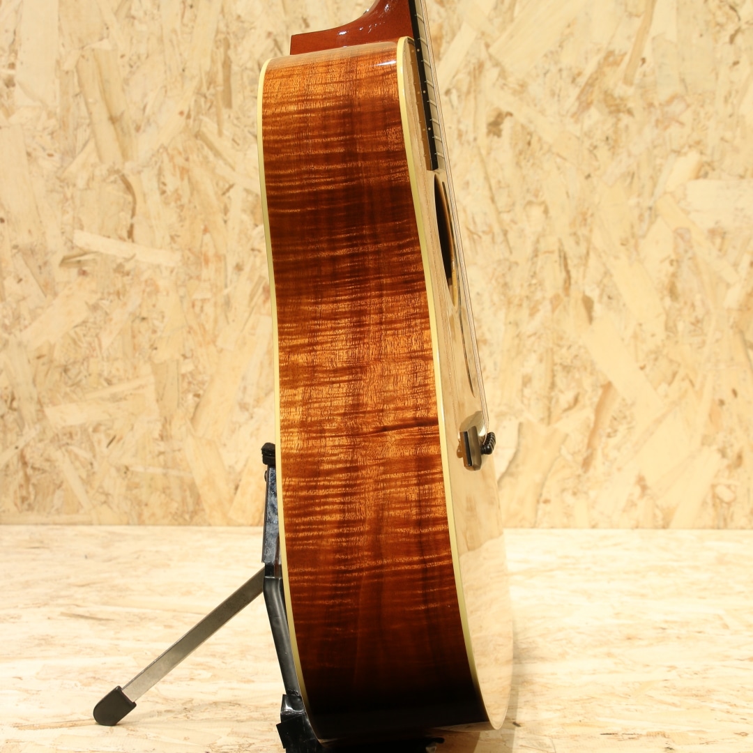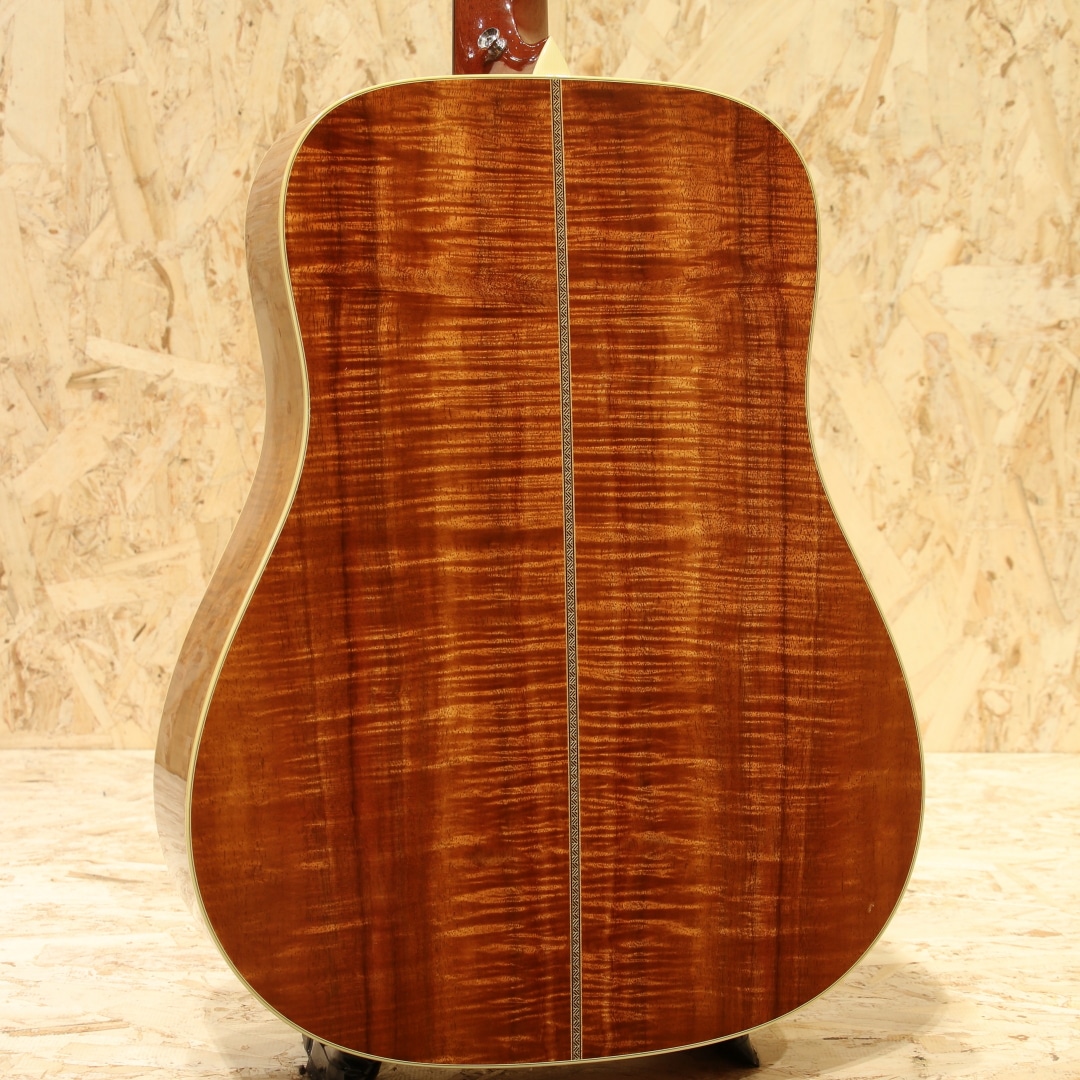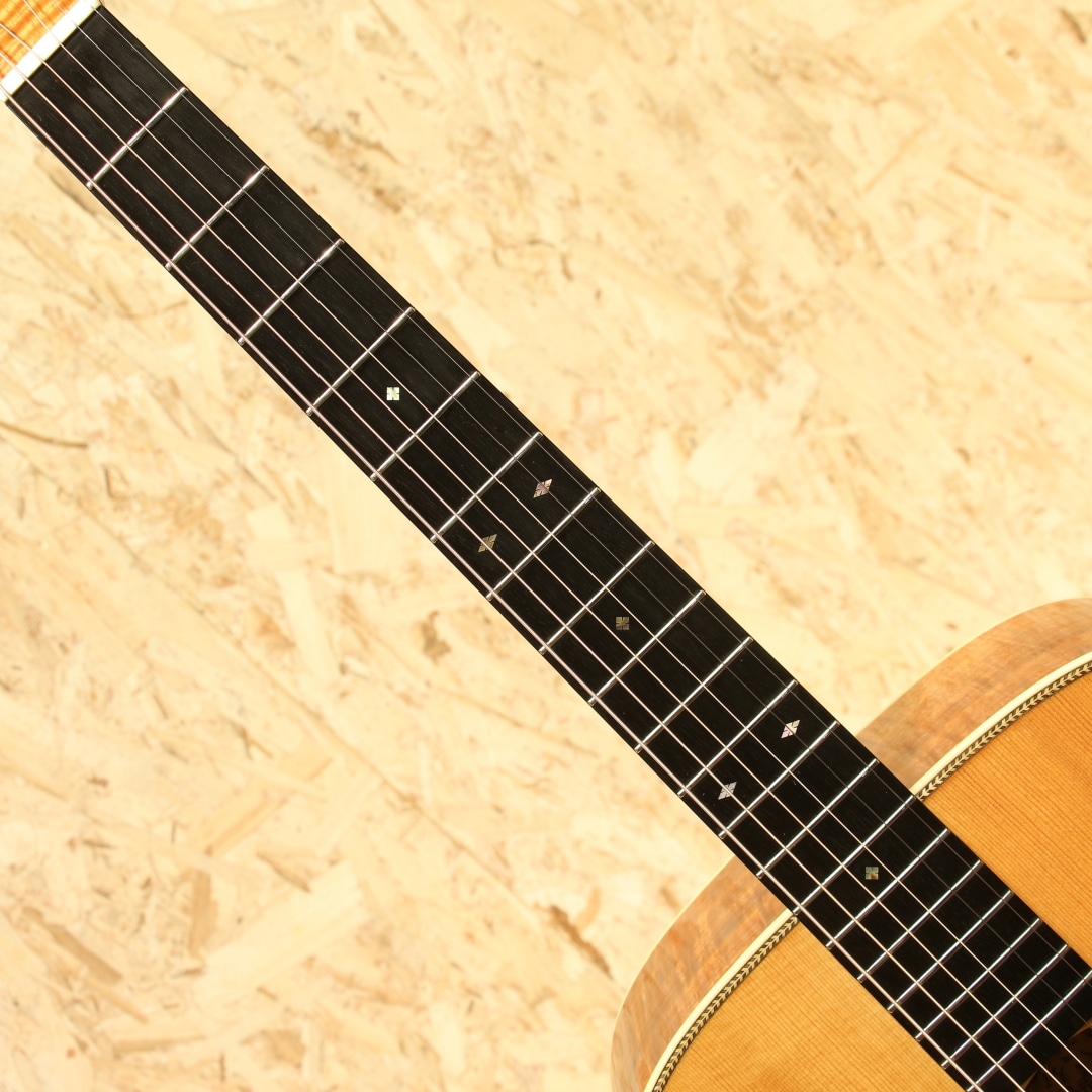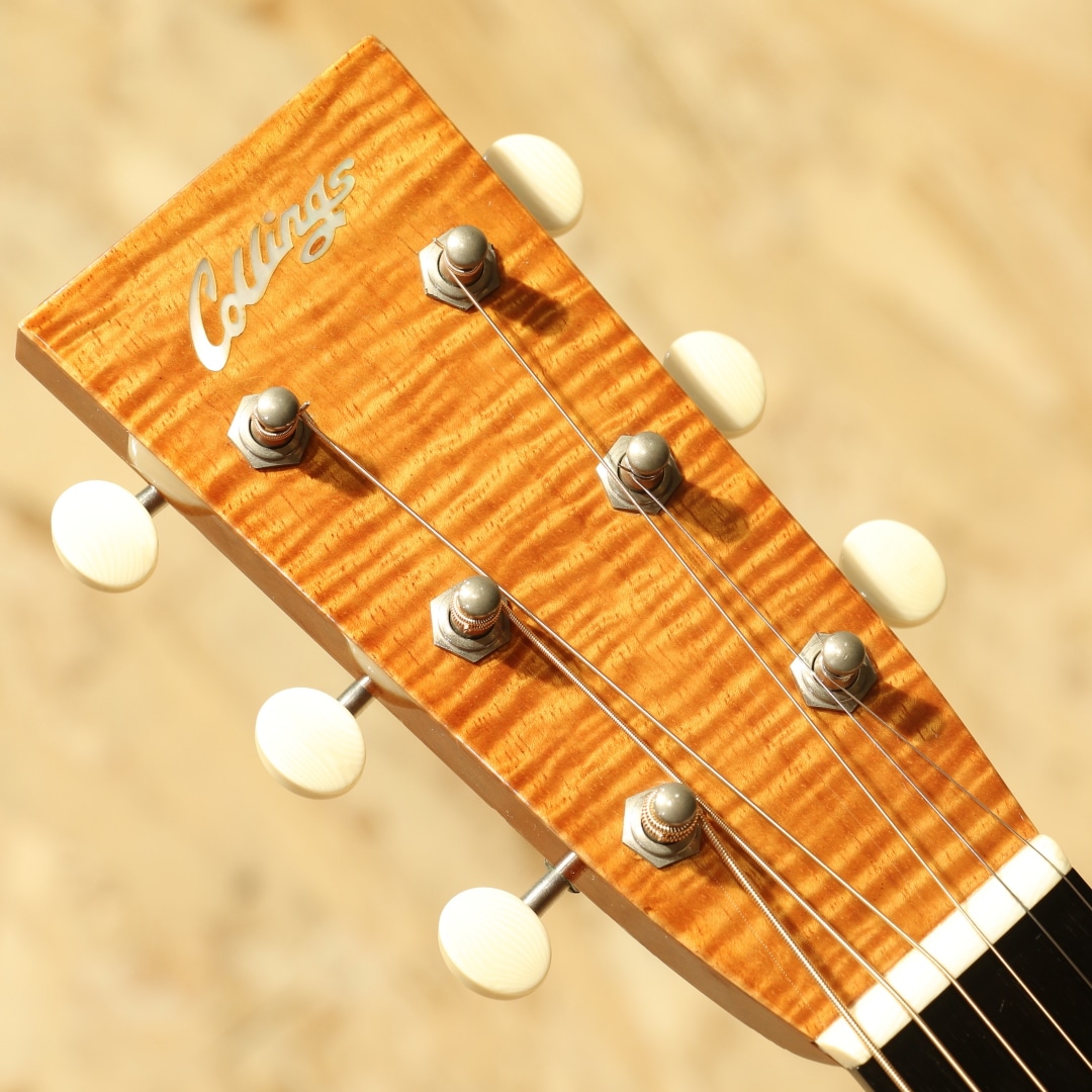 1980年代に創業者ビル・コリングスが小さな工房からスタートしたコリングス。戦前マーティンよりインスパイアされたスタイルで製造を開始し、みずからに昇華させたスタイルは唯一無二となり、世界的にもっとも高く評価を得ているブランドの一つとなっています。コリングスの高く保たれたその完成度は、プレイヤーがその楽器を手に持つだけで見惚れてしまう美しさを持ち、音を出せば納得する響きを放ちます。本器はスタイル28タイプの代表格モデル"D2H"をベースにカスタムされた”D2H KOA G”。2004年製USED品。整った目幅で黄金色に輝くジャーマンスプルーストップ、びっしりと杢目の入ったフィギュア―ドハワイアンコアサイド&バック、金属の補強を加えたホンジュラスマホガニーネック、エボニー指板&ブリッジ、ウェバリーオープンバックペグ&アイボロイドボタン、30sスタイルのダルメシアン柄ピックガード、ヘリンボーントリム、ジグザグバックストリップ、アイボロイドバインディング、戦前の楽器に倣ったオリジナルスキャロップドXブレイシング。ナットは象牙で作成されたモノを装着、ネックヒールサイドにはストラップピンを装着、エンド箇所はジャックサイズに拡張され同径のピンが装着されています。D2HはトラッドなD-28スタイルを踏襲し、深く迫力のあるトーンや空気感を含んだレンジ感の広い音色を継承。更に明瞭な響きと確かなピッチ感を備えたコリングス流のドレッドノートとして製造されています。コリングスはオプションを多数用意しており、本器はサイドバックをハワイアンコアに、トップをジャーマンにしたウッドカスタム品。その他にはペグつまみやピックガードを変更されています。どのポジションで弾いてもトーンが変わらず、くっきろと素早く立ち上がるピアノトーンは健在。厚みのあるサウンド、広がりのあるサウンドはボディ容積あってこその響き。ラウドさはそのままに、実音の後についてくる倍音が心地よく、ジャーマンをトップに据えている恩恵を感じられます。そしてやや甘さを感じさせるブライトで明瞭なサウンド。やや腰の高い響きで乾いたテイストを感じさせます。しっかりとしたテンション感、凛とした響き、全体で震えているような手応え。一度弾いてしまうと虜になるであろうコリングスサウンドを存分に体感できます。ヘッド付け根のハンガーが当たる箇所の当てキズと塗装剥げ、ヘッド裏の角にも当てキズや塗装剥げ、ヘッド裏の僅かな当てキズとネックヒール先端の僅かな塗装剥げ、ボディバック面には光に透かすと僅か見える当て擦りキズの他全体的に薄い擦れキズと多少の使用感こそ見られますが年式を考えるとキレイな状態をキープ。頑丈さに定評があるコリングスらしく、ネックの状態もバッチリに保たれサドルでの調整幅も確保された1本です。実用性、道具としての機能美を高めたコリングスのギター。美麗な外観と美しい音色も備えたスペシャルな個体です。是非ご検討下さいませ。