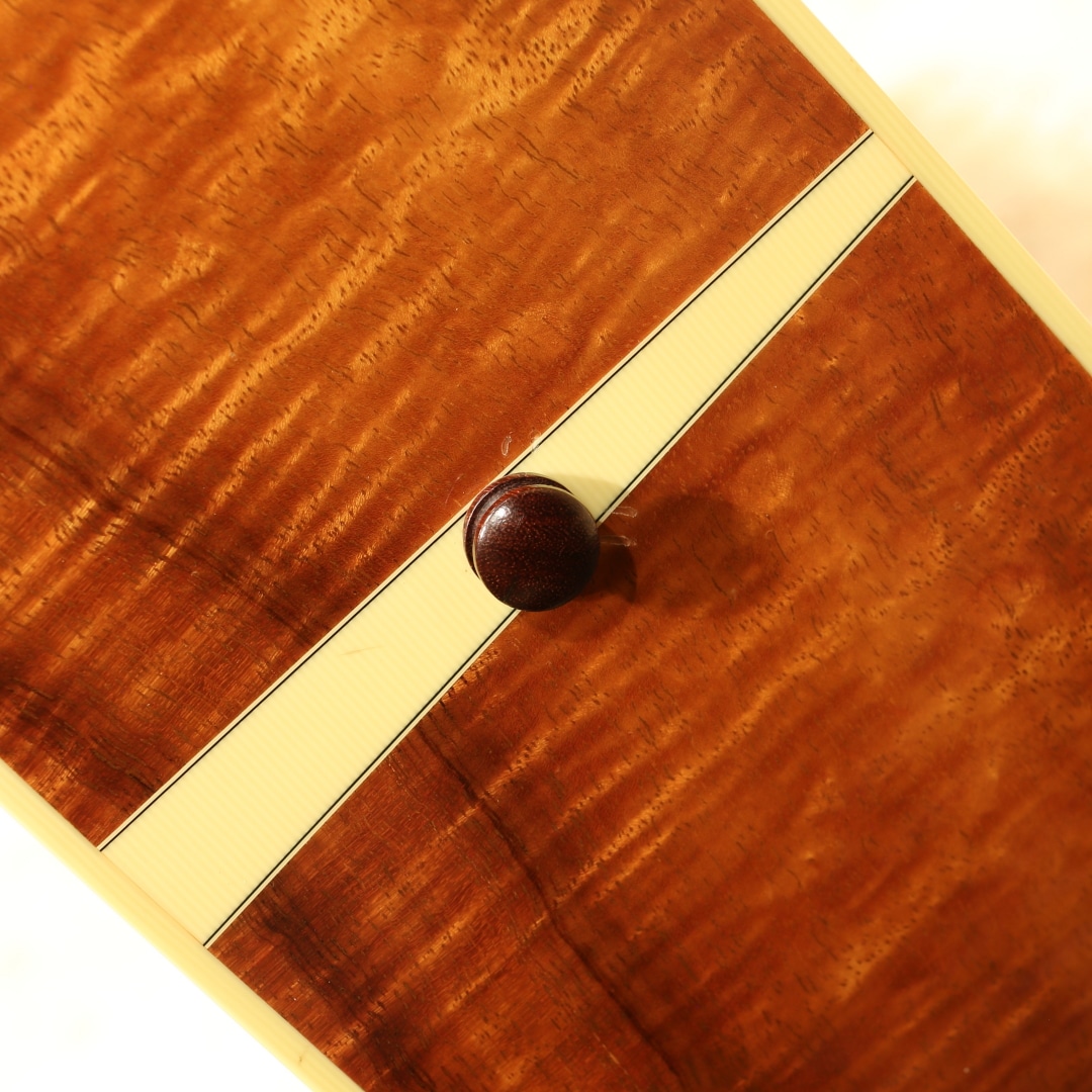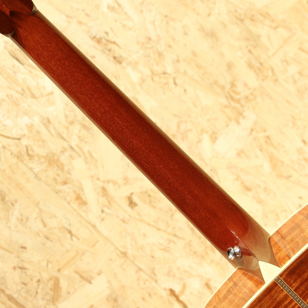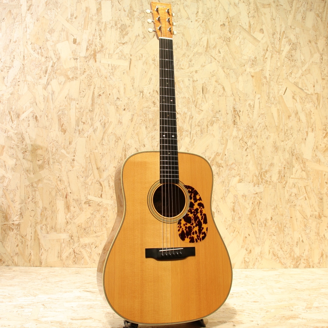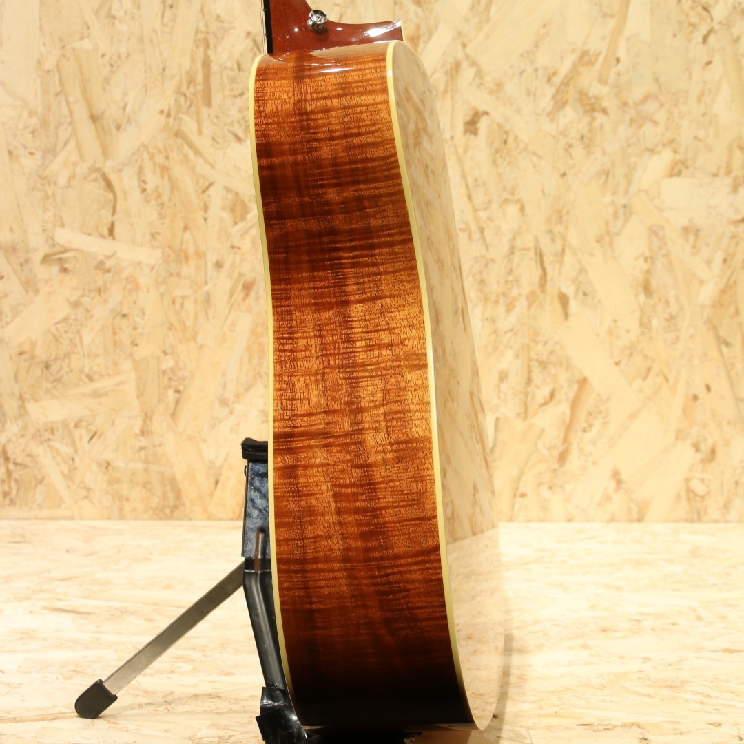 1980年代に創業者ビル・コリングスが小さな工房からスタートしたコリングス。戦前マーティンよりインスパイアされたスタイルで製造を開始し、みずからに昇華させたスタイルは唯一無二となり、世界的にもっとも高く評価を得ているブランドの一つとなっています。コリングスの高く保たれたその完成度は、プレイヤーがその楽器を手に持つだけで見惚れてしまう美しさを持ち、音を出せば納得する響きを放ちます。本器はスタイル28タイプの代表格モデル"D2H"をベースにカスタムされた”D2H KOA G”。2004年製USED品。整った目幅で黄金色に輝くジャーマンスプルーストップ、びっしりと杢目の入ったフィギュア―ドハワイアンコアサイド&バック、金属の補強を加えたホンジュラスマホガニーネック、エボニー指板&ブリッジ、ウェバリーオープンバックペグ&アイボロイドボタン、30sスタイルのダルメシアン柄ピックガード、ヘリンボーントリム、ジグザグバックストリップ、アイボロイドバインディング、戦前の楽器に倣ったオリジナルスキャロップドXブレイシング。ナットは象牙で作成されたモノを装着、ネックヒールサイドにはストラップピンを装着、エンド箇所はジャックサイズに拡張され同径のピンが装着されています。D2HはトラッドなD-28スタイルを踏襲し、深く迫力のあるトーンや空気感を含んだレンジ感の広い音色を継承。更に明瞭な響きと確かなピッチ感を備えたコリングス流のドレッドノートとして製造されています。コリングスはオプションを多数用意しており、本器はサイドバックをハワイアンコアに、トップをジャーマンにしたウッドカスタム品。その他にはペグつまみやピックガードを変更されています。どのポジションで弾いてもトーンが変わらず、くっきろと素早く立ち上がるピアノトーンは健在。厚みのあるサウンド、広がりのあるサウンドはボディ容積あってこその響き。ラウドさはそのままに、実音の後についてくる倍音が心地よく、ジャーマンをトップに据えている恩恵を感じられます。そしてやや甘さを感じさせるブライトで明瞭なサウンド。やや腰の高い響きで乾いたテイストを感じさせます。しっかりとしたテンション感、凛とした響き、全体で震えているような手応え。一度弾いてしまうと虜になるであろうコリングスサウンドを存分に体感できます。ヘッド付け根のハンガーが当たる箇所の当てキズと塗装剥げ、ヘッド裏の角にも当てキズや塗装剥げ、ヘッド裏の僅かな当てキズとネックヒール先端の僅かな塗装剥げ、ボディバック面には光に透かすと僅か見える当て擦りキズの他全体的に薄い擦れキズと多少の使用感こそ見られますが年式を考えるとキレイな状態をキープ。頑丈さに定評があるコリングスらしく、ネックの状態もバッチリに保たれサドルでの調整幅も確保された1本です。実用性、道具としての機能美を高めたコリングスのギター。美麗な外観と美しい音色も備えたスペシャルな個体です。是非ご検討下さいませ。