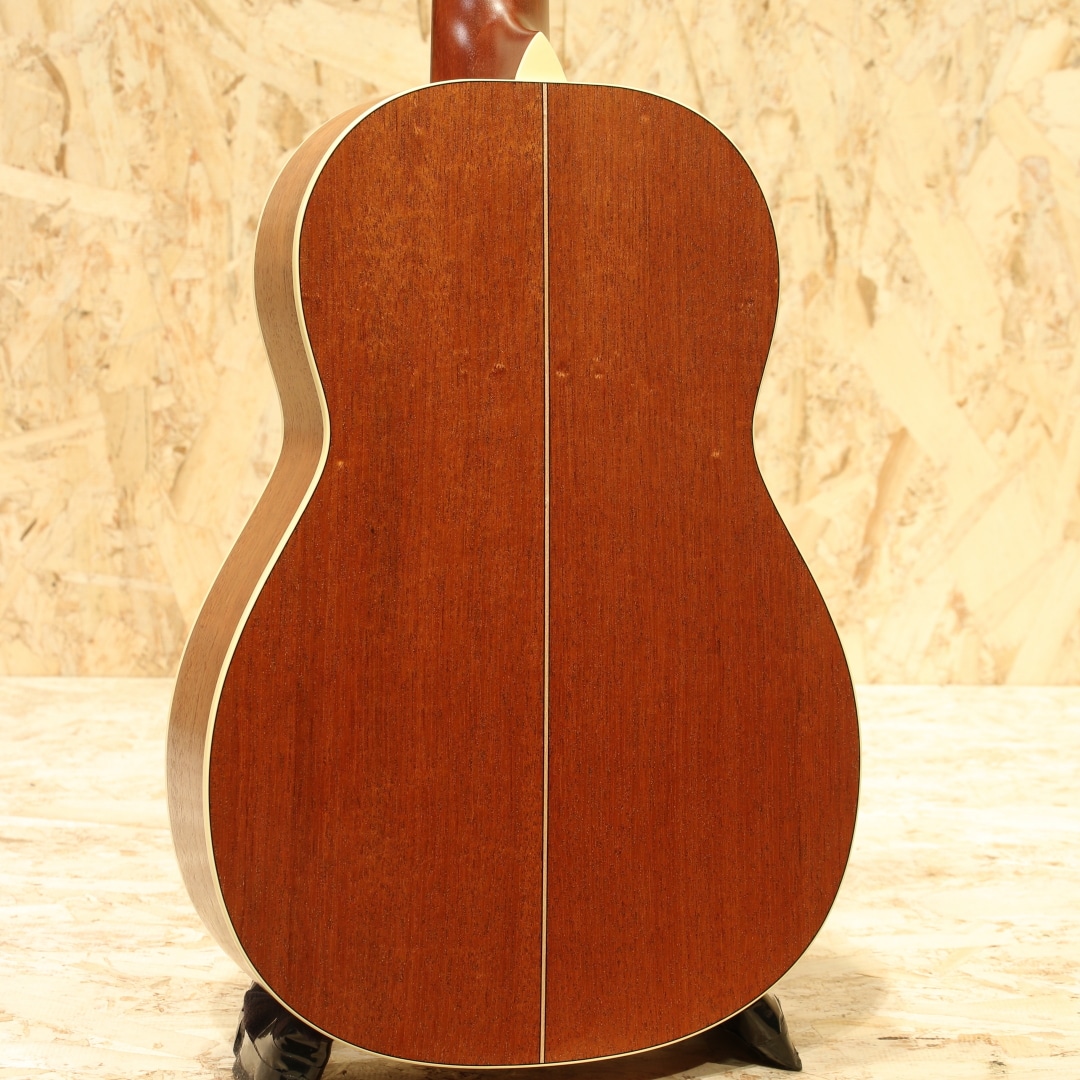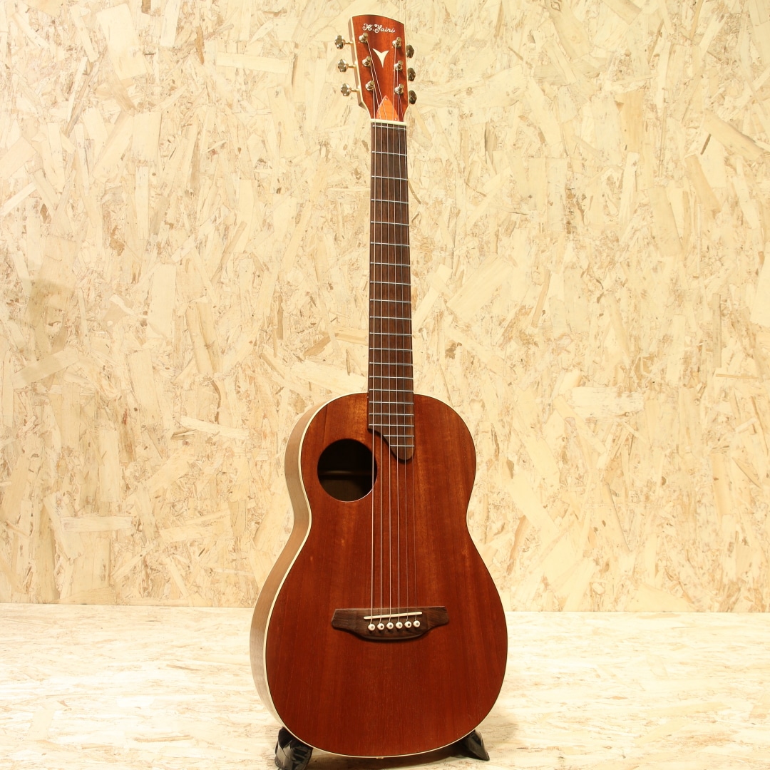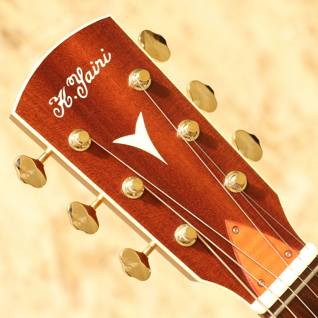 岐阜県の工房にて手作りにこだわり製造を続けるヤイリギター。世代を超えてずっと愛され続けるギター、年月を重ねても色あせないデザイン、使い込むほどに深みが増す音色をコンセプトとして現在でも約30名程の体制で1日20本程のペースで製造されています。海外の著名アーティストを始め、国内プロアーティストからも大きな支持を集めているブランドです。本器は小ぶりで持ち回り易いパーラータイプのノクターンをベースに2019年に限定生産された”Nocturne HM LTD”。2019年製USED品です。オール単板のホンジュラスマホガニーボディ、マホガニーネック、ローズウッド指板&ブリッジ、Xブレイシング。国産ヤイリギターの中でパーラーサイズとなるモデルのノクターン。持ち回り易さ、抱え易さなど気軽さが魅力的なサイズ感となります。出先での演奏、旅行先での演奏、BBQや海岸での演奏、お子さんと一緒に演奏など生活に密接に寄り添える可能性を持っています。小型なれど仕様は本格派なのもノクターンの魅力の一つ。さらに通常仕様とは異なるオールホンジュラスマホガニーの特性も合わさることでより通常モデルとは一味違った魅力的なサウンドを奏でられる本器。肝心のサウンドは中音域が豊かで太くピークが中音域にある響き、中高音を押し出しつつ温かく甘い音色、アタック感が丸く耳触りの優しい印象を覚えます。1音1音の立ち上がりも早く、自然なサステインが長く響き音の解像度が高いサウンドで音の芯を持った響き。サイズ感故に可愛らしいポコっとした響きもまたキュートです。整ったサウンドバランスで細やかなフレーズにも追従、様々なスタイルの運指をサポートする薄めのグリップの為、指弾いても良し、ピックで弾いても良しの扱い易さも魅力の一つと言えるでしょう。ボディトップセンター下部と1弦側に何かが擦れたような跡がうっすらと入っており、ネックにサテン塗装ゆえのテカリが若干見られるもののその他は全体を通して見てもキレイなコンディションキがキープされている個体。ネック周りも良好に保たれており、演奏性も問題無しです。あらゆる用途に使える小型のギター。生活に寄り添える、移動の楽なギターです。是非お手元でお楽しみ下さいませ。持ち回り易いオリジナルソフトケースが付属します。