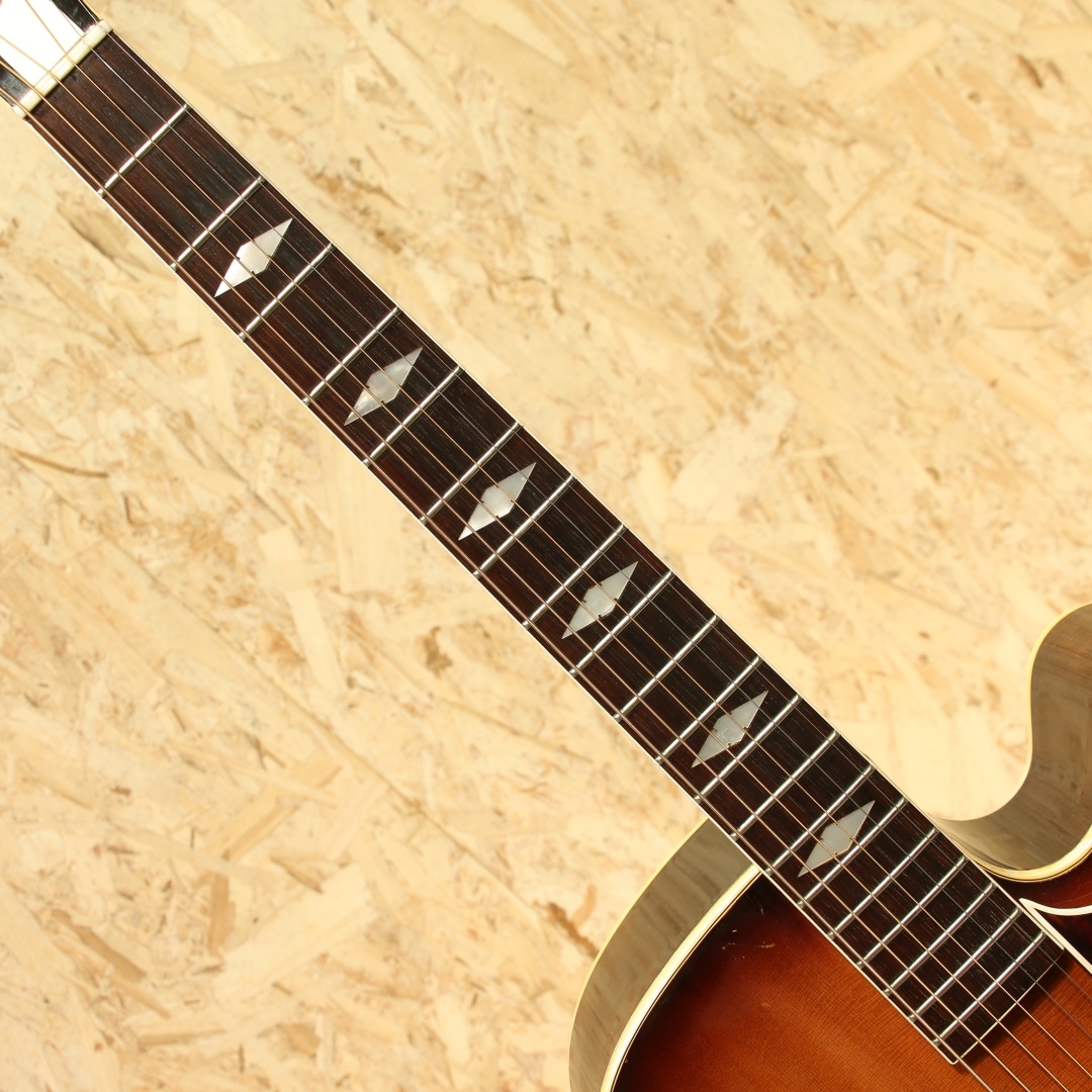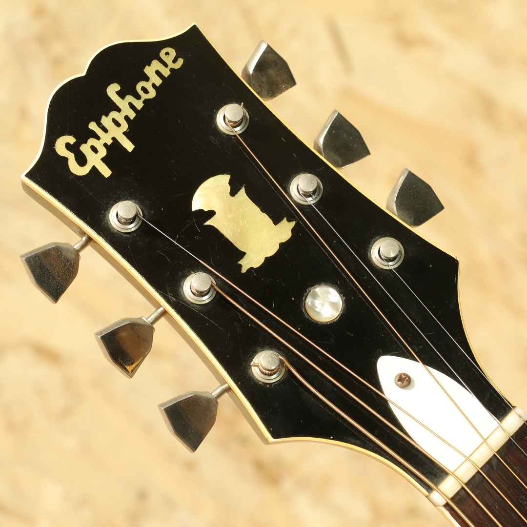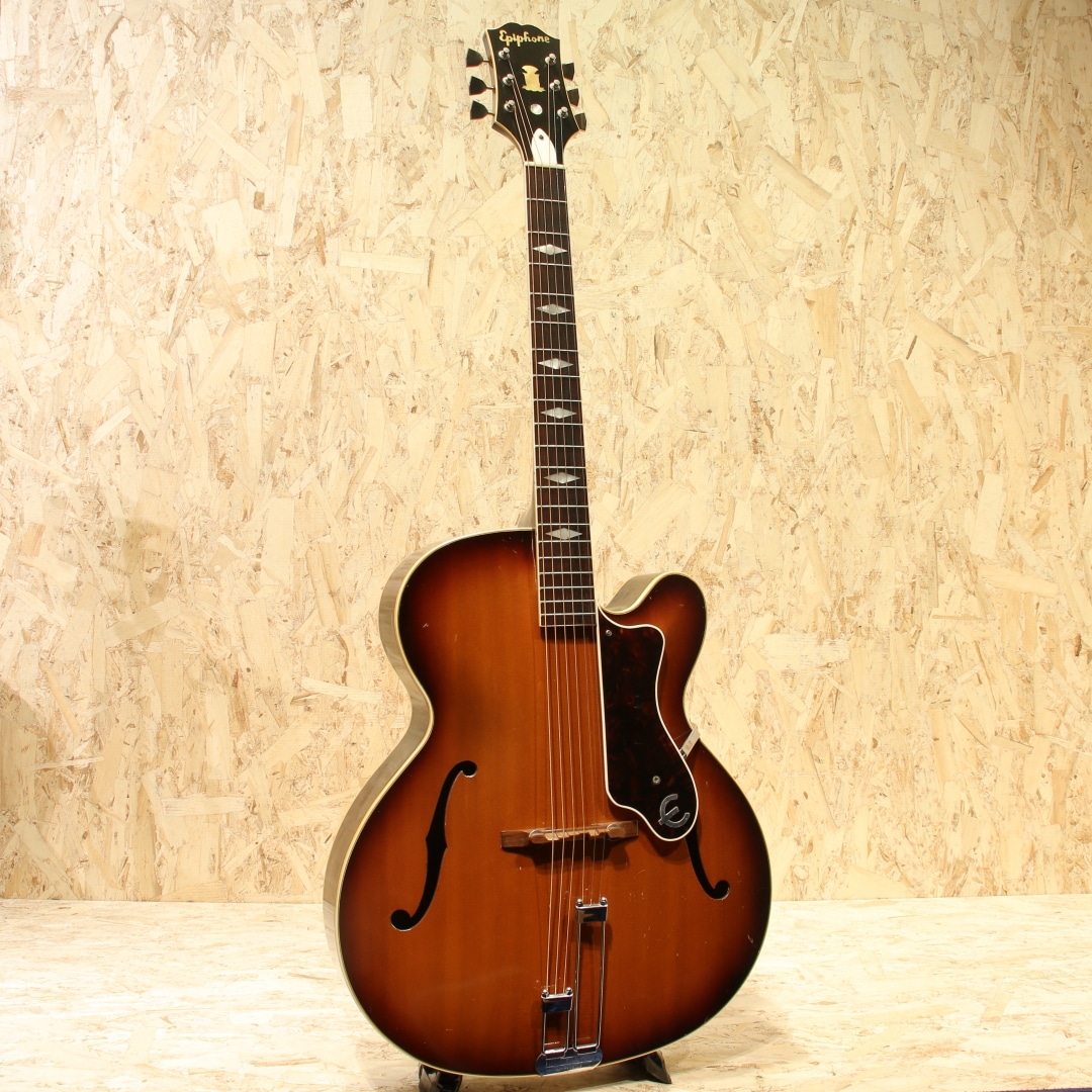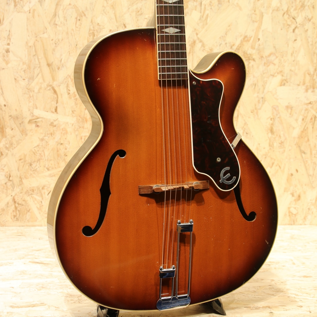 1873年の創業より長い歴史を持つエピフォンブランド。オリジナリティーの高いサウンドも持ち、アーチドトップ界ではGIBSONと席巻し人気を博したEpiphoneですが、のちの1950年代晩年期、経営陣の不仲などにより徐々に衰退。1957年以降はライバル社であったギブソンに買収され、工場がカラマズーに統合されました。本器はカラマズー工場製となった後の1959年製造"Triumph"。17 3/8’’ボディーワイド、スプルーストップ、メイプルサイド&バック、センターに別の木を挟んだマホガニー3Pネック、ノッチが付いたダイアモンド指板ポジション、ハカランダ指板、ホワイトセルバインディング、バインディング付きのべっ甲柄ピックガード、Frequensatorテールピース搭載。1931年より発売されたTriumph。当初は16インチボディで製作されていましたが後に本器のサイズで製作が行われ、ピックガードの形状も変更となっています。1939年にはテールピースも本器のタイプに変更、この時点でほとんどの仕様が完成しました。エピフォンがギブソンに買収された後も工場は変われども、仕様に変更はほぼなく製造を継続。ノンカッタウェイモデルの廃番こそあれども、1970年まで製造が行われていました。ヘッドにはフランス語で百合の花を意味するフルール・ド・リスの意匠を取り入れたインレイ、真珠のような球状の装飾が施されています。ルックスからも分かる通り上位機種のモデルとなります。歯切れの良い明るい響き、アーチトップ特有のガランとしたサウンド。ウォームさや甘さをやや感じさせる響きを持ち、容積が大きい分サウンドにも余裕を感じさせ、ダイナミクスレンジも広い印象。強弱をつけた演奏にも追従し、音量も充分です。全体に細かな当てキズ、擦れキズ、サイドには若干の塗装欠け箇所やピックガードには若干の弾きキズが見られますが、60年以上を経た個体としては非常にキレイな状態をキープされています。細かなウェザーチェックこそ見られますが、状態からも大事に大事にと使われてきたことが窺えます。演奏性も良好にキープされており、ブリッジの上下幅も確保、トップ落ちも見られません。ギブソンでの製造に切り替わった直後の1本。独特のアーチトップサウンド、是非この機会にいかがでしょうか。