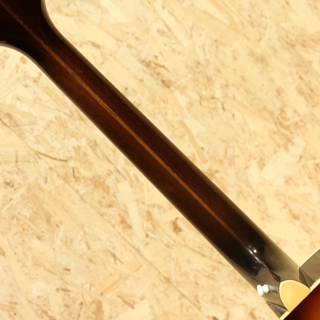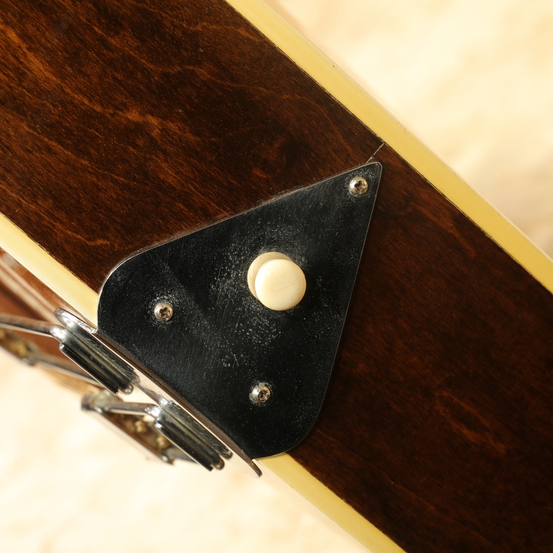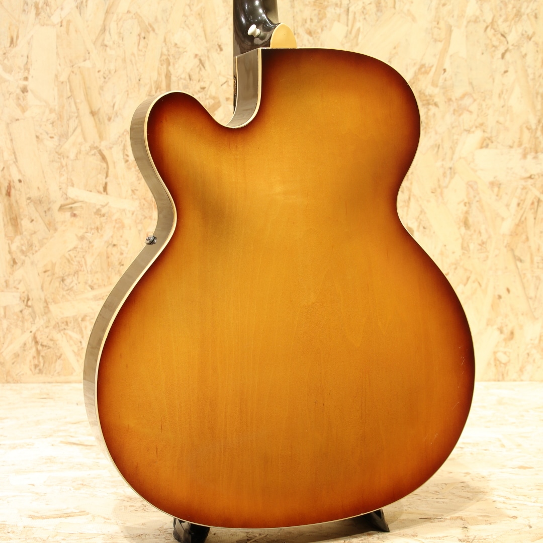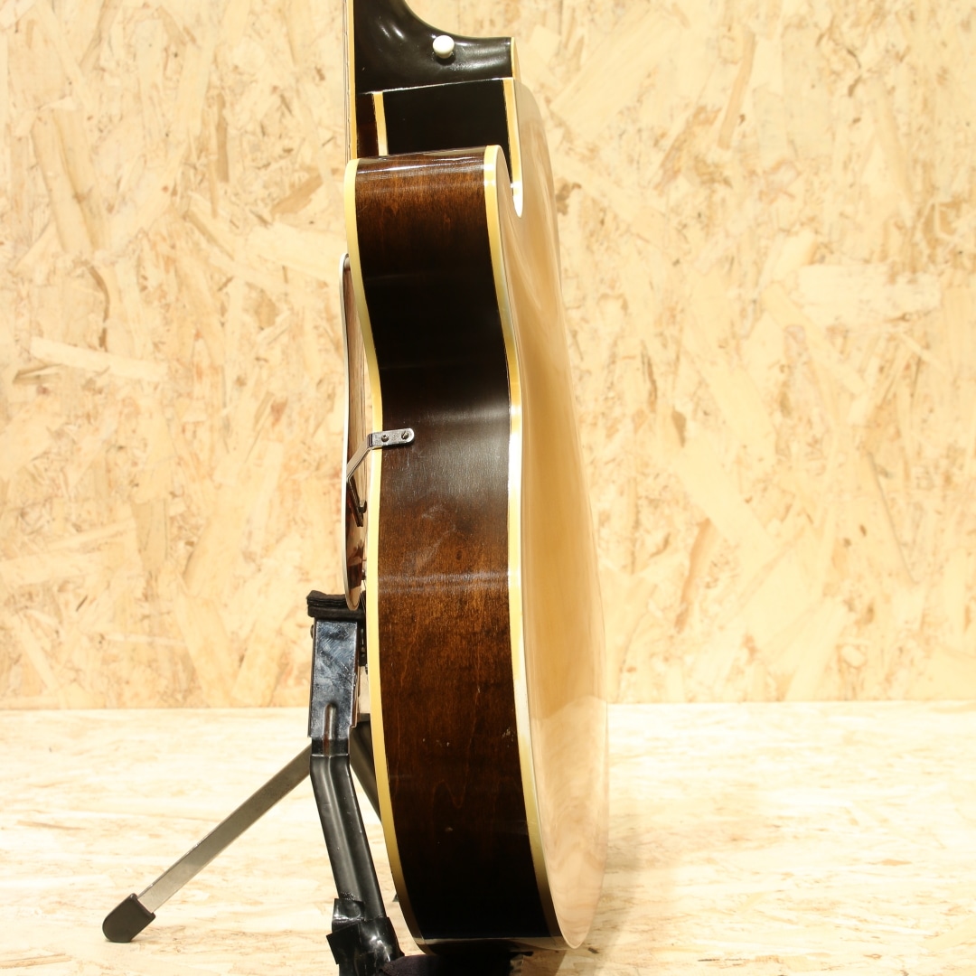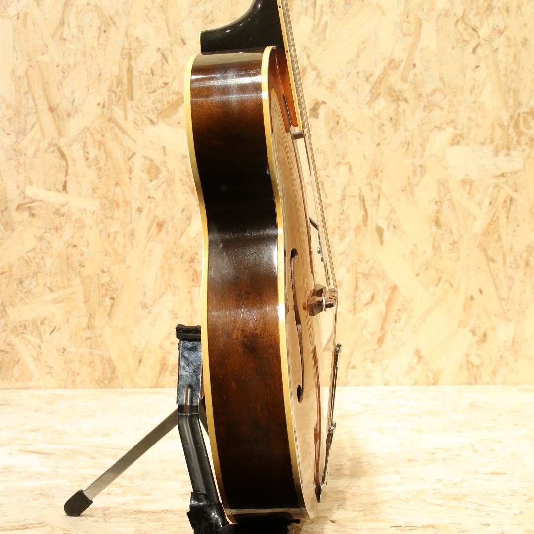 1873年の創業より長い歴史を持つエピフォンブランド。オリジナリティーの高いサウンドも持ち、アーチドトップ界ではGIBSONと席巻し人気を博したEpiphoneですが、のちの1950年代晩年期、経営陣の不仲などにより徐々に衰退。1957年以降はライバル社であったギブソンに買収され、工場がカラマズーに統合されました。本器はカラマズー工場製となった後の1959年製造"Triumph"。17 3/8’’ボディーワイド、スプルーストップ、メイプルサイド&バック、センターに別の木を挟んだマホガニー3Pネック、ノッチが付いたダイアモンド指板ポジション、ハカランダ指板、ホワイトセルバインディング、バインディング付きのべっ甲柄ピックガード、Frequensatorテールピース搭載。1931年より発売されたTriumph。当初は16インチボディで製作されていましたが後に本器のサイズで製作が行われ、ピックガードの形状も変更となっています。1939年にはテールピースも本器のタイプに変更、この時点でほとんどの仕様が完成しました。エピフォンがギブソンに買収された後も工場は変われども、仕様に変更はほぼなく製造を継続。ノンカッタウェイモデルの廃番こそあれども、1970年まで製造が行われていました。ヘッドにはフランス語で百合の花を意味するフルール・ド・リスの意匠を取り入れたインレイ、真珠のような球状の装飾が施されています。ルックスからも分かる通り上位機種のモデルとなります。歯切れの良い明るい響き、アーチトップ特有のガランとしたサウンド。ウォームさや甘さをやや感じさせる響きを持ち、容積が大きい分サウンドにも余裕を感じさせ、ダイナミクスレンジも広い印象。強弱をつけた演奏にも追従し、音量も充分です。全体に細かな当てキズ、擦れキズ、サイドには若干の塗装欠け箇所やピックガードには若干の弾きキズが見られますが、60年以上を経た個体としては非常にキレイな状態をキープされています。細かなウェザーチェックこそ見られますが、状態からも大事に大事にと使われてきたことが窺えます。演奏性も良好にキープされており、ブリッジの上下幅も確保、トップ落ちも見られません。ギブソンでの製造に切り替わった直後の1本。独特のアーチトップサウンド、是非この機会にいかがでしょうか。