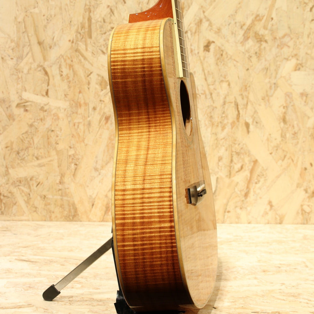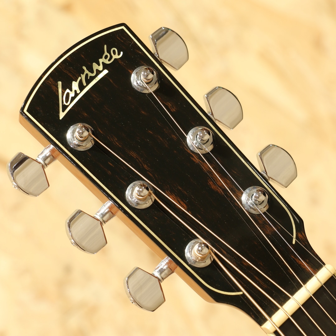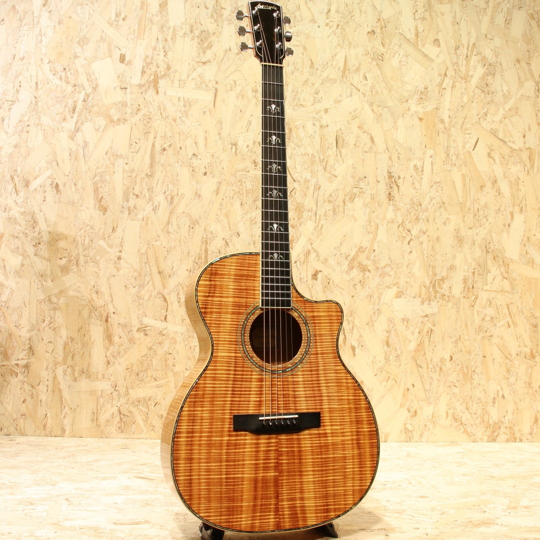 現在はカリフォルニアに建設された工房で生産していますが、ラリビーはもともと鉄弦ギター界にクラシックスタイルのボディを採用した元祖としても知られているカナダの名門。1967年のスタートと長い歴史を持っており、リンダ・マンザー、ウィリアム・ラスキン、サーゲ・ディ・ヤングなどの著名なルシアーも輩出しています。本器はOMシェイプにベネチアンカッタウェイを配したOMVをベースに極上のフィギャードコアボディを纏った"OMV-10 All Koa Custom"。1999年製バンクーバー製作期のUSED品。まばゆささえ感じる華麗な極上のフィギャードコアボディ、立体感のあるその杢目はホログラムかのような整った美しさです。エボニー指板&ブリッジ、マホガニーネック、メイプルボディバインディング、クリアピックガード、トップ構造はラリビー伝統の左右対称Xブレイシング、アバロン指板インレイ&ボディトリム&ロゼッタ、オリジナルロトマチッククロームメッキチューナー。まず特筆すべきはその使用される材の良質さ、ウッドサプライヤーの側面も持つジーンラリビー氏ならではの良材。この時点で眺めて良しの芸術作品と言えますが、肝要の演奏性やサウンドも流石と言えるラリビー。OMシェイプで抱えやすさ、カッタウェイでハイポジションまでの演奏性を獲得、あらゆるスタイルに適応できるオールマイティさを与えられています。ラリビー特有の音の芯が太く分離感や粒立ちの良いサウンド、ラリビー独自の左右対称Xブレーシング構造からくる非常にバランスの整った出音が特徴的です。コアらしい角の取れた柔らかく奥深い凛としたトーンとの相性も素晴らしく艶やかな音色を奏でてくれます。搭載ピックアップはFISHMAN社製アンダーサドルピエゾピックアップ。輪郭のハッキリとしたラインサウンドはバンド等でも埋もれずにアコギサウンドを出力。本体にはコントローラーはついておらず、お好みで別途プリアンプなどを使用しての調整となります。セパレーションにも優れた出音はストロークやフィンガーを問わない万能さを持った1本です。27年の経過を感じさせない美しい状態が保たれた本器。ピックガード上の弾きキズやヘッドプレート3弦上あたりの薄い擦り傷等細かな使用感はありますが、よく見てわかる程度のものです。金属パーツも若干のくすみはあるものの、しっかりと輝きは保たれています。ネックコンディションも良好です。ウッドサプライヤーとしての顔も持つジーンラリビー本人が世界中を飛び回ってセレクトした上質の素材と、洗練された木工技術から成る艶やかな音色。近年ではなかなか見かけることのできない極上フィギャードコアを是非お手元でご堪能くださいませ。オリジナルハードケースが付属します。