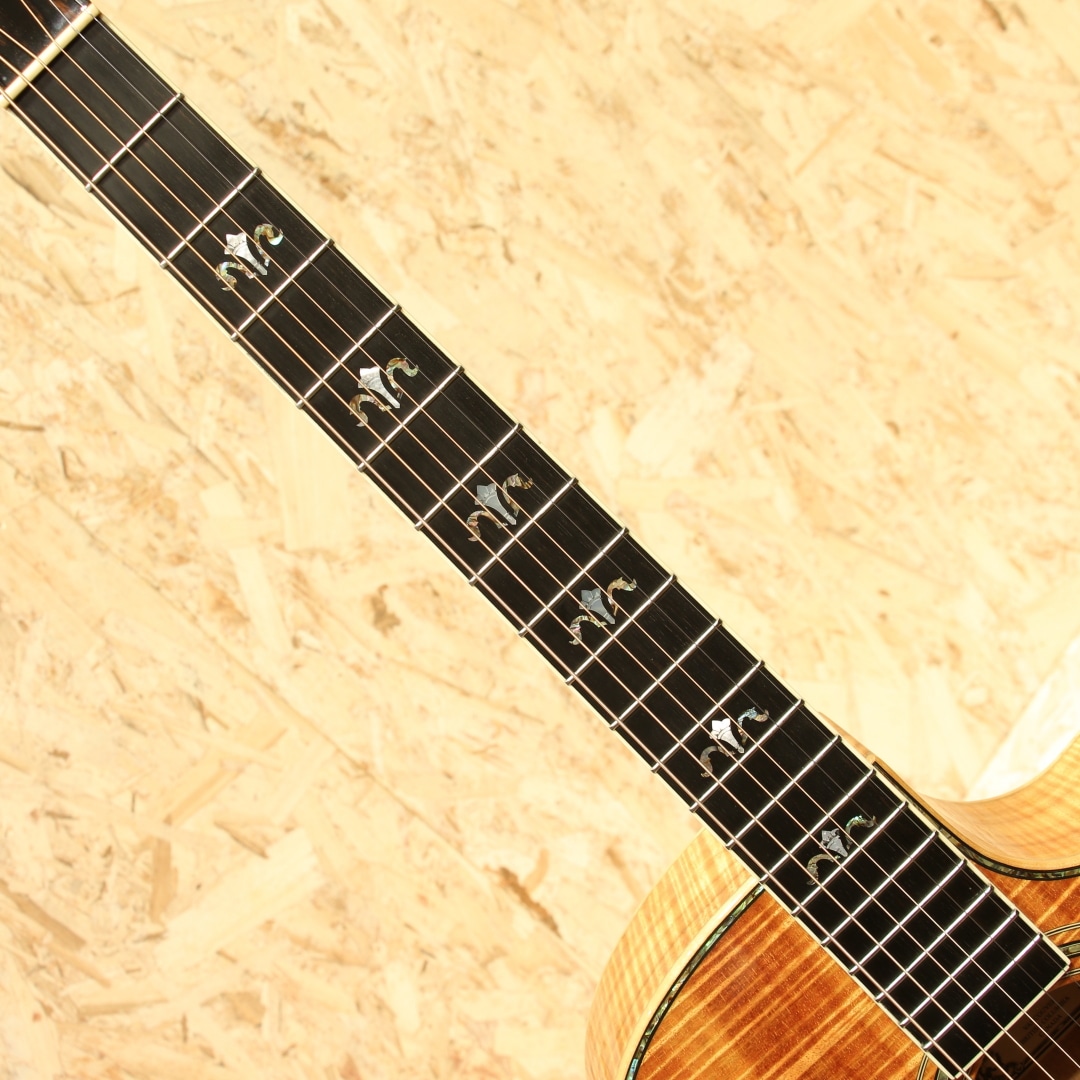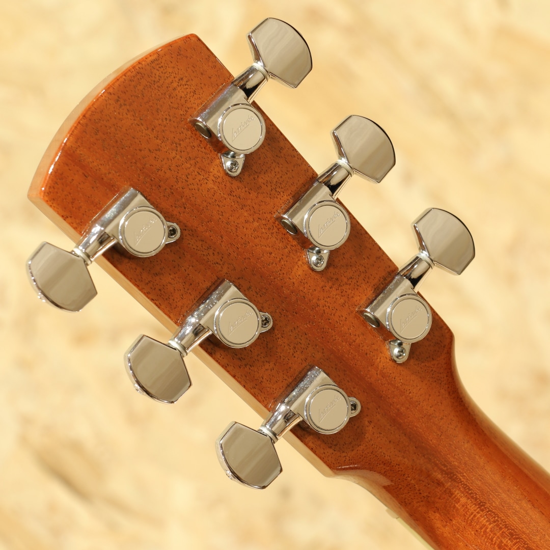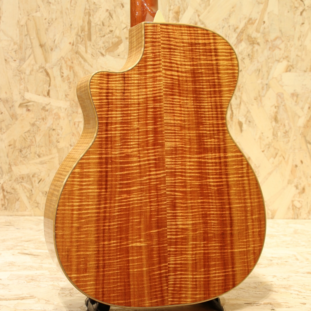 現在はカリフォルニアに建設された工房で生産していますが、ラリビーはもともと鉄弦ギター界にクラシックスタイルのボディを採用した元祖としても知られているカナダの名門。1967年のスタートと長い歴史を持っており、リンダ・マンザー、ウィリアム・ラスキン、サーゲ・ディ・ヤングなどの著名なルシアーも輩出しています。本器はOMシェイプにベネチアンカッタウェイを配したOMVをベースに極上のフィギャードコアボディを纏った"OMV-10 All Koa Custom"。1999年製バンクーバー製作期のUSED品。まばゆささえ感じる華麗な極上のフィギャードコアボディ、立体感のあるその杢目はホログラムかのような整った美しさです。エボニー指板&ブリッジ、マホガニーネック、メイプルボディバインディング、クリアピックガード、トップ構造はラリビー伝統の左右対称Xブレイシング、アバロン指板インレイ&ボディトリム&ロゼッタ、オリジナルロトマチッククロームメッキチューナー。まず特筆すべきはその使用される材の良質さ、ウッドサプライヤーの側面も持つジーンラリビー氏ならではの良材。この時点で眺めて良しの芸術作品と言えますが、肝要の演奏性やサウンドも流石と言えるラリビー。OMシェイプで抱えやすさ、カッタウェイでハイポジションまでの演奏性を獲得、あらゆるスタイルに適応できるオールマイティさを与えられています。ラリビー特有の音の芯が太く分離感や粒立ちの良いサウンド、ラリビー独自の左右対称Xブレーシング構造からくる非常にバランスの整った出音が特徴的です。コアらしい角の取れた柔らかく奥深い凛としたトーンとの相性も素晴らしく艶やかな音色を奏でてくれます。搭載ピックアップはFISHMAN社製アンダーサドルピエゾピックアップ。輪郭のハッキリとしたラインサウンドはバンド等でも埋もれずにアコギサウンドを出力。本体にはコントローラーはついておらず、お好みで別途プリアンプなどを使用しての調整となります。セパレーションにも優れた出音はストロークやフィンガーを問わない万能さを持った1本です。27年の経過を感じさせない美しい状態が保たれた本器。ピックガード上の弾きキズやヘッドプレート3弦上あたりの薄い擦り傷等細かな使用感はありますが、よく見てわかる程度のものです。金属パーツも若干のくすみはあるものの、しっかりと輝きは保たれています。ネックコンディションも良好です。ウッドサプライヤーとしての顔も持つジーンラリビー本人が世界中を飛び回ってセレクトした上質の素材と、洗練された木工技術から成る艶やかな音色。近年ではなかなか見かけることのできない極上フィギャードコアを是非お手元でご堪能くださいませ。オリジナルハードケースが付属します。
