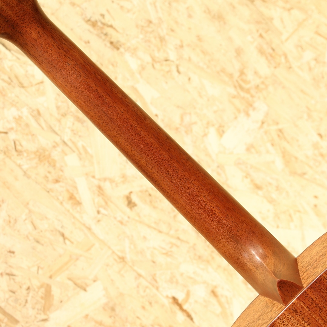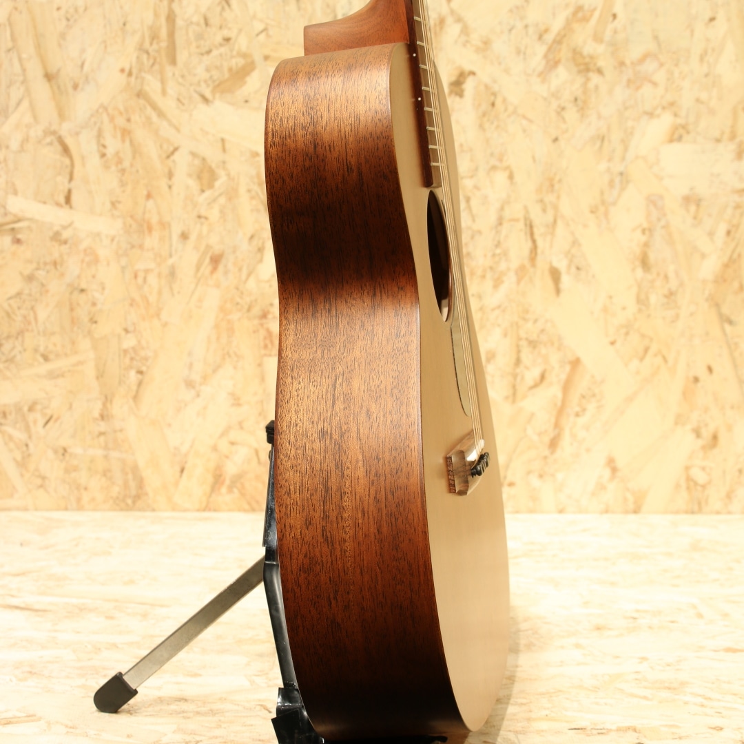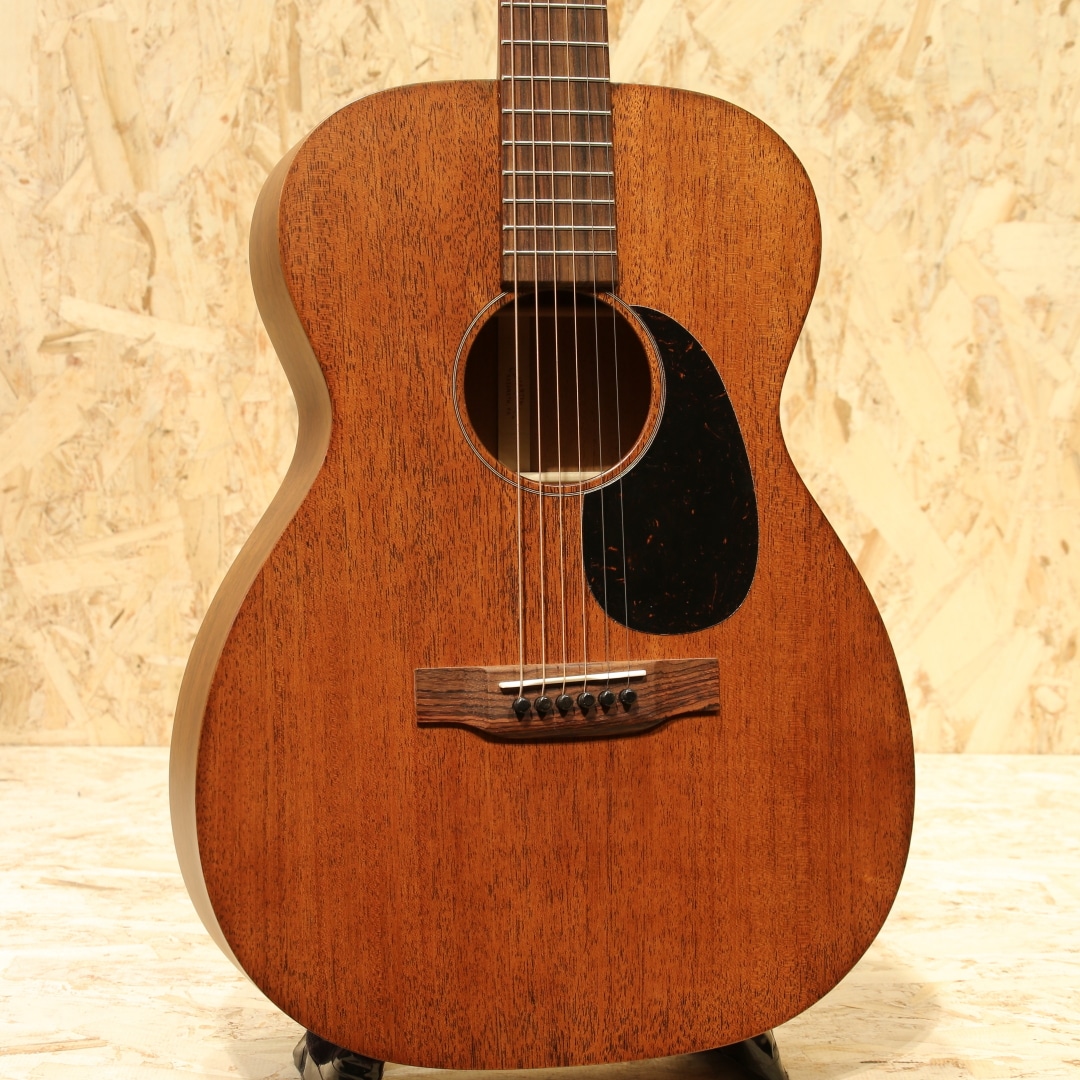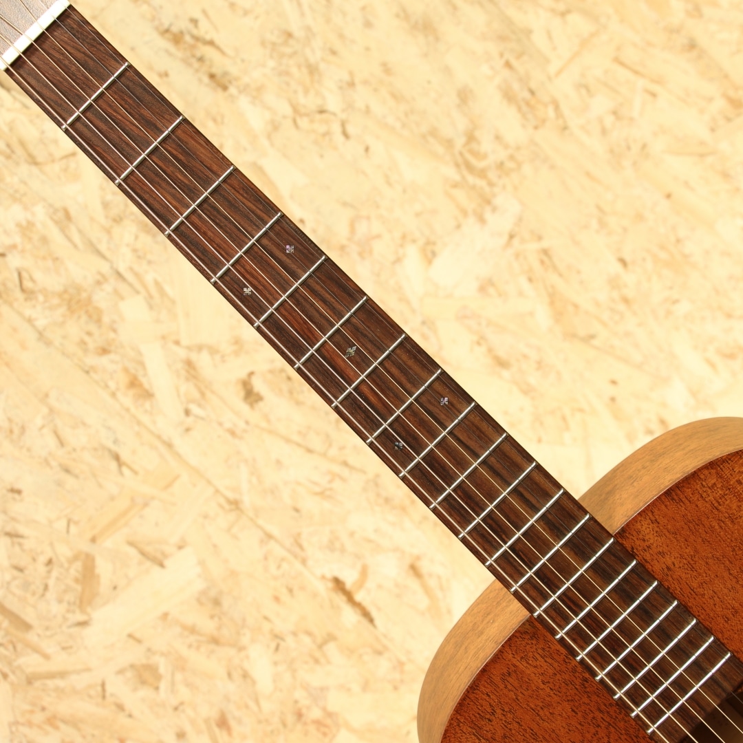 スタイル15の歴史は古く、1935年から製造されていました。1944年には一度製造中止となりましたが1948年には復活、1963年にも製造中止となりその後復活するのは1997年からと長い年月を経て復活しています。本器はスタイル15の伝統を受け継ぎ現代的な仕様を織り交ぜて製作されるオール単板マホガニーボディ"15"シリーズ、OOサイズの"OO-15M"です。マホガニーボディ、マホガニーネック、インディアンローズウッド指板&ブリッジ、ショートパターンダイアモンド&スクエア指板インレイ、グローバーオープンバックペグ、べっ甲柄ピックガード、ノンスキャロップドXブレイシング。オールドマーチンを彷彿とさせる風格あるルックス、ボディの縁取りをはじめ極力装飾を省いたシンプルなデザインと茶系の暖かみある色味が魅力的です。OOOサイズよりも一回り小ぶりなサイズ感、より抱えやすくなっており音の立ち上がりも早い点もメリット。レンジ感こそ大きいサイズのギターに譲りますが、中域の密度や押し出し感は小ぶりなサイズのギターにしかないメリットです。音色もバランス感も整っている為細やかなフレーズにも追従しやすく、その運指をサポートする薄めのグリップにナット幅。現在ではレギュラーモデルのほとんどが44.5mmナット幅ですが、このモデルは42.9mmと握り込みやすい幅です。OOサイズながらロングスケールを持ち、やや張りのあるサウンドを獲得しています。ダウンチューニングでもテンションを稼げるためソロギター等でも活躍してくれそうな仕様です。出音自体は開放的で明るくスッキリとした音色。スプルーストップに比べ広がりのあるサウンドで、雑味のない快活なトーンです。低音成分が出すぎない乾いた音色、見た目にそぐわない心地の良いサウンドを響かせてくれます。ストロークではドライで元気なサウンドを、フィンガーでは落ち着いたトーンで繊細な音を奏でられます。このルックスは家に飾るとしても家具や部屋に馴染んでくれそうです。弾いて良し眺めて良し、飾って良しの3本揃ったギター。USA製マーチンとしては魅力的なお値段に確かな造りとサウンドで、これから初められる方の1本や気軽に扱えるサブギターとしてもオススメです。持ち運びしやくす保護性にも優れたオリジナルソフトシェルケースが付属します。