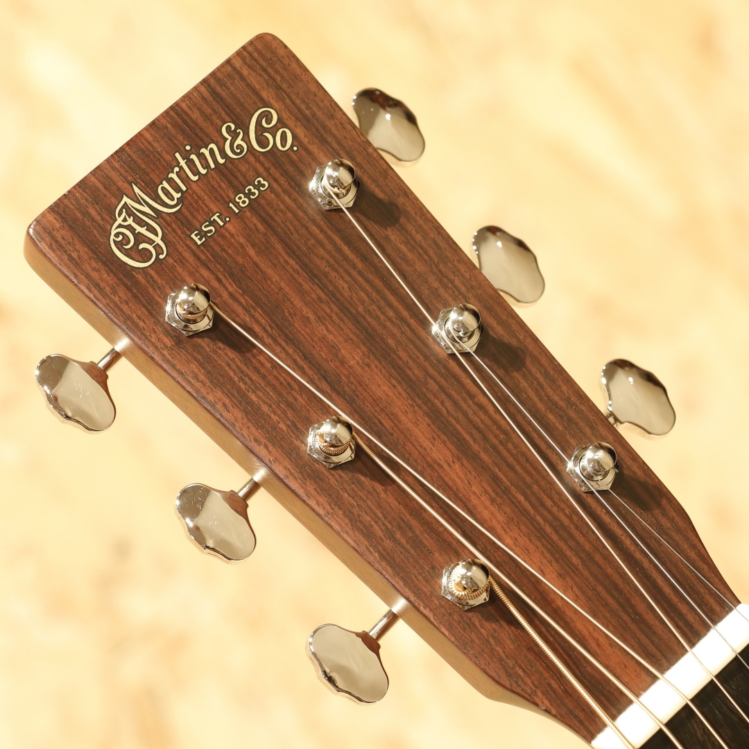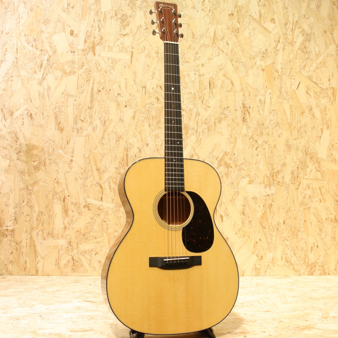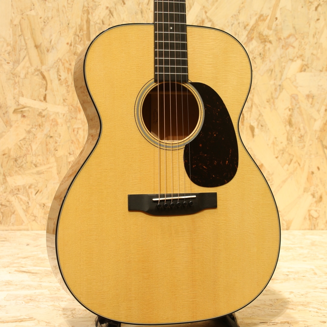 マーチンを代表する機種"OOO-28"と並び、もうひとつの側面を見せるリプルオーサイズのロングセラーモデル"OOO-18"。いくつもの仕様変更を繰り返した長い歴史の中で、2025年度に新たなる進化を遂げた最新版。スプルーストップ、マホガニーサイド&バック、エボニー指板&ブリッジ、チェッカーフラッグバックストリップ、グローバーオープンバックペグ、オールドスタイル18ドット指板インレイ、べっ甲柄ピックガード、44.5mmナット幅、ゴールデンエラ(GE)モディファイドローオーバルネックシェイプ、ゴールデンエラ(GE)スキャロップドXブレイシング。スタイル18では今回5点の仕様変更が加えられ大きなところではモダンデラックスのようなGEブレイス形状、GEネックシェイプへと変化したスタンダードシリーズ。細やかな部分ではナット形状の変化、ボリュート形状の変化、指板端の面取り処理、ネックヒールの形状、ブリッジ形状に変更が加えられています。ナット形状は2017年以前のように底面に角度を付けられたナット形状に、指板厚を薄くし指板端の面取り加工を施すことでより握り込みやすく手に当たらないような演奏性への配慮、ネックヒールはより滑らかな曲線を描く形状へ変化しこちらもよりヴィンテージライクなルックスにするための一端を担っています。何よりもブレイシングの変更が大きなところでしょう。GEブレイス形状のスキャロップブレイシングとなることでより戦前の仕様へとグッと近づきました。通常のブレイシングに比べ、Xの交点箇所のブレイシングに厚みを持たせより強固な支点となり、スキャロップが始まる位置が早く角をそぎ落とした形状。その為、トップ面の振幅が大きくなり、軽いタッチでもしっかりとした音粒をアウトプット、直前のモデルと比べても奥行きがありながら明瞭さも増したサウンドとなります。太いサウンドと明るく明朗とした響き、ドライブ感のあるトーンはそのままに。スタンダードな000らしいサウンドバランスの整った、レンジの広い柔らかな響きも持ち合わせます。フィンガリングもしやすく、このオープンなトーンをバーサタイルに使えます。ピックでの演奏ももちろんフィンガーピッキングでも気持ちよく反応してくれる本器。より深化したワールドスタンダードモデル。古きを訪ね新しきを知る、ゴールデンエラ期の良いところと現代に要求される演奏性を掛け合わせた現代のスタンダード。OOO-28に並びもうひとつの顔であり続けてくれる事を確信させてくれる"OOO-18"話題の最新仕様、是非お手元でご体感下さい。オリジナルハードケースが付属します。