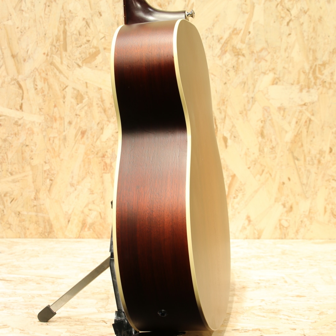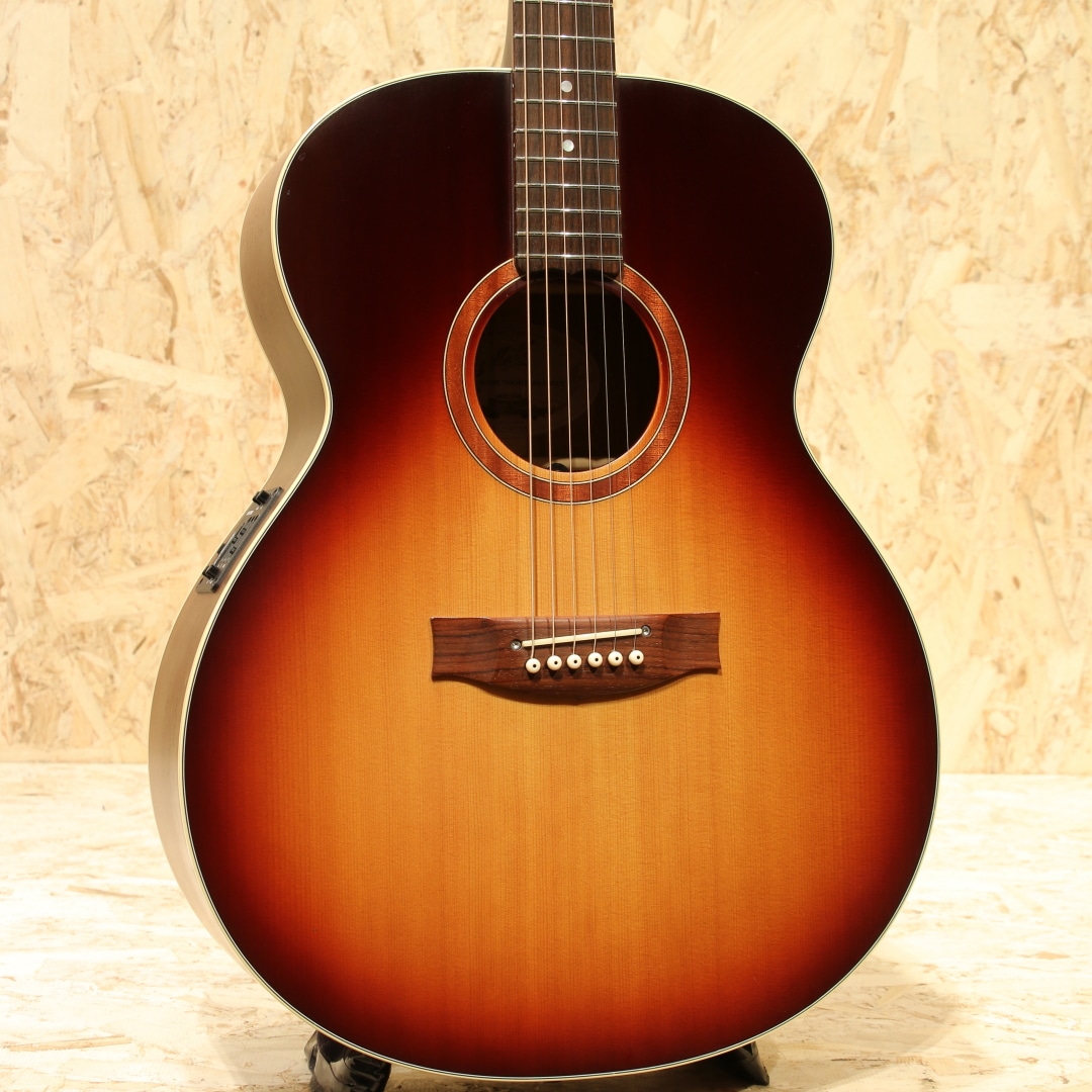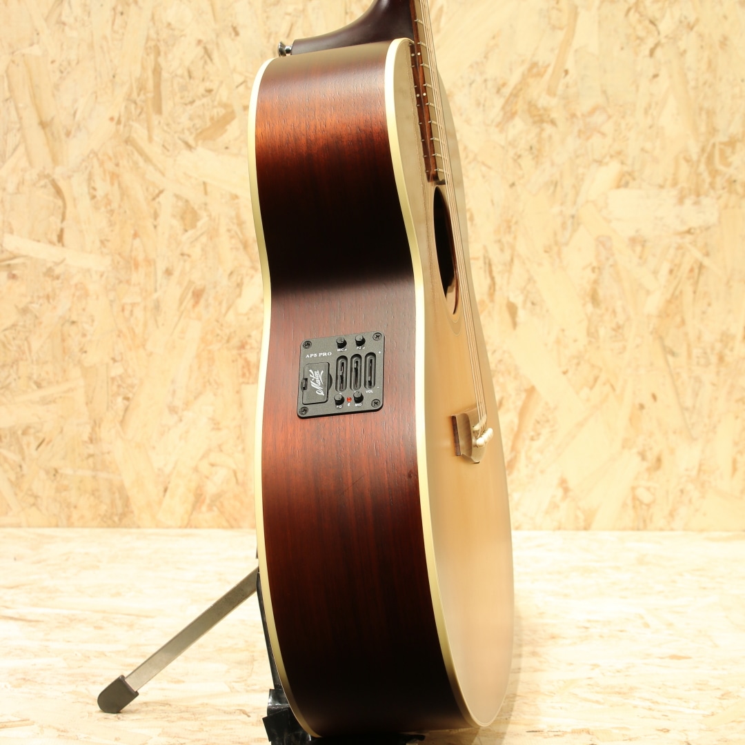 オーストラリアを代表する老舗ギターメーカー"MATON"。1946年、ギター製造会社がそれまでは存在しなかったオーストラリアに設立され、古くから地元ミュージシャンがこぞって愛用するブランドです。現在では世界を魅了するスーパーギタリスト"トミー・エマニュエル"が実践を通じてその高いポテンシャルを露呈し、音に煩いソロギタリストやスタジオ系ミュージシャンを中心に世界中で高く評価されています。本器はメイトンのマスタールシアーにより開発されたSolid Road Seriesより滅多に流通の見ないジャンボシェイプのレアモデル”SRS70J”のUSED品!レッドシダートップ、オーストラリアンブラックウッドサイド&バック、クイーンズランドメイプルネック、ローズウッド指板&ブリッジ、AP5Proプリアンプシステム搭載。トライトーンにて仕上げられたサンバーストは通常では製作されない特別カラー。メイトンブランドとしては珍しい16インチのジャンボボディ。低音から高音域にかけての音の立ち上がり反応が良く、弾きやすくバランスが取れたトーン、テクニカルなプレイにも追従する抜群の演奏性は健在。本サイズならではの押し出しのある中音域、ストローク時の和音のまとまったサウンドは歌モノのバッキングにもマッチします。搭載P.U.システムは"AP5Pro"。アンダーサドルピエゾとコンデンサーマイクのブレンドにより、アコギ本来の空気感から鋭くパワフルなピエゾサウンドまで手元での音作りが直感的に行えます。トレブル/ベースのEQに加えミドル/フリケンシーも備えられており、非常に幅広い実用的なセットアップが可能です。プレイの際に体が擦れやすいくびれやロウワバウトやサウンドホール周りに摩擦による塗装のテカリが見られますが、しっかりと弾き込まれてきたことがうかがえる使用感です。ヘッド先端にはクリップチューナーが取り付けられていたと思われる跡が確認できます。その他、表面的な細かな擦り傷などありますが、致命的な傷や修復歴はなく演奏性は抜群な状態がキープされております。ネックコンディションも大変良好、メイトンらしい低めな弦高設定でフィンガースタイルからフラットピックを使ったテクニカルなスタイルまで難なくご使用いただけます。やや強めのピッキング時には音のビビりなど見られますが演奏性を優先してのセッティングとなっています。アグレッシブなアタック音から倍音の繊細さまでリアルにアウトプットしてくれるラインサウンド。本器の現行仕様はスプルーストップの為、それとは異なる違った音色をお楽しみいただけます。是非お試しください。オリジナルハードケースが付属します。