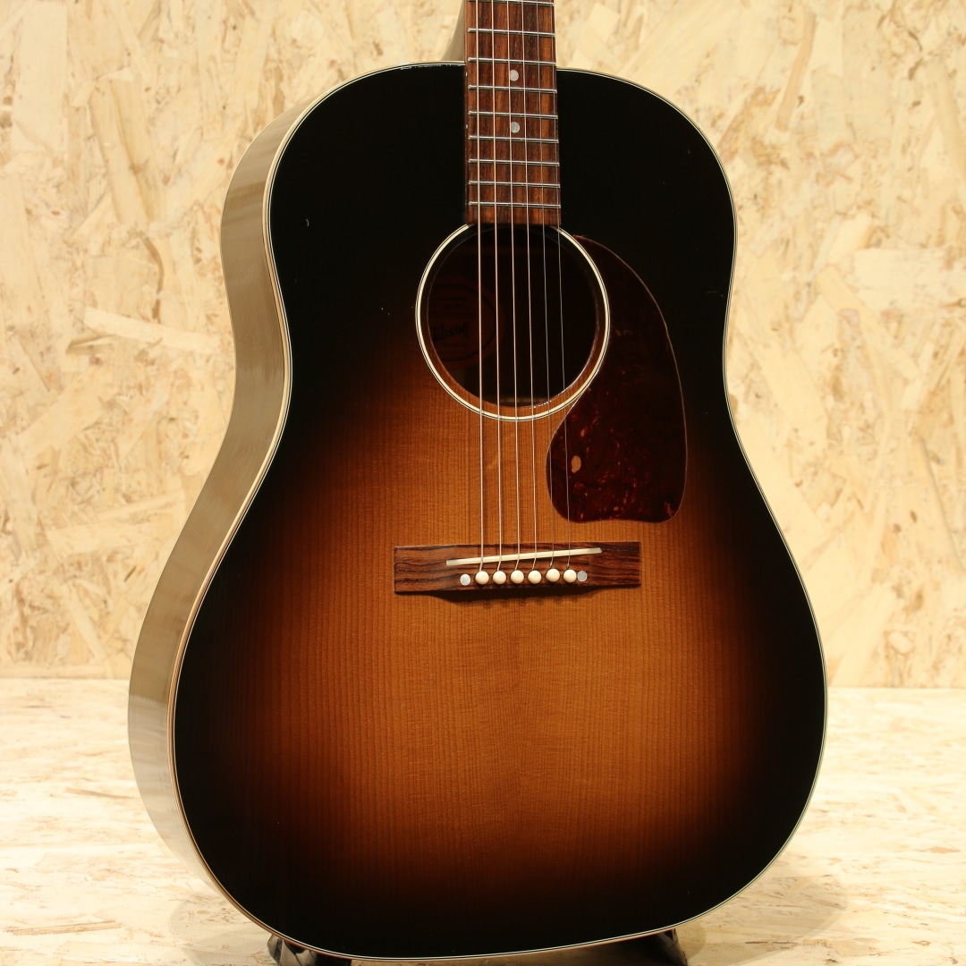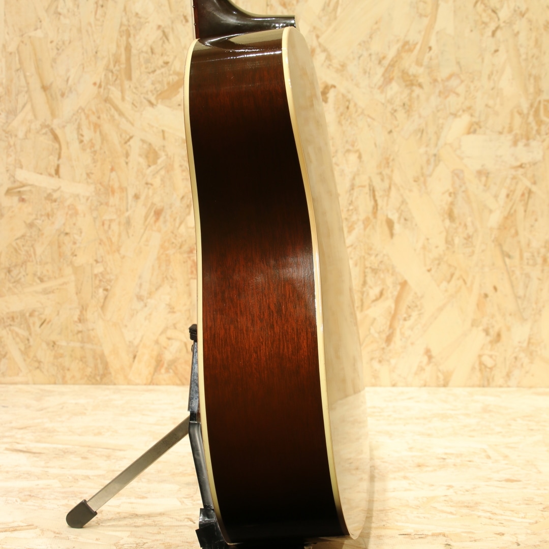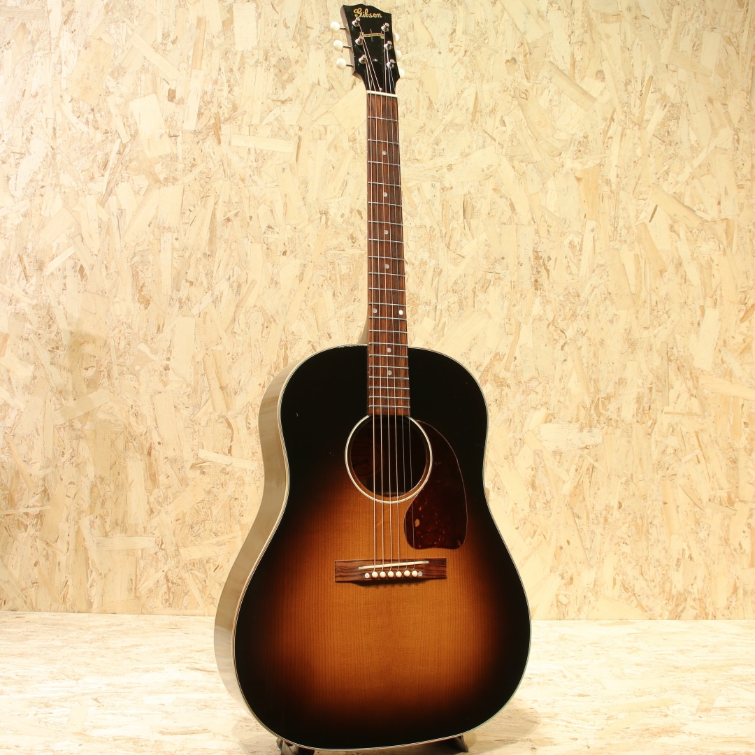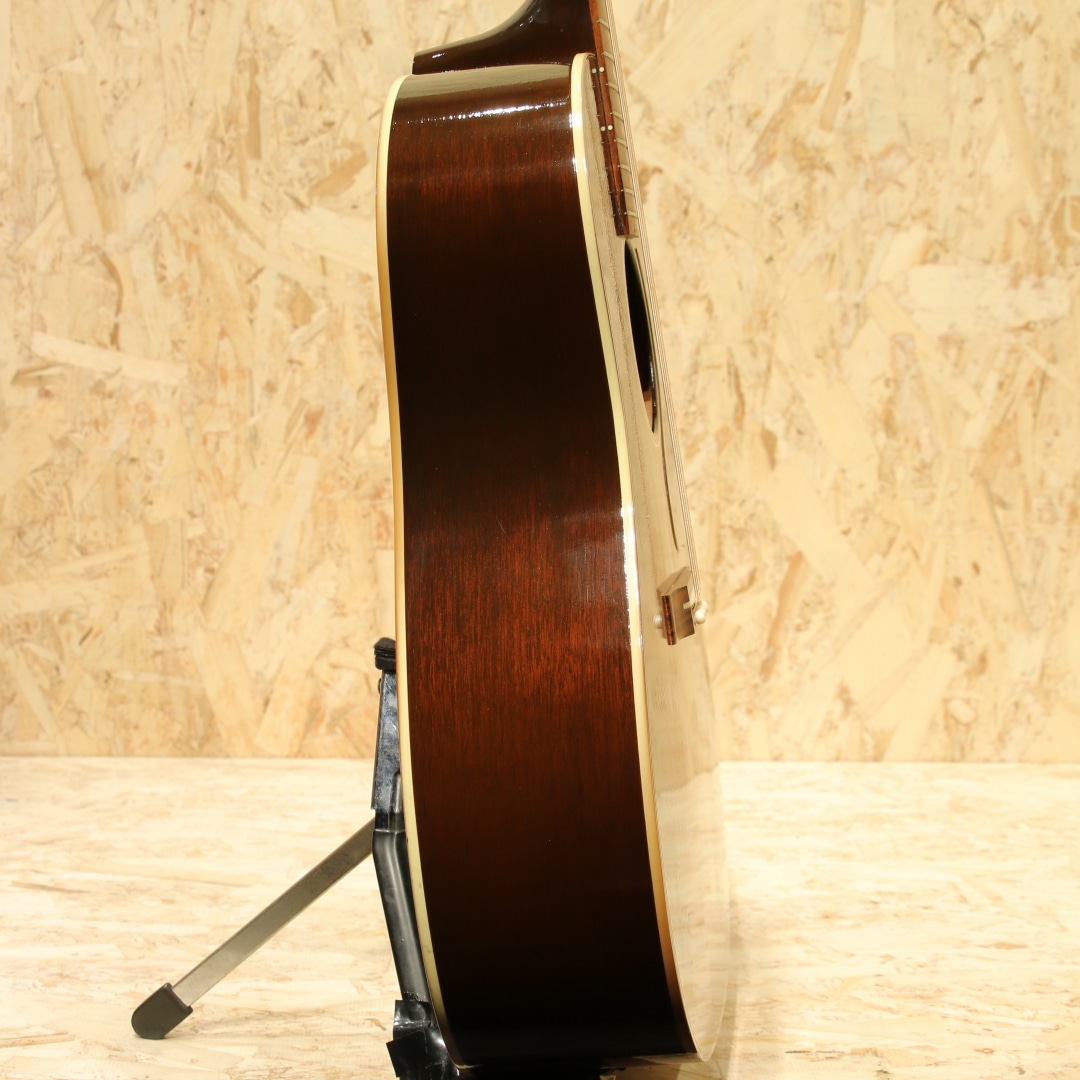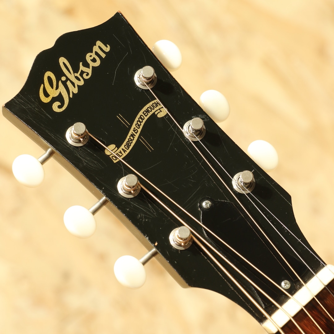 “ワークホース”誕生の原点!バナーモデルを復刻。ギブソンのラインナップ中、国内で最も人気の高いモデルJ-45。こちらは現行の1942 J-45 Bannerの前身となるカスタムショップ製”J-45 Banner”2017年製USED品。サーマリーエイジド加工の施されたレッドスプルーストップ、マホガニーサイド&バック、ローズウッド指板、シングルリングロゼッタ、レクタングルブリッジ、スモールガード、ロングサドル、スクリプトロゴ&バナーロゴ、クルーソンスタイルペグ、ヴィンテージ風艶消し仕上げのVOS Thinフィニッシュ。より良い鳴りとレスポンスの実現のためニカワで接着されたネック。ネックはベースボールバットネックと呼ばれた極太のものではなく、やや持ち応えを与えた程度の握りやすいラウンドシェイプを採用しております。弾いた時に弾き手に伝わる胴鳴り、深い振動。ストロークしたときの迫力、豪快さはこのモデルならではの迫力のサウンド。本体自体も非常に軽量で、ピッキングアタック時ももたつかず軽やかな立ち上がり、それでいてしっかりと芯のある圧の強い音色。ザクザクとかき鳴らせばずっと弾いていたくなるようなパワフルでどこか心地よいサウンドを響かせます。サウンドホール周りのピッキングウェア、極薄シンフィニッシュがゆえの打痕や打ちキズに伴う塗装欠け、ヘッドプレートの弦交換跡キズなどしっかりと使い込まれてきたことが伺える使用感はありますが、木部割れなどはありません。センターシームに沿って塗装引けが確認できますが、木部までは達しておらず表面上のものです。ネックコンディションは大変良好、プレイアビリティもしっかり整えられており抜群の演奏性です。他の45モデルとは一線を画す本格モデル。是非ご検討ください。オリジナルハードケースが付属します。