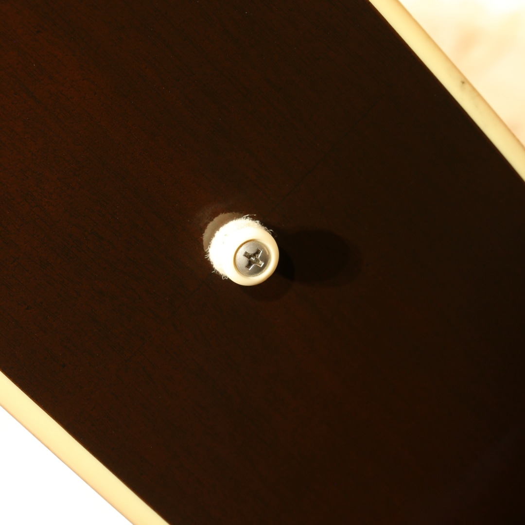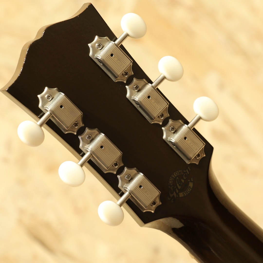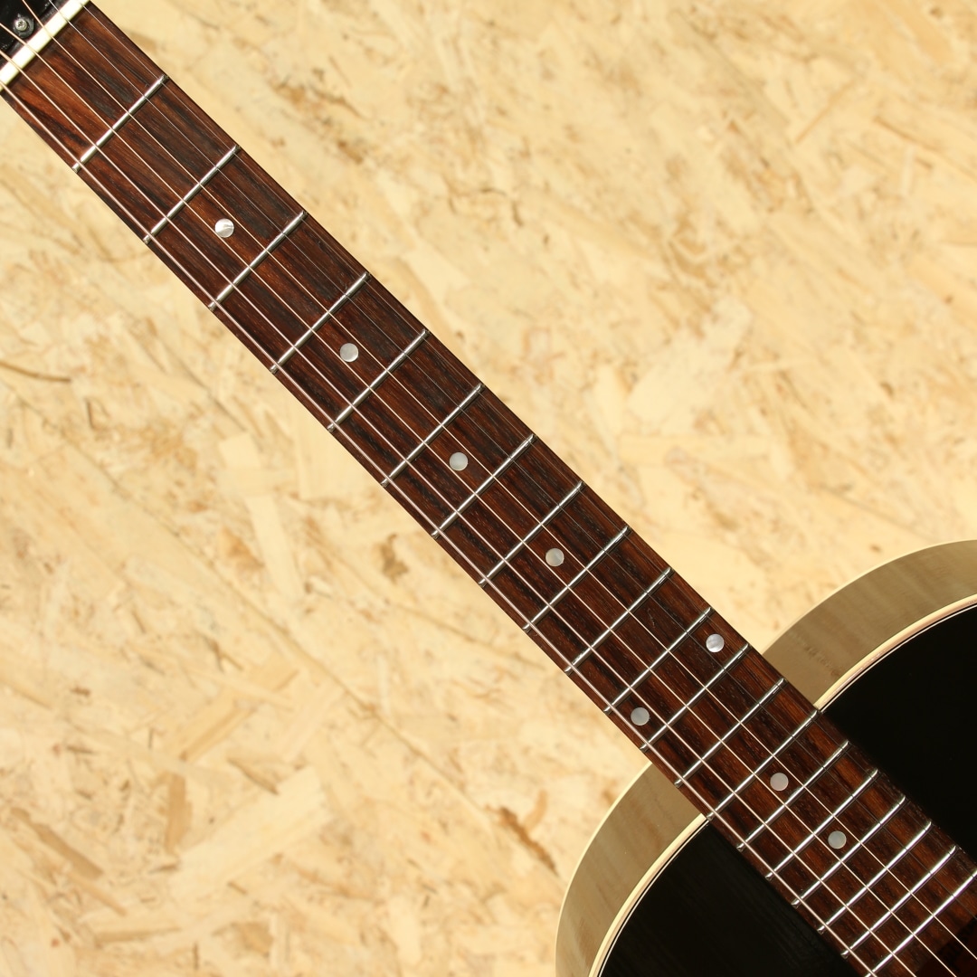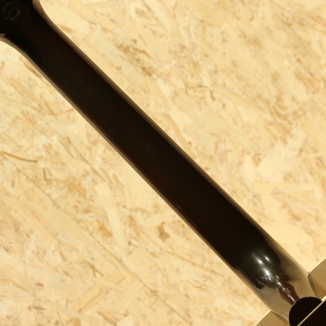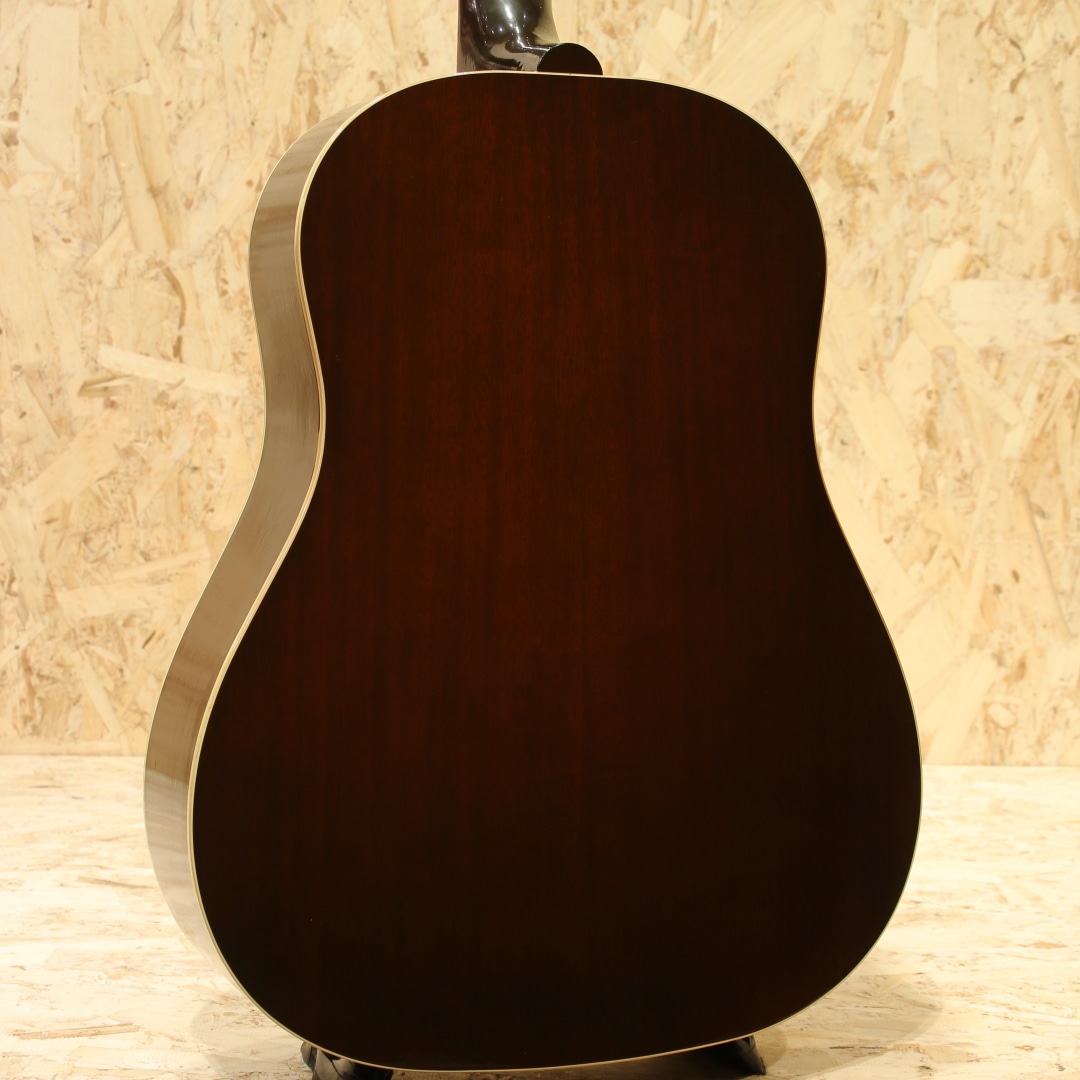 “ワークホース”誕生の原点!バナーモデルを復刻。ギブソンのラインナップ中、国内で最も人気の高いモデルJ-45。こちらは現行の1942 J-45 Bannerの前身となるカスタムショップ製”J-45 Banner”2017年製USED品。サーマリーエイジド加工の施されたレッドスプルーストップ、マホガニーサイド&バック、ローズウッド指板、シングルリングロゼッタ、レクタングルブリッジ、スモールガード、ロングサドル、スクリプトロゴ&バナーロゴ、クルーソンスタイルペグ、ヴィンテージ風艶消し仕上げのVOS Thinフィニッシュ。より良い鳴りとレスポンスの実現のためニカワで接着されたネック。ネックはベースボールバットネックと呼ばれた極太のものではなく、やや持ち応えを与えた程度の握りやすいラウンドシェイプを採用しております。弾いた時に弾き手に伝わる胴鳴り、深い振動。ストロークしたときの迫力、豪快さはこのモデルならではの迫力のサウンド。本体自体も非常に軽量で、ピッキングアタック時ももたつかず軽やかな立ち上がり、それでいてしっかりと芯のある圧の強い音色。ザクザクとかき鳴らせばずっと弾いていたくなるようなパワフルでどこか心地よいサウンドを響かせます。サウンドホール周りのピッキングウェア、極薄シンフィニッシュがゆえの打痕や打ちキズに伴う塗装欠け、ヘッドプレートの弦交換跡キズなどしっかりと使い込まれてきたことが伺える使用感はありますが、木部割れなどはありません。センターシームに沿って塗装引けが確認できますが、木部までは達しておらず表面上のものです。ネックコンディションは大変良好、プレイアビリティもしっかり整えられており抜群の演奏性です。他の45モデルとは一線を画す本格モデル。是非ご検討ください。オリジナルハードケースが付属します。
