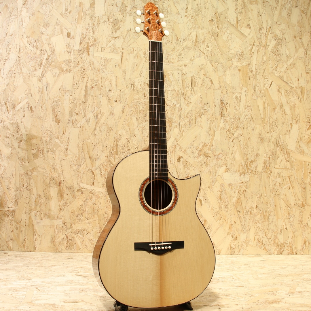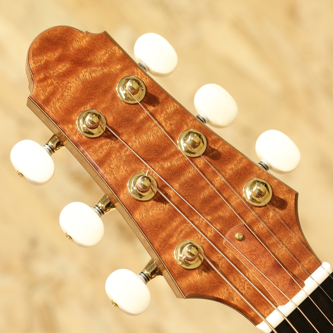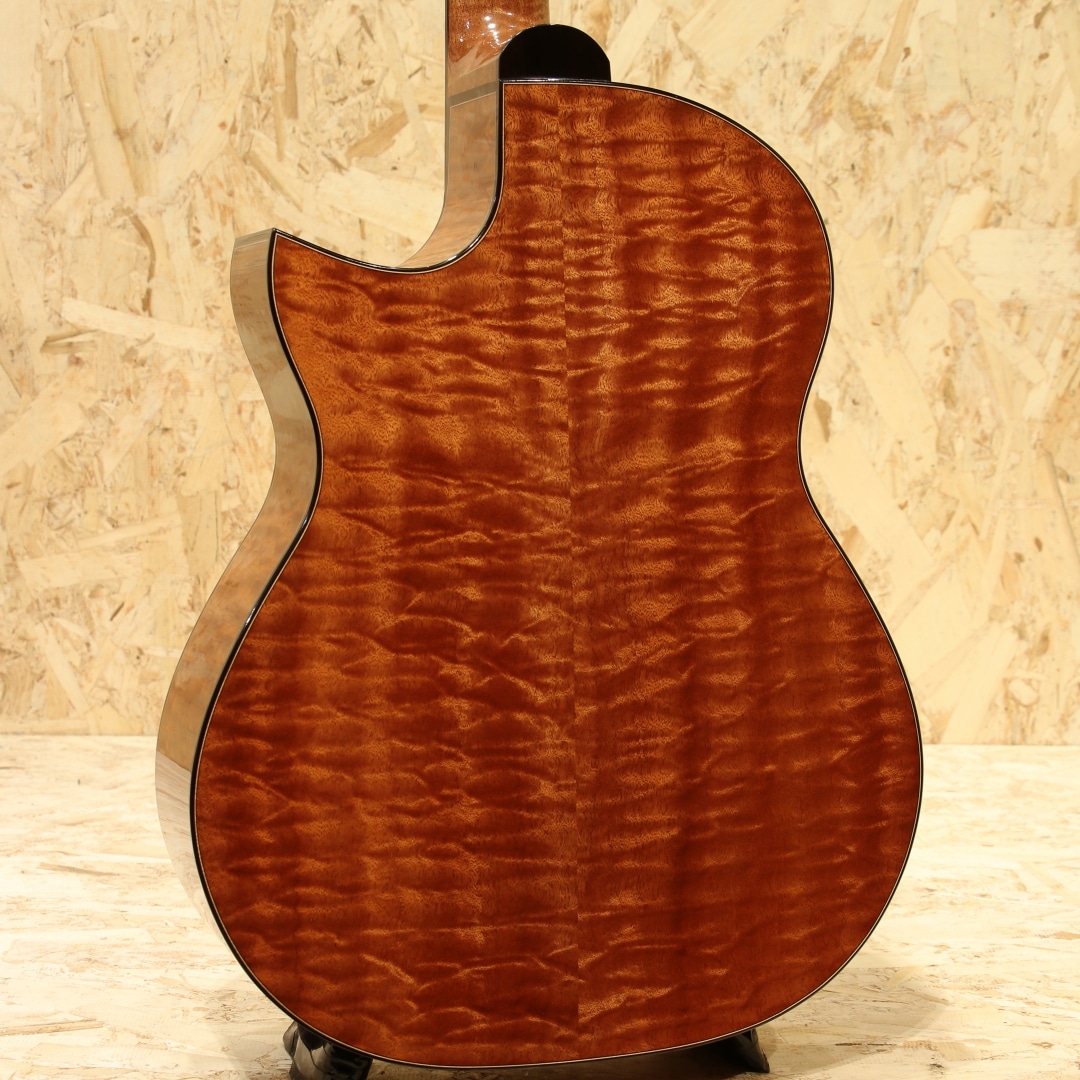 広島・似島にて自身の工房を構える向江良太/むかえりょうた 氏。カナダのマスタールシアーSergei de Jonge(サーゲ・デ・ヤング)の工房でノウハウを学び帰国。2015年より製作を開始し、30代前半ながら今年すでに11年目というキャリアを持つ実力派です。本器は三木楽器の節目を超えた2026年。スペシャルな一本をという事で肝入りでオーダーをしたスペシャルなRC フローレンタインカッタウェイモデル。今回のオーダーは節目を迎えた弊社創業201年目にあたり、肝いりでスペシャルなモデルをという要望で製作頂いた1本。サイドバックのサペリも約15インチのボトム幅を持つOM相当サイズのMukae Guitarsオリジナルシェイプ。ファットで粘りと弾力があるコシのあるサウンドのアディロンダックスプルース、極上の杢目で揺らめきのある美しいマスターグレードのキルテッドサペリサイドバック、同じく極上杢のキルテッドサペリネック、エボニー指板&ブリッジ、ゴトーSGL510ゴールドメッキペグ、キルテッドサペリとアバロンを組み合わせたリングロゼッタ。トップ構造にはエックスを軸としたオリジナルテーパーブレイシング、師匠譲りのサーゲヤング直伝の質の高い綿密なフレンチポリッシュ塗装。キルテッドサペリの柔らかさに適応するため、バックブレイシングの数を通常の4本から5本にカスタマイズ。内部の仕上げを高い番手で仕上げ内部を塗装しています。この作りによって向江氏いわく狙った通り、ローズ系を思わせる低音側へのワイドなレンジ感とコシはサペリサイドバックとは思えないほどの重厚さでかつマホガニー系の軽快で抜け感の良さをも併せ持つ素晴らしいサウンド。ミドルレンジのまとまりの良さと素晴らしいバランスのローの広がり、ウォームかつシルキーで滑らかな音立ちと繊細で細やかな音像をしっかりとフォーカスできるポテンシャル。徐々にタッチを持たせたアタックへの表現をこぼすことなく拾い上げてくれるような感覚でミニマム側へのレンジの広さも秀逸です。向江氏が持つボイシングのセンスが素晴らしく、サウンドの終着点をコントロールできる技術とセンスが組み合わさらなければ出しえない音色です。フォルム、曲線、仕上がり、一つ一つの作業がとにかく丁寧で高い技術の木工は一朝一夕では不可能です。努力を積み上げた本物の製作家だからこそ味わえる細部の凝ったディティールもあらゆる箇所に至るまでこだわりを感じられ流石と言えます。最若手ではずば抜けた技術と評価を持つ向江良太氏。ぜひお手に取ってみてください。心地よい世界にいざなってくれる極上品です。