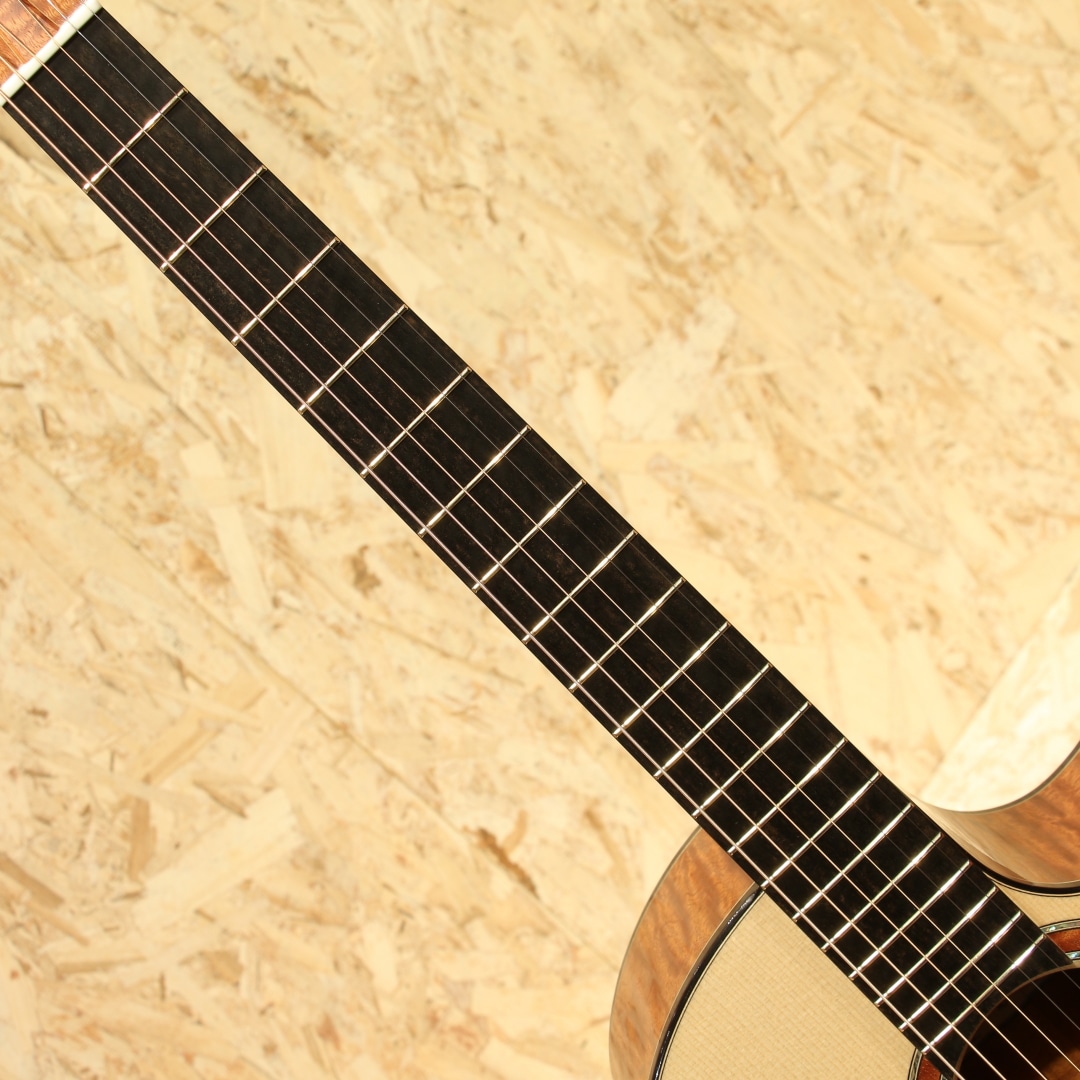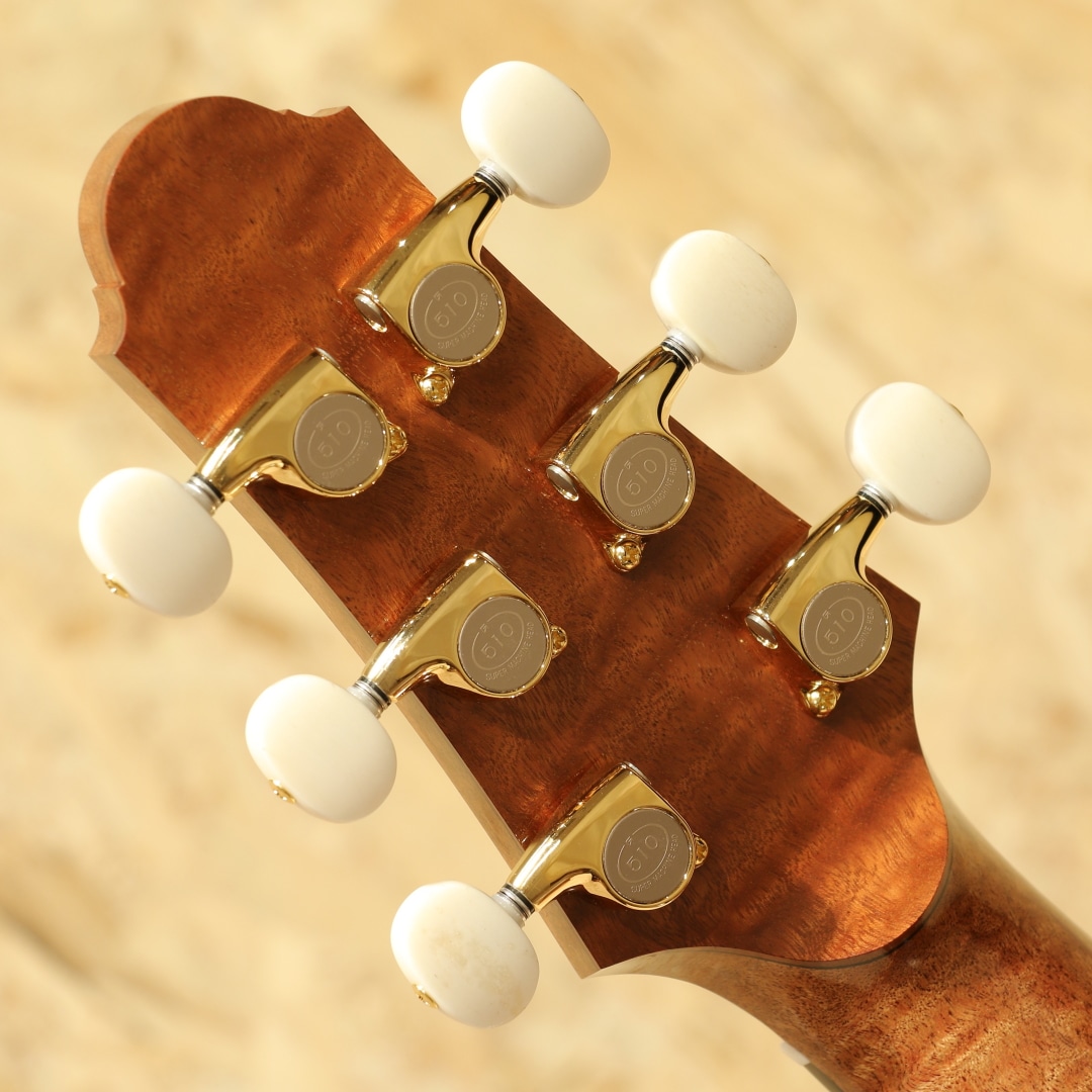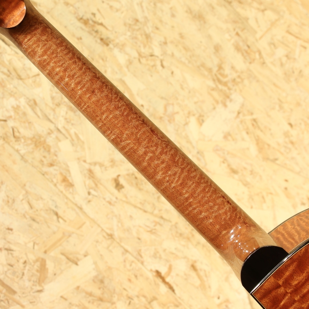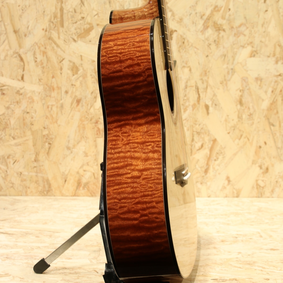 広島・似島にて自身の工房を構える向江良太/むかえりょうた 氏。カナダのマスタールシアーSergei de Jonge(サーゲ・デ・ヤング)の工房でノウハウを学び帰国。2015年より製作を開始し、30代前半ながら今年すでに11年目というキャリアを持つ実力派です。本器は三木楽器の節目を超えた2026年。スペシャルな一本をという事で肝入りでオーダーをしたスペシャルなRC フローレンタインカッタウェイモデル。今回のオーダーは節目を迎えた弊社創業201年目にあたり、肝いりでスペシャルなモデルをという要望で製作頂いた1本。サイドバックのサペリも約15インチのボトム幅を持つOM相当サイズのMukae Guitarsオリジナルシェイプ。ファットで粘りと弾力があるコシのあるサウンドのアディロンダックスプルース、極上の杢目で揺らめきのある美しいマスターグレードのキルテッドサペリサイドバック、同じく極上杢のキルテッドサペリネック、エボニー指板&ブリッジ、ゴトーSGL510ゴールドメッキペグ、キルテッドサペリとアバロンを組み合わせたリングロゼッタ。トップ構造にはエックスを軸としたオリジナルテーパーブレイシング、師匠譲りのサーゲヤング直伝の質の高い綿密なフレンチポリッシュ塗装。キルテッドサペリの柔らかさに適応するため、バックブレイシングの数を通常の4本から5本にカスタマイズ。内部の仕上げを高い番手で仕上げ内部を塗装しています。この作りによって向江氏いわく狙った通り、ローズ系を思わせる低音側へのワイドなレンジ感とコシはサペリサイドバックとは思えないほどの重厚さでかつマホガニー系の軽快で抜け感の良さをも併せ持つ素晴らしいサウンド。ミドルレンジのまとまりの良さと素晴らしいバランスのローの広がり、ウォームかつシルキーで滑らかな音立ちと繊細で細やかな音像をしっかりとフォーカスできるポテンシャル。徐々にタッチを持たせたアタックへの表現をこぼすことなく拾い上げてくれるような感覚でミニマム側へのレンジの広さも秀逸です。向江氏が持つボイシングのセンスが素晴らしく、サウンドの終着点をコントロールできる技術とセンスが組み合わさらなければ出しえない音色です。フォルム、曲線、仕上がり、一つ一つの作業がとにかく丁寧で高い技術の木工は一朝一夕では不可能です。努力を積み上げた本物の製作家だからこそ味わえる細部の凝ったディティールもあらゆる箇所に至るまでこだわりを感じられ流石と言えます。最若手ではずば抜けた技術と評価を持つ向江良太氏。ぜひお手に取ってみてください。心地よい世界にいざなってくれる極上品です。