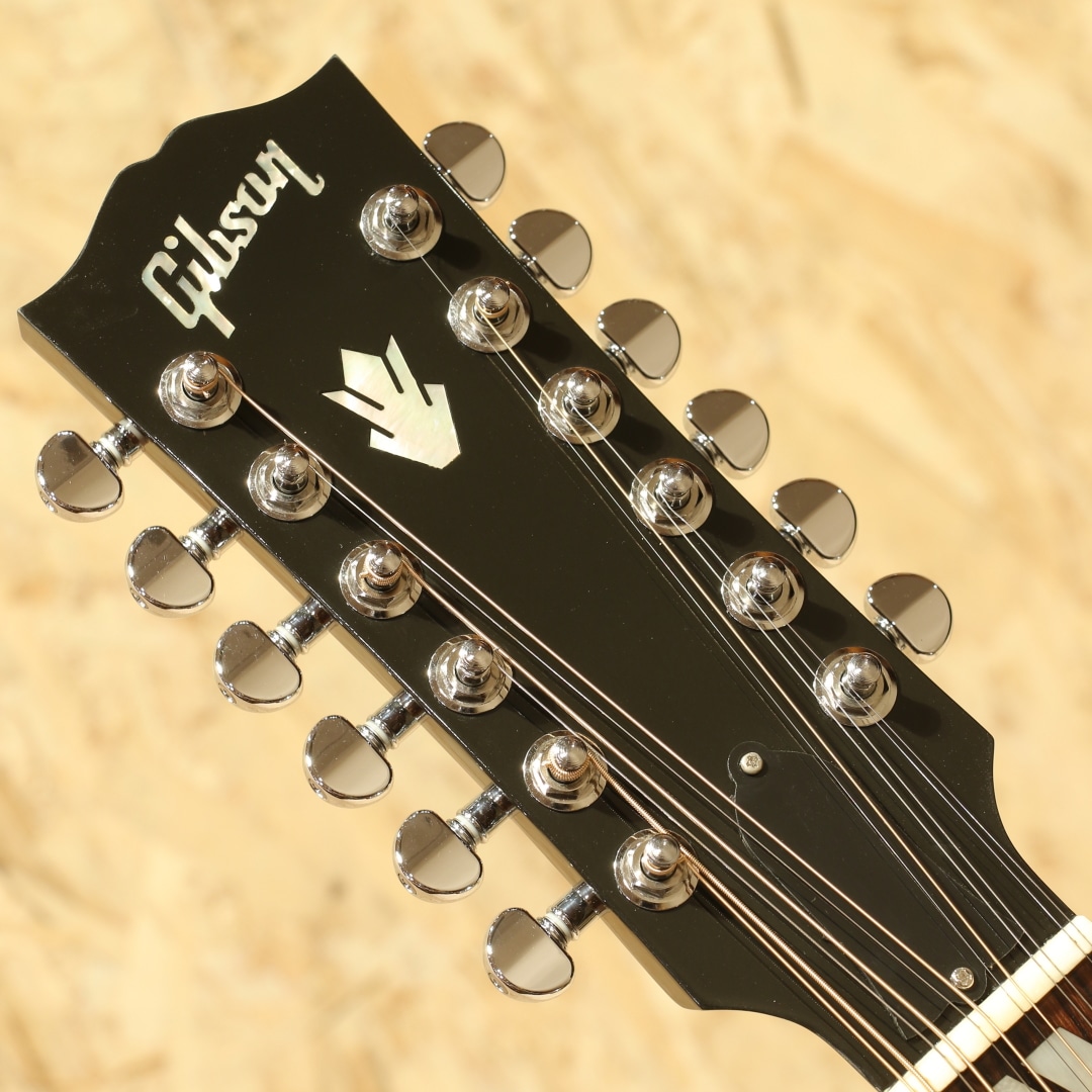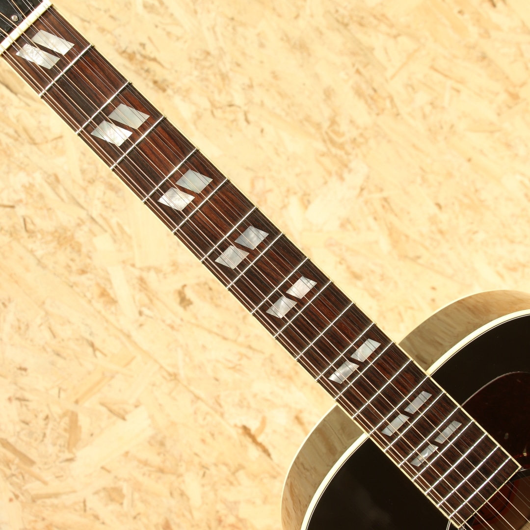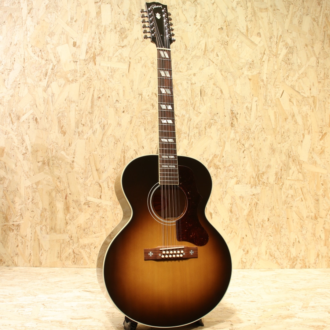 J-200よりも手の届く価格として1951年に発表されましたが当時はあまり注目をされず1959年までしか製作されていないJ-185。優れたトーンバランスはギブソンフラットトップの中で随一と言われ、J-200をダウンサイズした名器としての定評がありギブソンモンタナ工場職人曰く「ピアノの様なサウンド・バランス」と絶賛されるほどサウンドバランスに定評があります。エヴァリーブラザーズがこのサイズのギターを使用していた事でも有名で、現在では多くのアーティストからも支持されており、J-200と比べれば小ぶりで抱えやすく低域から高域までのバランスが非常に良く多彩なジャンルでお使いいただけます。本器は伝統的なルックスとモダンな演奏性を兼ね備えた12弦仕様の”J-185 12Strings”。2015年製USED品です。シトカスプルーストップ・フレイムメイプルサイド&バック、マホガニーネック、ローズウッド指板&ブリッジ、グローバーペグ、ダブルパラレログラムインレイ、べっ甲柄ピックガード、ピックアップにはL.R.Baggs Element VTC搭載。メイプル特有の煌びやかさと12弦が上手くマッチングし、明瞭且つダイナミックなサウンド。弦と弦がボディを通じて相互干渉するが故の馴染み合った音色。エフェクターのコーラスのように別の音がぶつかり合っているような感じも少なく、この響きは12弦ギターでしか出し得ず、イーグルスのホテルカリフォルニアのイントロなどでこのような12弦サウンドを体感することが出来ます。あのサウンドを出すならばやはり12弦でしか成し得ないでしょう。搭載ピックアップが定番のL.R.Baggs/Element VTC。ピエゾ独特の硬さの少ないナチュラルなラインサウンドは数多のミュージシャンから定評があります。サウンドホールに取り付けられた1vol.&1toneのシンプルなコントローラーは初めてエレアコを使用される方でも直感的な操作が可能です。トップ面1弦側ロウバウトにバインディングに沿った塗装引きの様に見える箇所があるものの全体を通して非常に綺麗なコンディションが保たれている本器。ネック・プレイコンディション共に良好。もともと定評のあるJ-185をベースにした本器は発売時同品番を某有名アーティストが使用していることから注目度が高まったものの国内入荷希少の為探されていた方も多いのではないでしょうか。是非お早目にお買い求めくださいませ。オリジナルハードケースが付属致します。