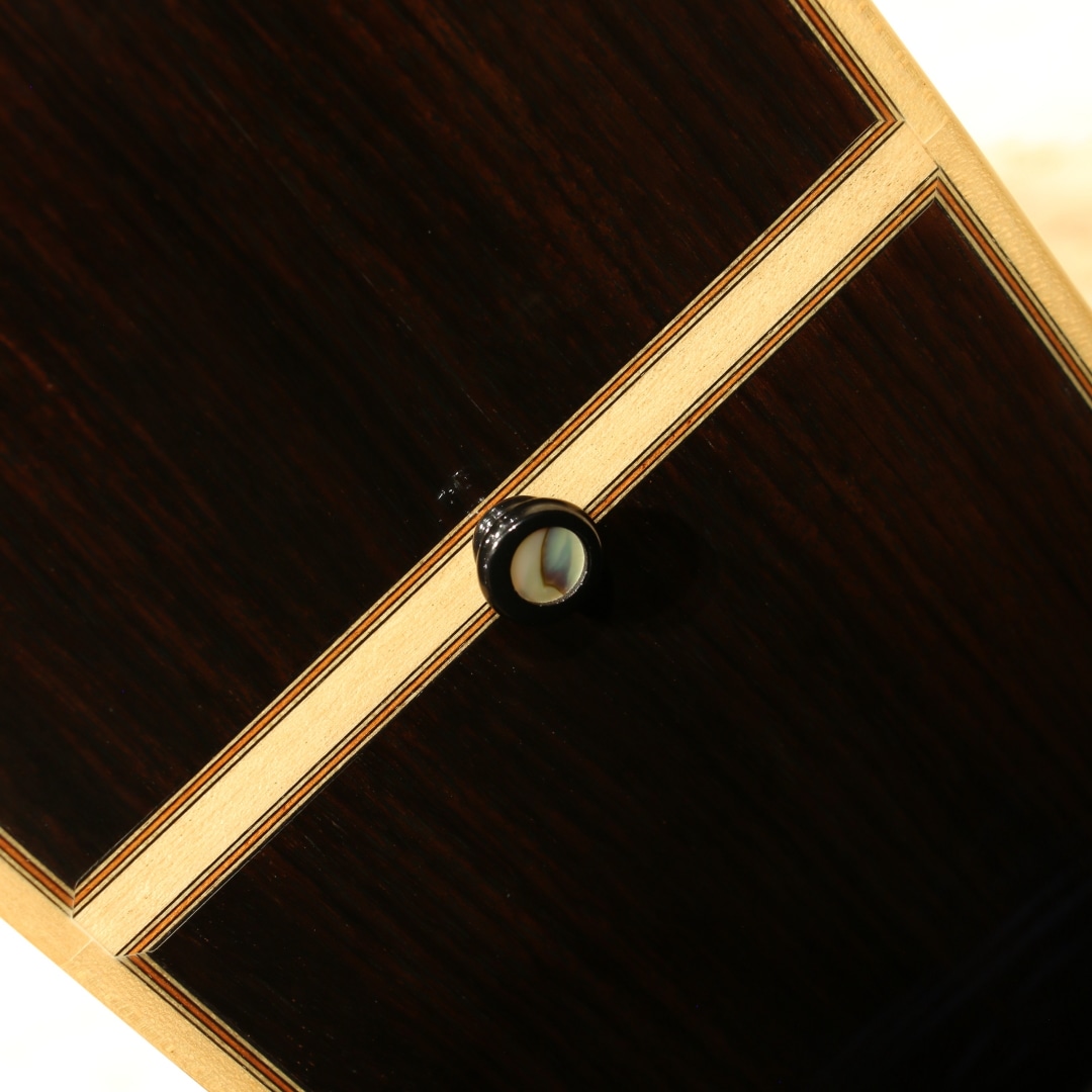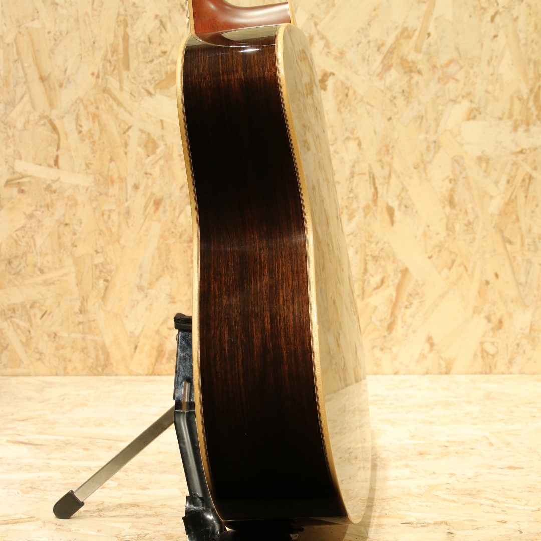 ヤマハを代表するギターとして、数多くの一流アーティストをはじめ、多くのギターファンに愛されてきたLシリーズ。“FG”シリーズの上位機種として1974年にL-31を発表して以来、時代のミュージックシーンを彩り、数多くのアーティ ストやギターファンに愛され、日本の音楽シーンを支えて参りました。"L=Luxury(豪華)"を冠にした本シリーズは、伝統を継承しながらも現代のニーズを反映させ、細部にわたり改良を施されたシリーズ。本器は1975年にラインナップされた”L-53”から約30年間に渡りヤマハLシリーズを代表しジャンボモデルの顔として脈々と受け継がれた”L55”の後継機種"LL-55DR"。1996年から2004年と短期間の製造ではありましたが、当時のLシリーズ最高峰機種として君臨していました。最高級えぞ松トップ、黒々とした端正な杢目が美しい最高級インディアンローズウッドサイド&バック、マホガニーネック、エボニー指板&ブリッジ、アバロンヘッドインレイ&指板インレイ、アバロンロゼッタ&ボディ&ヘッドトリム、メイプルヘッド&ボディバインディング、ブラックピックガード、TM-67Gゴールドペグ。75年の四天王発売を受け継いだ"L-55"モデルの正後継機種としても知られる本モデル。ふくよかで奥深くよく響く低域とヤマハ"L”ならではのサスティンの効いた高音は流石のサウンド。力強く弾けばガリンと響き、時に爪弾けば艶やかで優しげなトーンを響かせます。トップ面6側指板横やサイド面の1弦側ロウワバウト箇所に小さな打痕、トップ面のセンターシームに光の当たり加減により塗装の引きが見られますが、表面上のみで木部までは到達していません。製造から四半世紀の経過を思えばよく見られるもので、その他ヘッドプレートに薄っすらと塗装の白濁もございますが割れ修正などは無く使用感の少ない個体でゴールドペグの輝きもしっかり残っています。ネックコンディションも大変良好、薄手Vシェイプネックと整えられたプレイアビリティで演奏性も抜群。数多くの名演を支え、ジャパニーズフォークサウンドを作り上げてきたヤマハ四天王の後継機種。正統派アコースティックギターを是非ご体感ください。オリジナルハードケースが付属します。