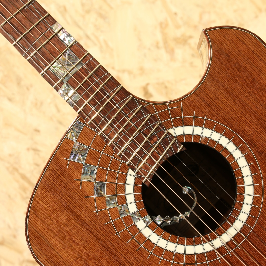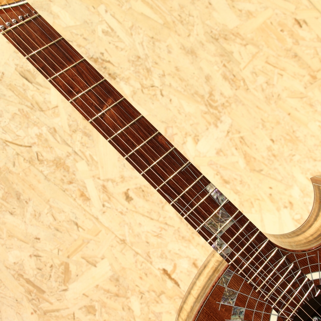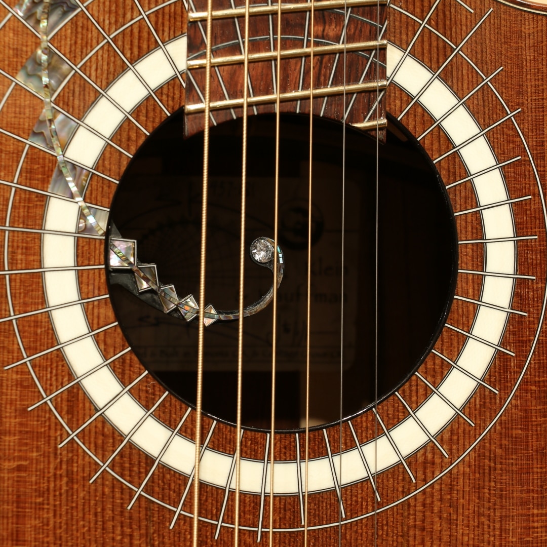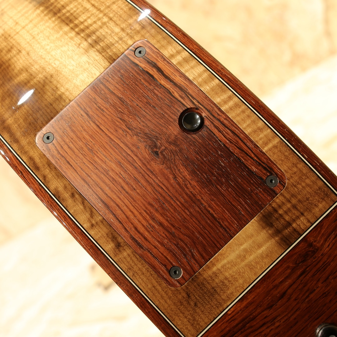 本作、5本目のFibonacciには18インチのボディー、カリフォルニアのレッドウッド、比較的柔らかい素材で低音がリッチ、高音トレブルもとても心地よく、音域のバランスに優れています。サイドバックにはオレゴンマートル(バックセンターはガテマランローズウッド)オープンで心地良い音質を実現します。California Bay Laurelとも呼ばれ、その独特な色合いや香りから、高級家具などに使用される希少な木材です。トリファイドされた西中部のメイプルネック、ガテマランローズウッド指板&ブリッジ。Klein本人がアメリカ国内に生息する素材で最良のものが作れると証明したいという思いから始まっています。アメリカ西海岸で採れる木材を使いたいという思いから、ガテマラからオレゴンまでトラックで運転してその間に積める木材でギターを作るという信念で選ばれています。フィボナッチスパイラルにインレイ装飾を施したアーティスティックなデザインは圧巻。フィボナッチ螺旋構図からインスパイアを受けた神秘的なデザインで天才的な感性を持つKleinの頭脳で昇華された芸術的な作品。ギターと黄金比に沿ったそのデザインは実際の音色を超えて訴えかけるような魅力があり、途端に虜にされます。サイドボトムには4点のスクリューで開け閉め出来る蓋を装着。スイッチが仕込まれており、ロゼッタの裏面に張り巡らされたLEDが店頭、電飾が照らすアートと揺らめきのあるまばゆいインレイは色気たっぷりです。