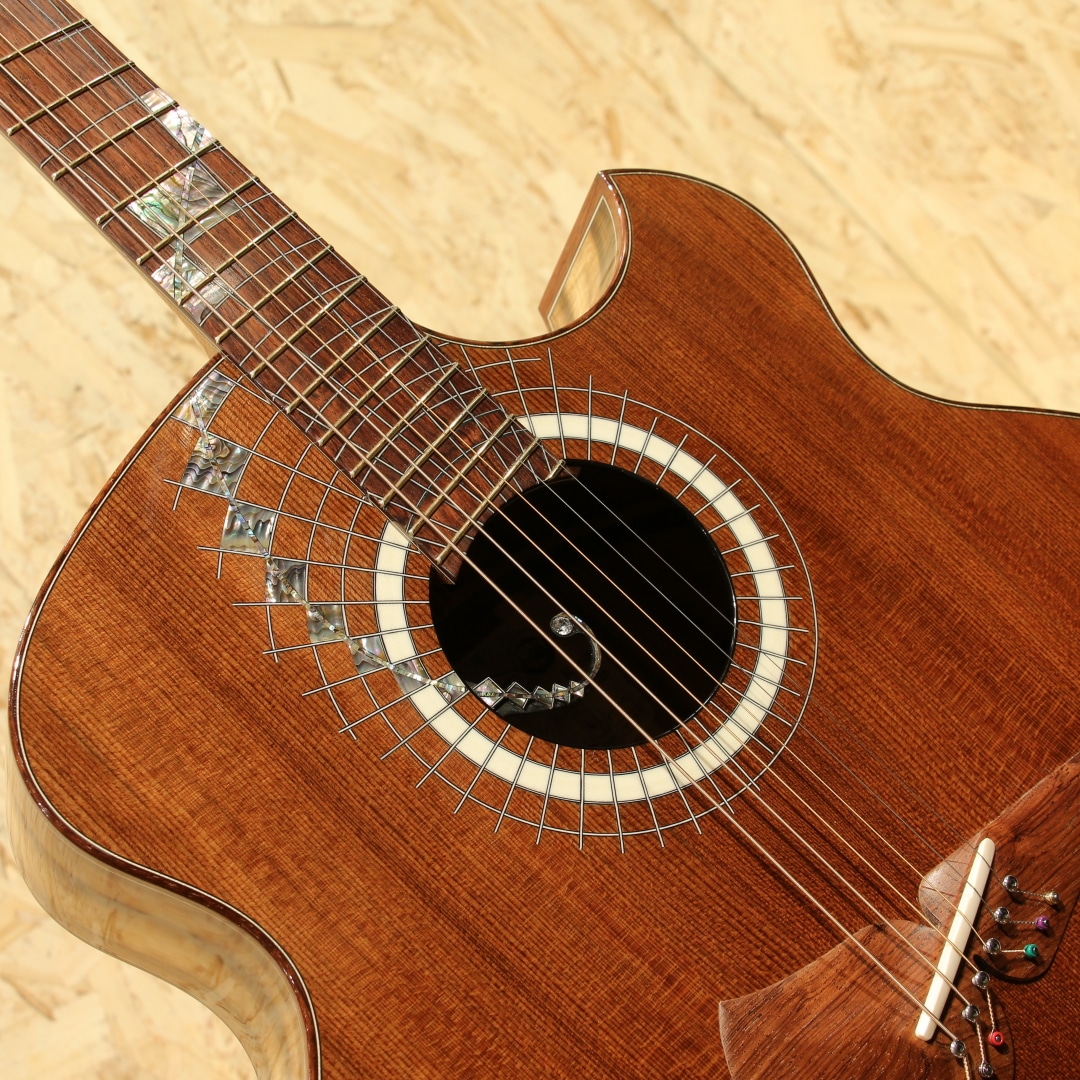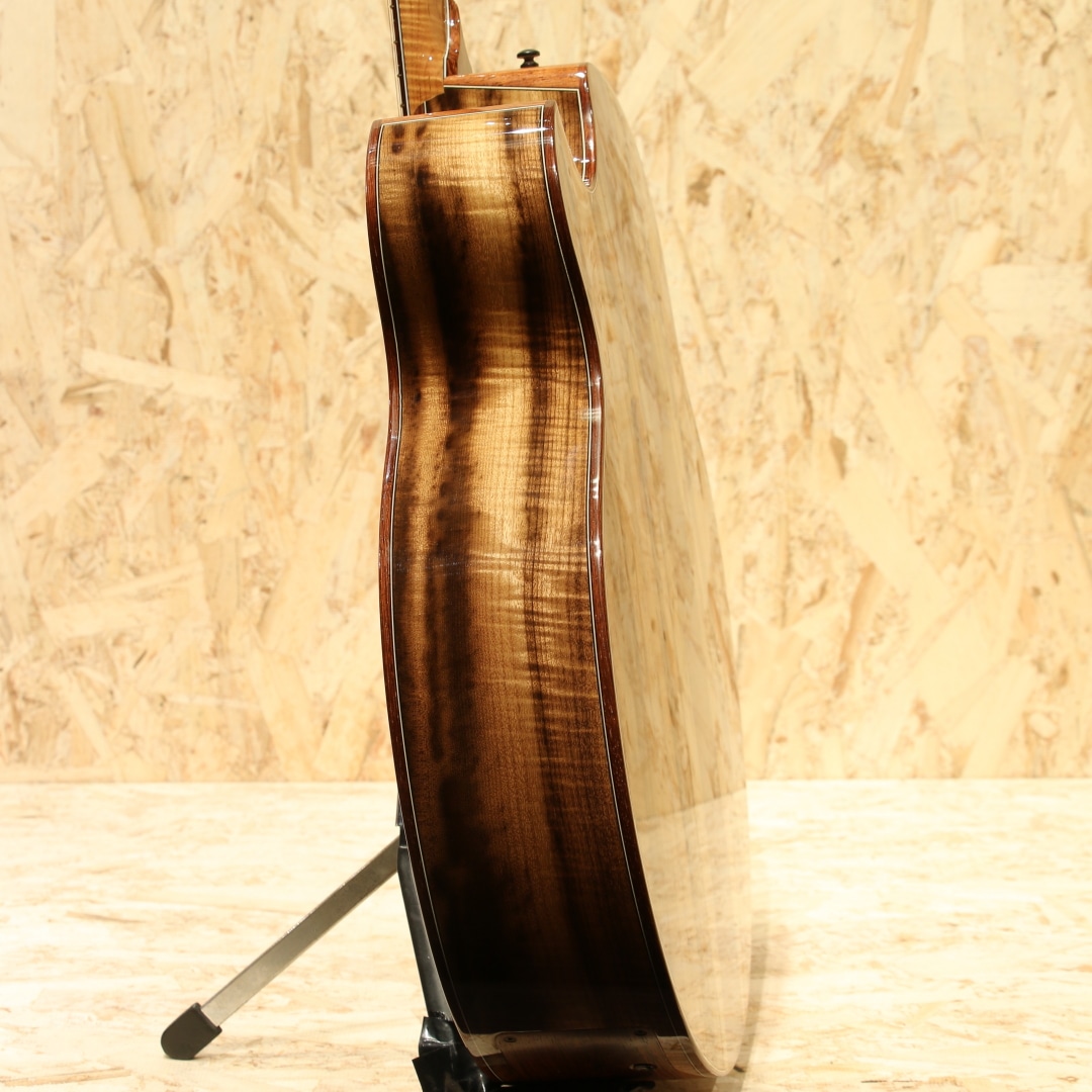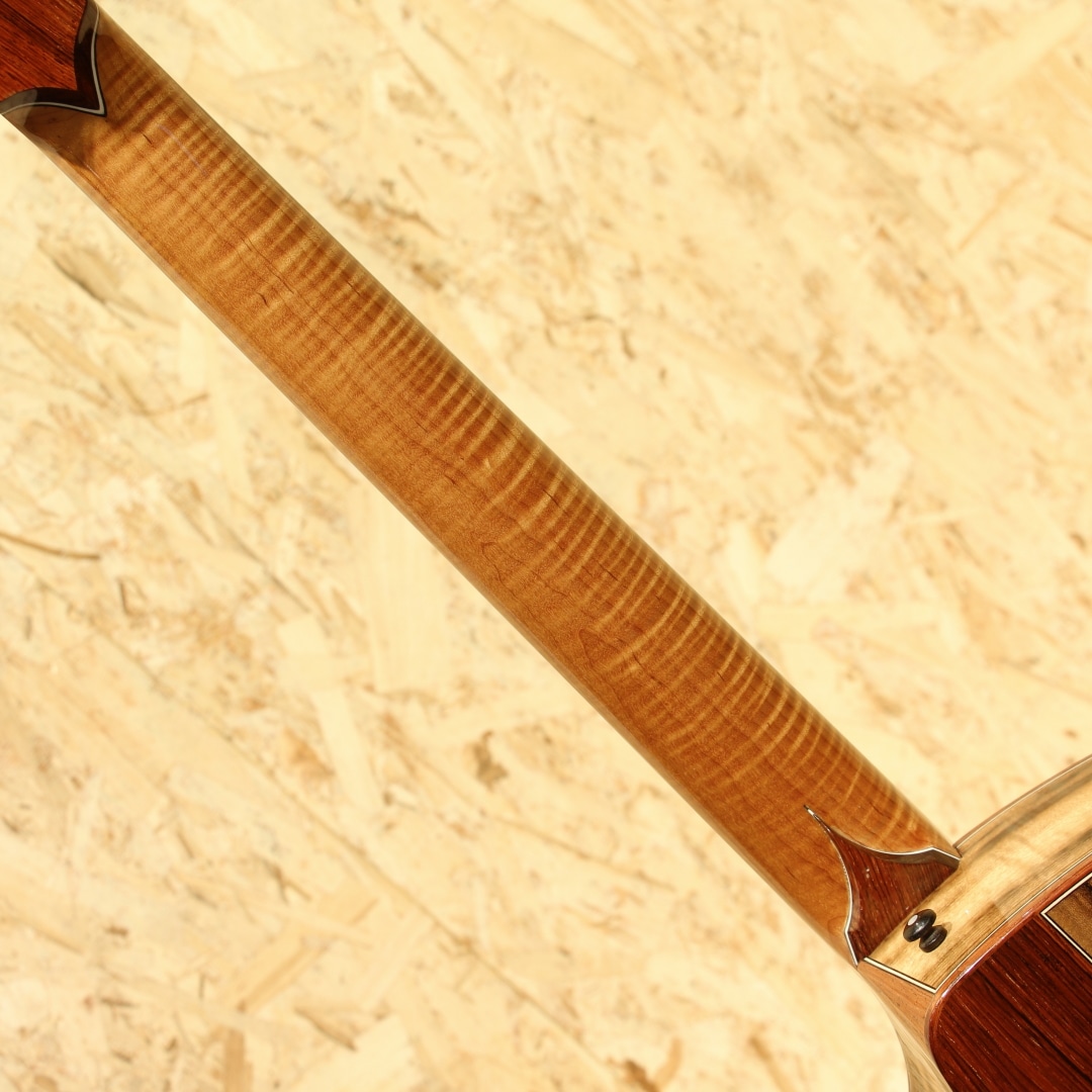 本作、5本目のFibonacciには18インチのボディー、カリフォルニアのレッドウッド、比較的柔らかい素材で低音がリッチ、高音トレブルもとても心地よく、音域のバランスに優れています。サイドバックにはオレゴンマートル(バックセンターはガテマランローズウッド)オープンで心地良い音質を実現します。California Bay Laurelとも呼ばれ、その独特な色合いや香りから、高級家具などに使用される希少な木材です。トリファイドされた西中部のメイプルネック、ガテマランローズウッド指板&ブリッジ。Klein本人がアメリカ国内に生息する素材で最良のものが作れると証明したいという思いから始まっています。アメリカ西海岸で採れる木材を使いたいという思いから、ガテマラからオレゴンまでトラックで運転してその間に積める木材でギターを作るという信念で選ばれています。フィボナッチスパイラルにインレイ装飾を施したアーティスティックなデザインは圧巻。フィボナッチ螺旋構図からインスパイアを受けた神秘的なデザインで天才的な感性を持つKleinの頭脳で昇華された芸術的な作品。ギターと黄金比に沿ったそのデザインは実際の音色を超えて訴えかけるような魅力があり、途端に虜にされます。サイドボトムには4点のスクリューで開け閉め出来る蓋を装着。スイッチが仕込まれており、ロゼッタの裏面に張り巡らされたLEDが店頭、電飾が照らすアートと揺らめきのあるまばゆいインレイは色気たっぷりです。