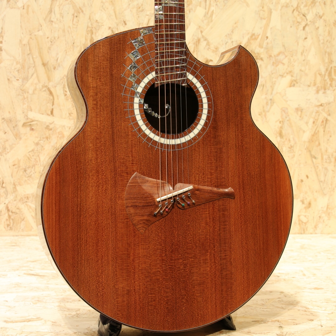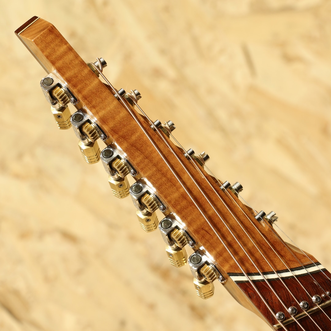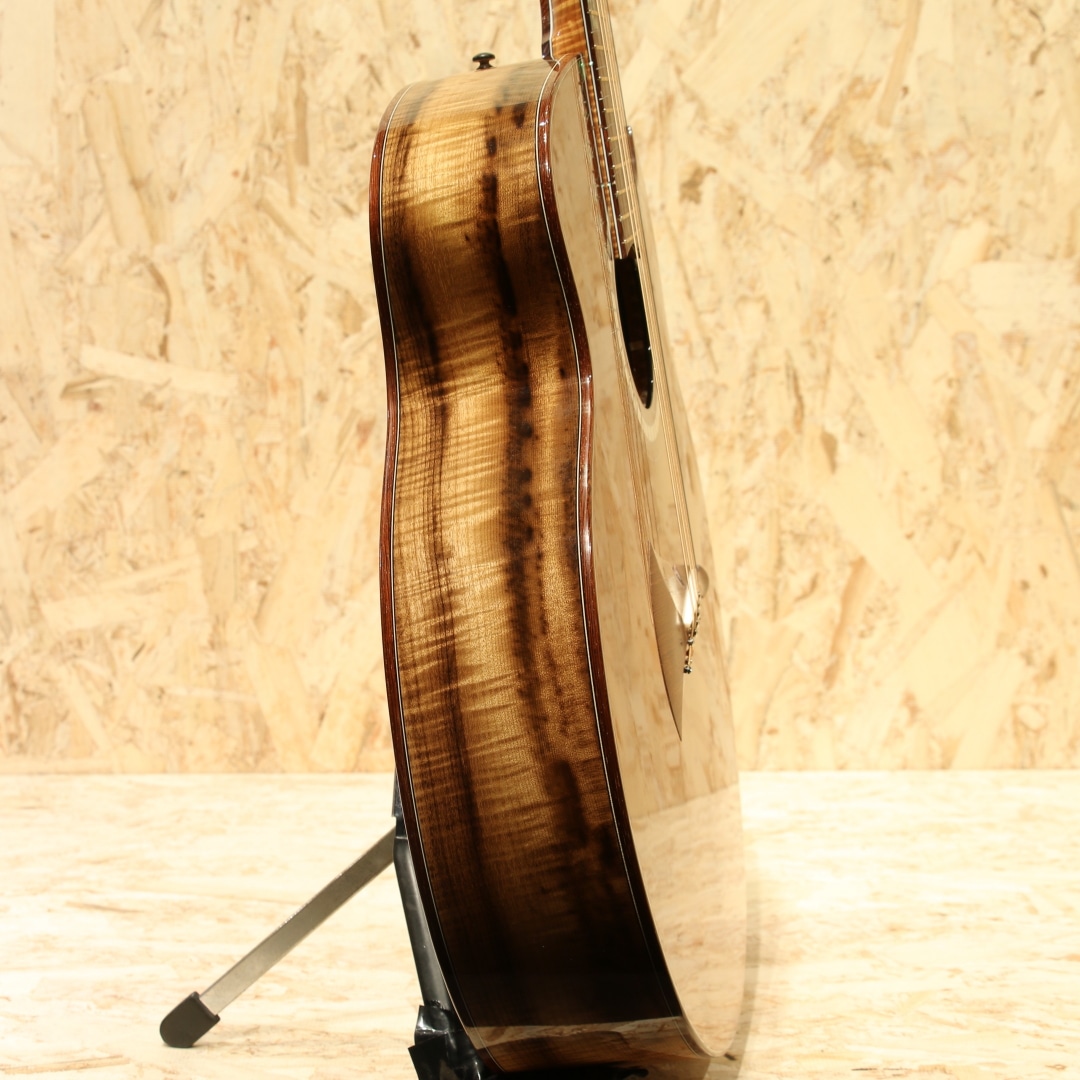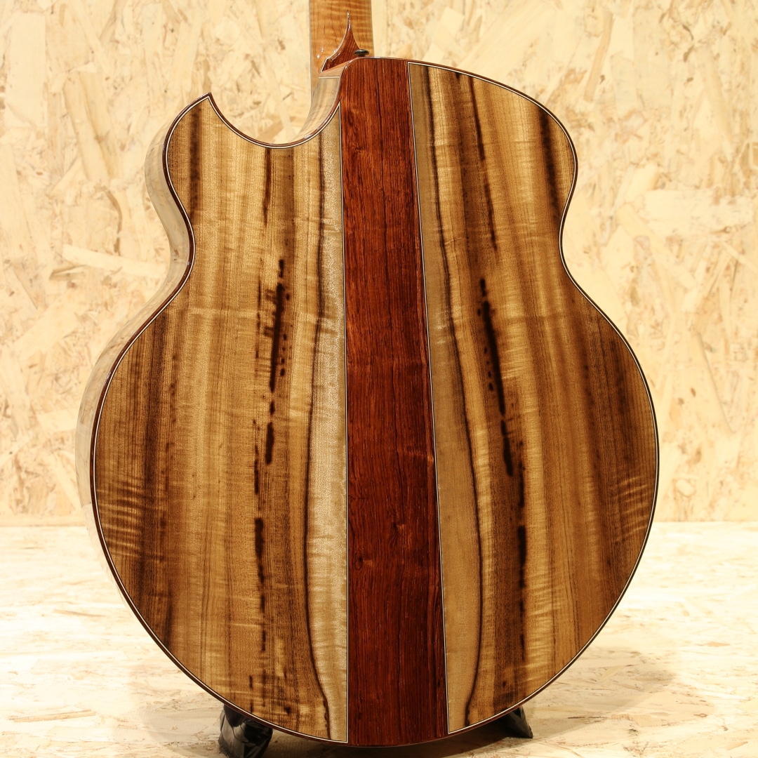 本作、5本目のFibonacciには18インチのボディー、カリフォルニアのレッドウッド、比較的柔らかい素材で低音がリッチ、高音トレブルもとても心地よく、音域のバランスに優れています。サイドバックにはオレゴンマートル(バックセンターはガテマランローズウッド)オープンで心地良い音質を実現します。California Bay Laurelとも呼ばれ、その独特な色合いや香りから、高級家具などに使用される希少な木材です。トリファイドされた西中部のメイプルネック、ガテマランローズウッド指板&ブリッジ。Klein本人がアメリカ国内に生息する素材で最良のものが作れると証明したいという思いから始まっています。アメリカ西海岸で採れる木材を使いたいという思いから、ガテマラからオレゴンまでトラックで運転してその間に積める木材でギターを作るという信念で選ばれています。フィボナッチスパイラルにインレイ装飾を施したアーティスティックなデザインは圧巻。フィボナッチ螺旋構図からインスパイアを受けた神秘的なデザインで天才的な感性を持つKleinの頭脳で昇華された芸術的な作品。ギターと黄金比に沿ったそのデザインは実際の音色を超えて訴えかけるような魅力があり、途端に虜にされます。サイドボトムには4点のスクリューで開け閉め出来る蓋を装着。スイッチが仕込まれており、ロゼッタの裏面に張り巡らされたLEDが店頭、電飾が照らすアートと揺らめきのあるまばゆいインレイは色気たっぷりです。