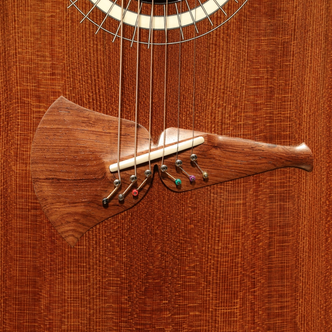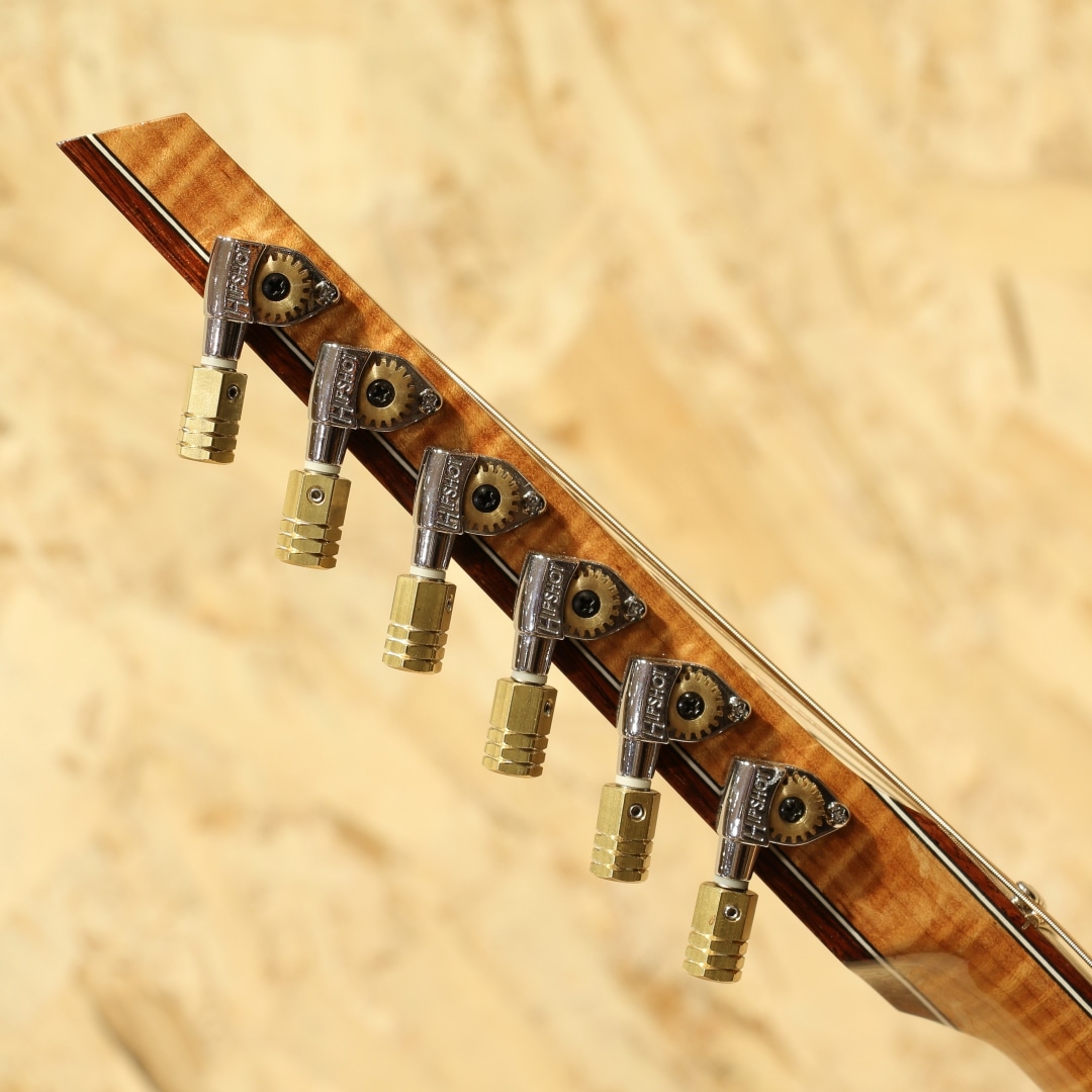 フレットはマルチスケールのファンフレット。ブレイシングは、The Vitruven Man と呼ばれるブレーシング・パターンを使用しています。トーンバーのテンションが効率的に分散されるように設計されたKlein独自のブレーシング・パターンです。本器に関しては文章のみでは書ききれないKleinとKauffmanの思いがあるため近日インタビュー動画を公開予定です。