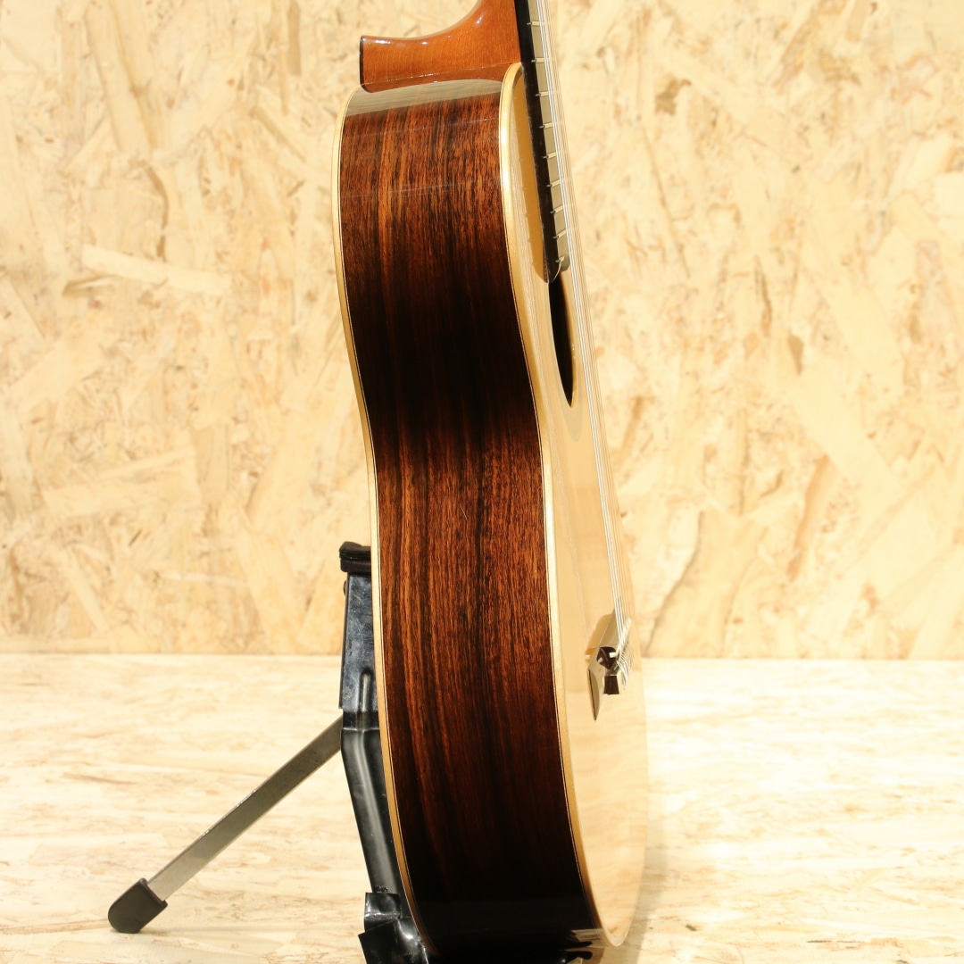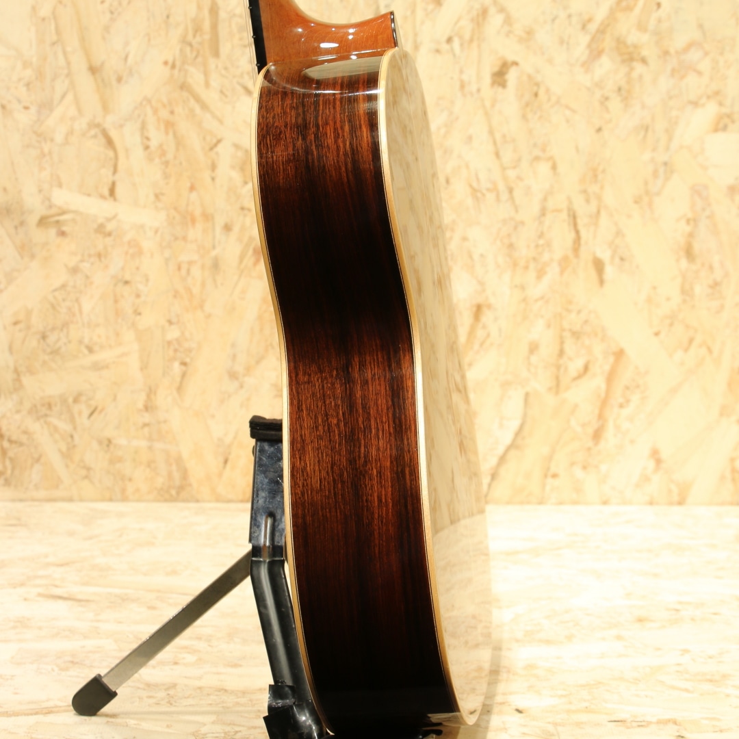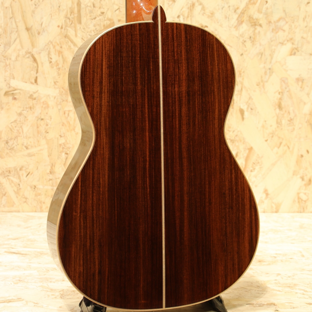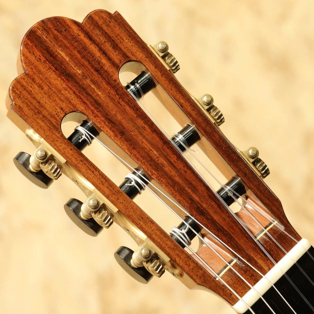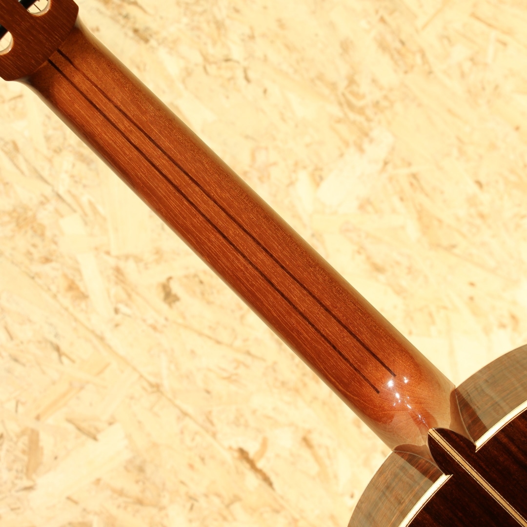 長野の名工、石井栄氏の2016年の作品。No.60号を元に630mmスケールで製作した1品です。スプルース表板、ローズウッド側&裏板、エボニー指板、ハカランダ駒、セドロ棹、ゴトー糸巻、ウッドロゼッタ&バインディング、ナット幅50ミリ、弦長630ミリ仕様、トップはシェラック、サイドバックはラッカー仕様です。茶位工房へ師事した後、八十年代には自身の工房を開いていたベテランのギターです。確実な作りはもちろん、楽器自体はとても軽量で良い印象を覚えます。ネック形状や少しだけ短いスケールも日本人の体型にフィットしやすいと思います。シェラックが故のサウンドホール回りのわずかな擦れ、全体的な細かい擦り傷などはありますが使用感は大変薄い美品です。ネック裏に塗装の特性上の僅かなべたつきがございますが、剥がれ等は見られません。演奏性は素晴らしくとても大事に使用されてきたものだとわかります。軽やかで、じんわりと来るスペインの良質なギターを連想させる響き。是非お手元でご体感ください。汎用ハードケースが付属します。