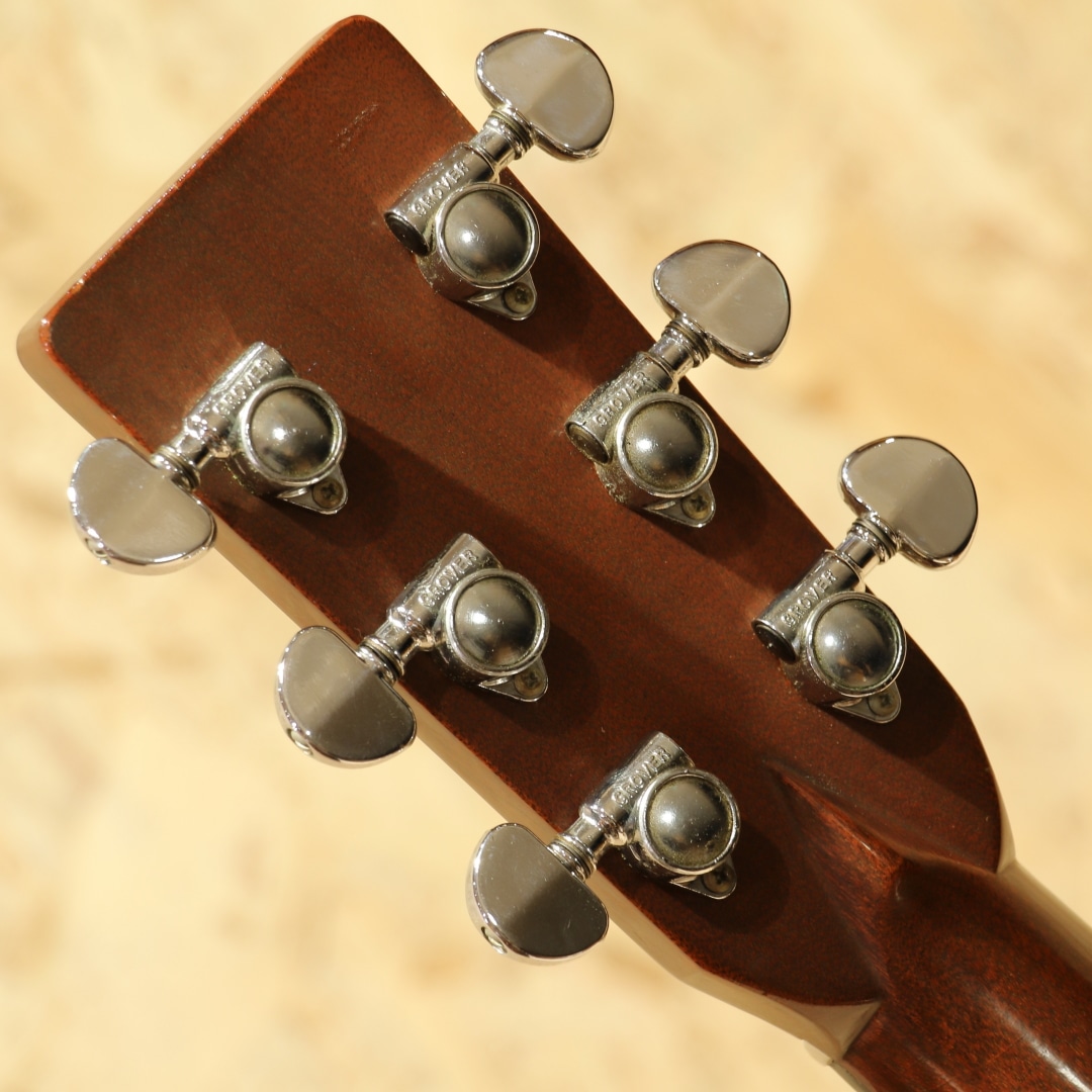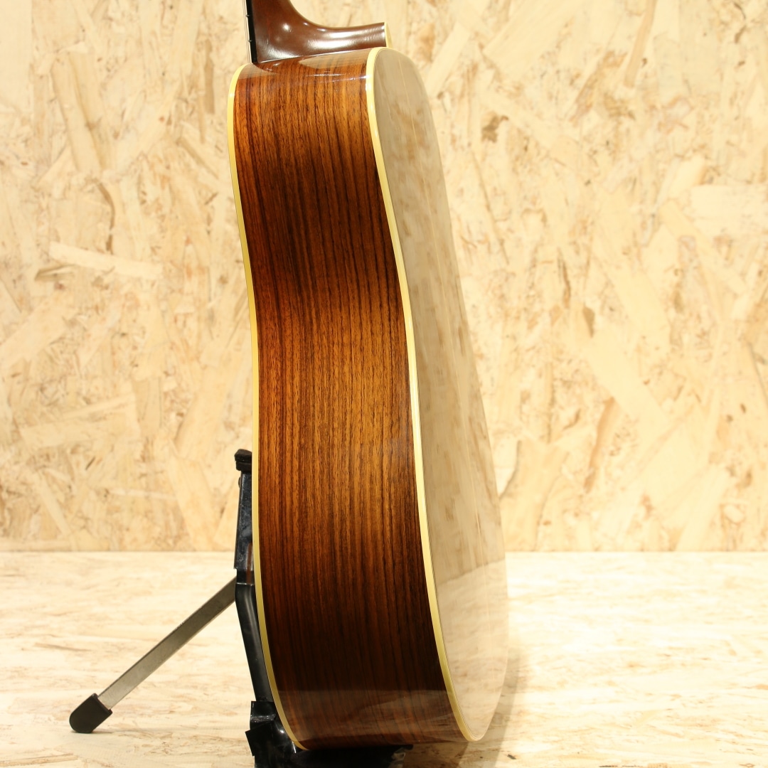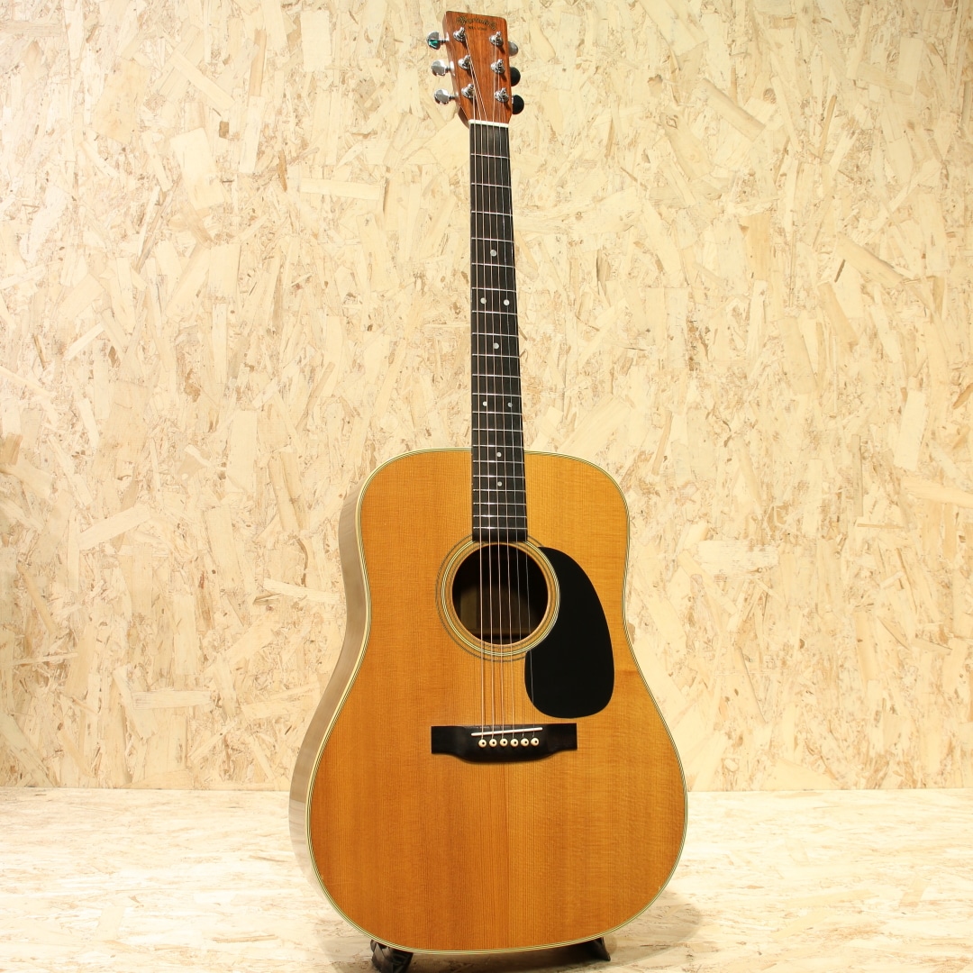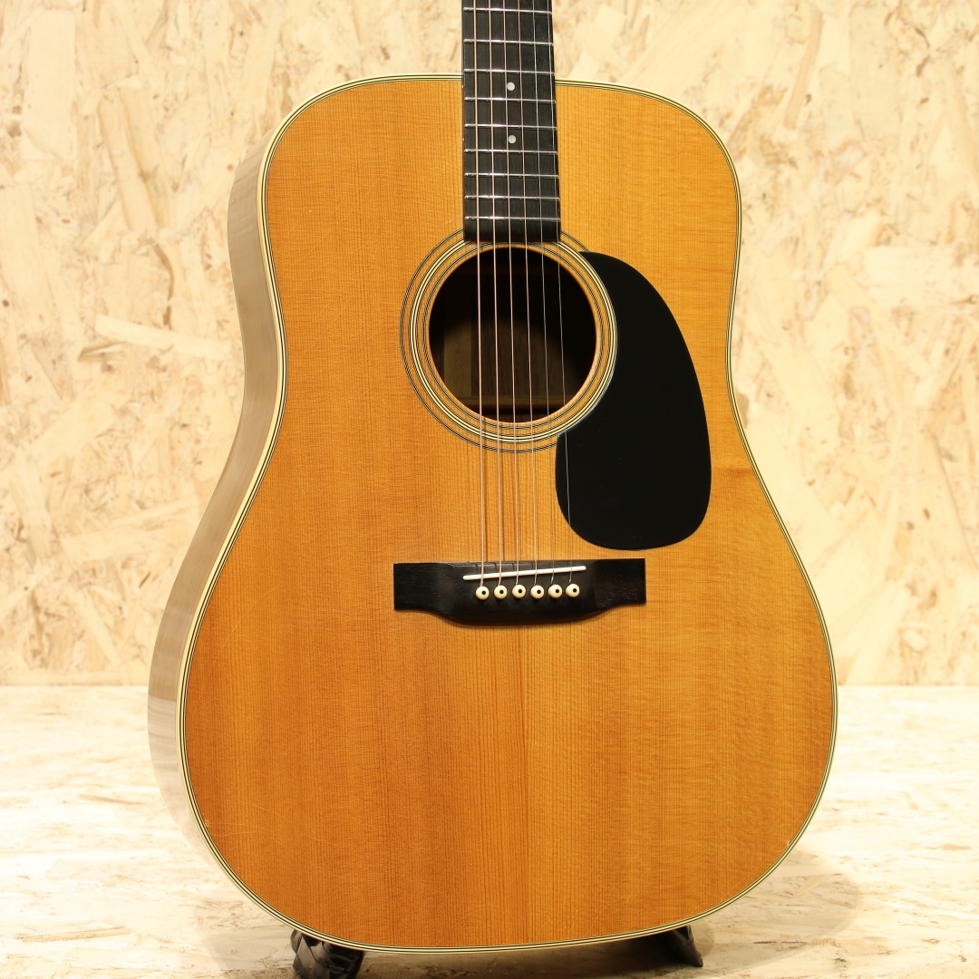 マーチンギターの中で最も有名なモデル"D-28"。現在同様の14fジョイントのドレッドモデルとして1934年に誕生してから、時を超え今もなお愛されるワールドスタンダードモデル。本器は1975年製のUSED品。スプルーストップ、インディアンローズウッドサイド&バック、マホガニーネック、エボニー指板&ブリッジ、パテントミルクボトルグローバーペグ、MOP指板ドットインレイ、スクエアネックロッド、チェッカーフラッグバックストリップ、ローズウッドブリッジプレート、ノンスキャロップドXブレイシング、ピックガードはブラックカラーのモノへ交換されています。安定の人気を誇る70s"D-28"。現代のスタンダードはより空気感を含んだ膨らみ感のあるトーンですが、この時期はクリアで引き締まった骨太な響き。近年スタンダードモデルのモデルチェンジも相まって、近年モデルとの明確なサウンド差が際立ち、この年代のモノでしか味わえない音色。本器もトルク感のある粒立ちの良い骨太なノンスキャロップサウンドがしっかりと味わえます。凛としたトーン、音が前に出る感覚、音の分離感も良く立ち上がりもスピーディ。芯が強く輪郭感のハッキリしたトーン、ブライト且つ抜けの良いサウンドを存分に体感できる個体です。ナットサドルは牛骨製のモノに交換されています。僅かなウェザーチェックや僅かな弾きキズこそ見られるモノの、50年近くの年月を経たことを考えると非常にキレイな状態を保った極上USED品。ネック周りの状態も良いままにキープされ、サドル残りも比較的残された個体。この時代の個体ならではのトーンを楽しめる良好な1本です。杢目もキレイで良い焼け方をしたことからも良い年月を経たことが窺えます。中々ここまでの状態をキープした個体も見ることが減りました。是非ご検討下さいませ。