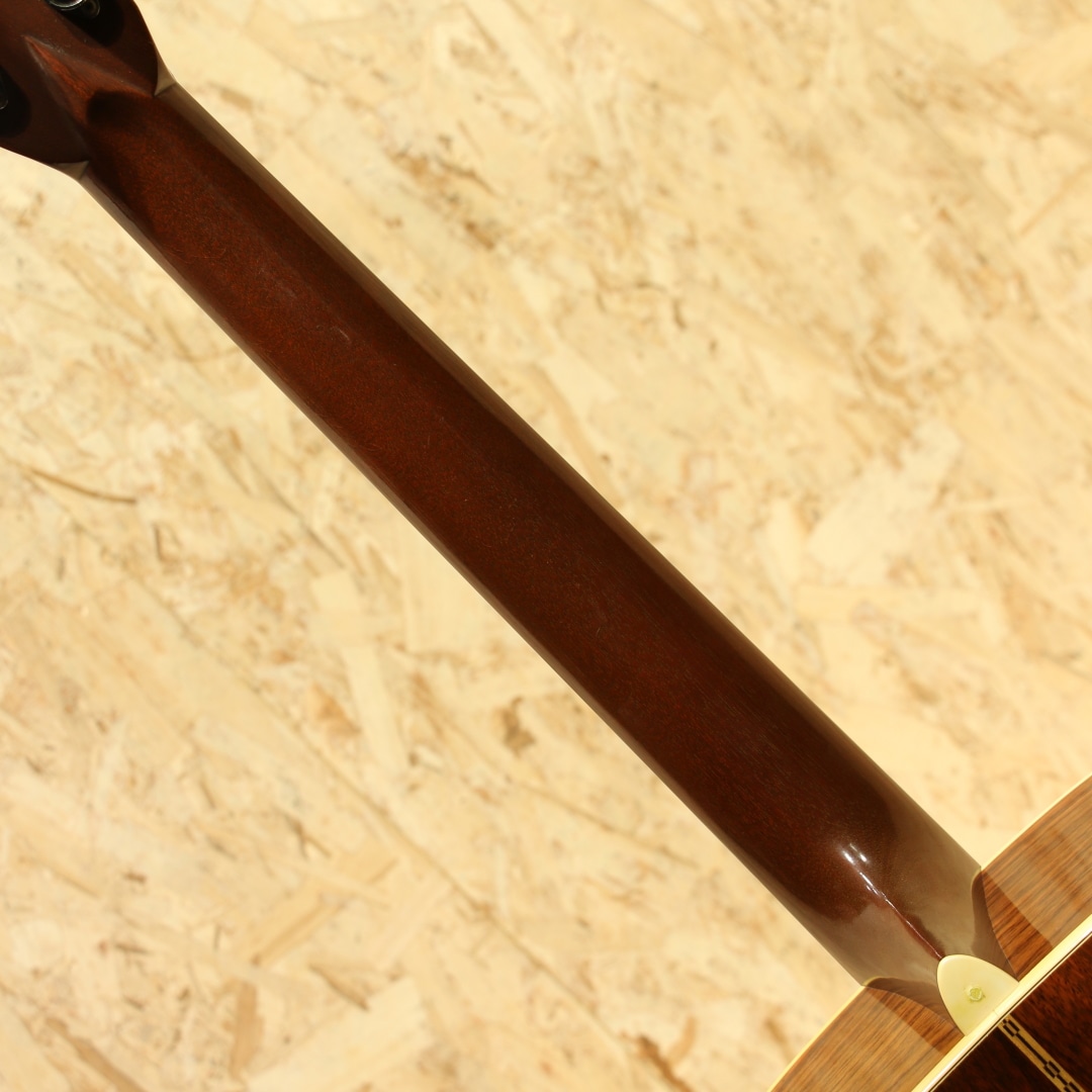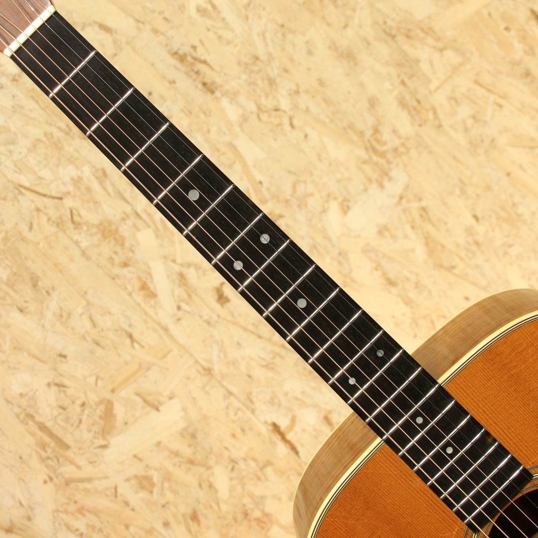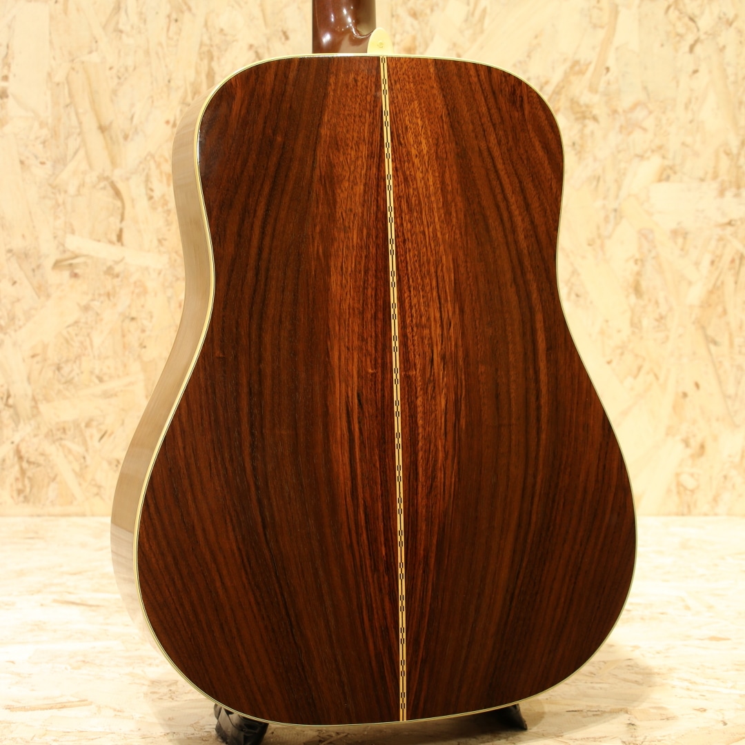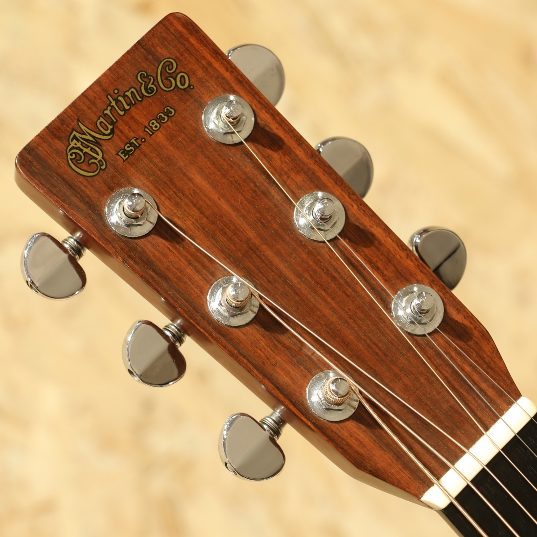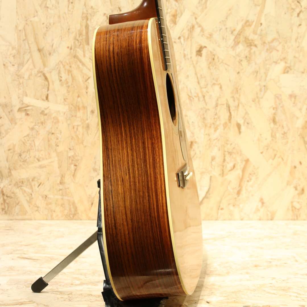 マーチンギターの中で最も有名なモデル"D-28"。現在同様の14fジョイントのドレッドモデルとして1934年に誕生してから、時を超え今もなお愛されるワールドスタンダードモデル。本器は1975年製のUSED品。スプルーストップ、インディアンローズウッドサイド&バック、マホガニーネック、エボニー指板&ブリッジ、パテントミルクボトルグローバーペグ、MOP指板ドットインレイ、スクエアネックロッド、チェッカーフラッグバックストリップ、ローズウッドブリッジプレート、ノンスキャロップドXブレイシング、ピックガードはブラックカラーのモノへ交換されています。安定の人気を誇る70s"D-28"。現代のスタンダードはより空気感を含んだ膨らみ感のあるトーンですが、この時期はクリアで引き締まった骨太な響き。近年スタンダードモデルのモデルチェンジも相まって、近年モデルとの明確なサウンド差が際立ち、この年代のモノでしか味わえない音色。本器もトルク感のある粒立ちの良い骨太なノンスキャロップサウンドがしっかりと味わえます。凛としたトーン、音が前に出る感覚、音の分離感も良く立ち上がりもスピーディ。芯が強く輪郭感のハッキリしたトーン、ブライト且つ抜けの良いサウンドを存分に体感できる個体です。ナットサドルは牛骨製のモノに交換されています。僅かなウェザーチェックや僅かな弾きキズこそ見られるモノの、50年近くの年月を経たことを考えると非常にキレイな状態を保った極上USED品。ネック周りの状態も良いままにキープされ、サドル残りも比較的残された個体。この時代の個体ならではのトーンを楽しめる良好な1本です。杢目もキレイで良い焼け方をしたことからも良い年月を経たことが窺えます。中々ここまでの状態をキープした個体も見ることが減りました。是非ご検討下さいませ。