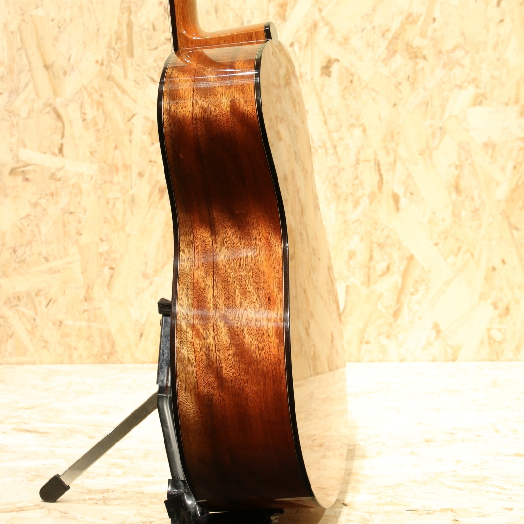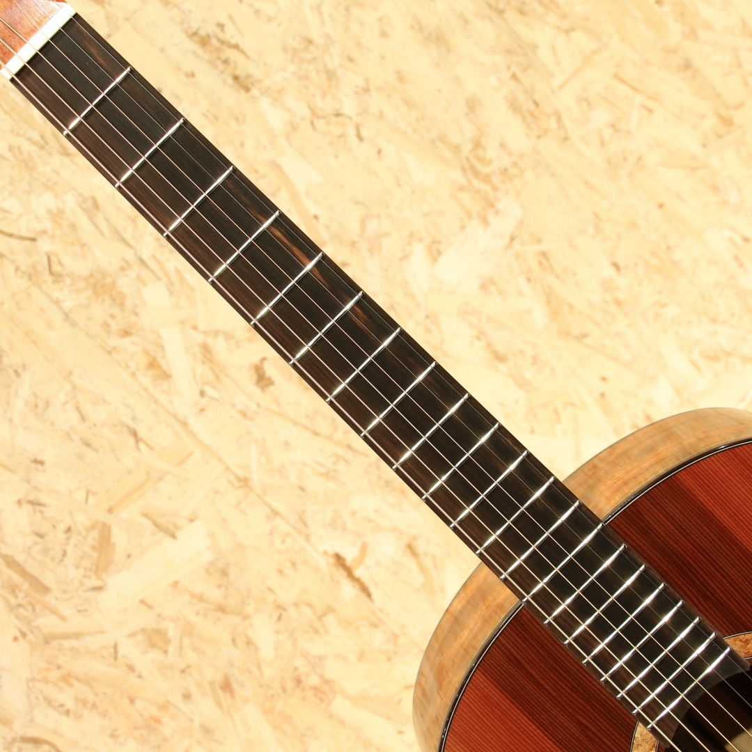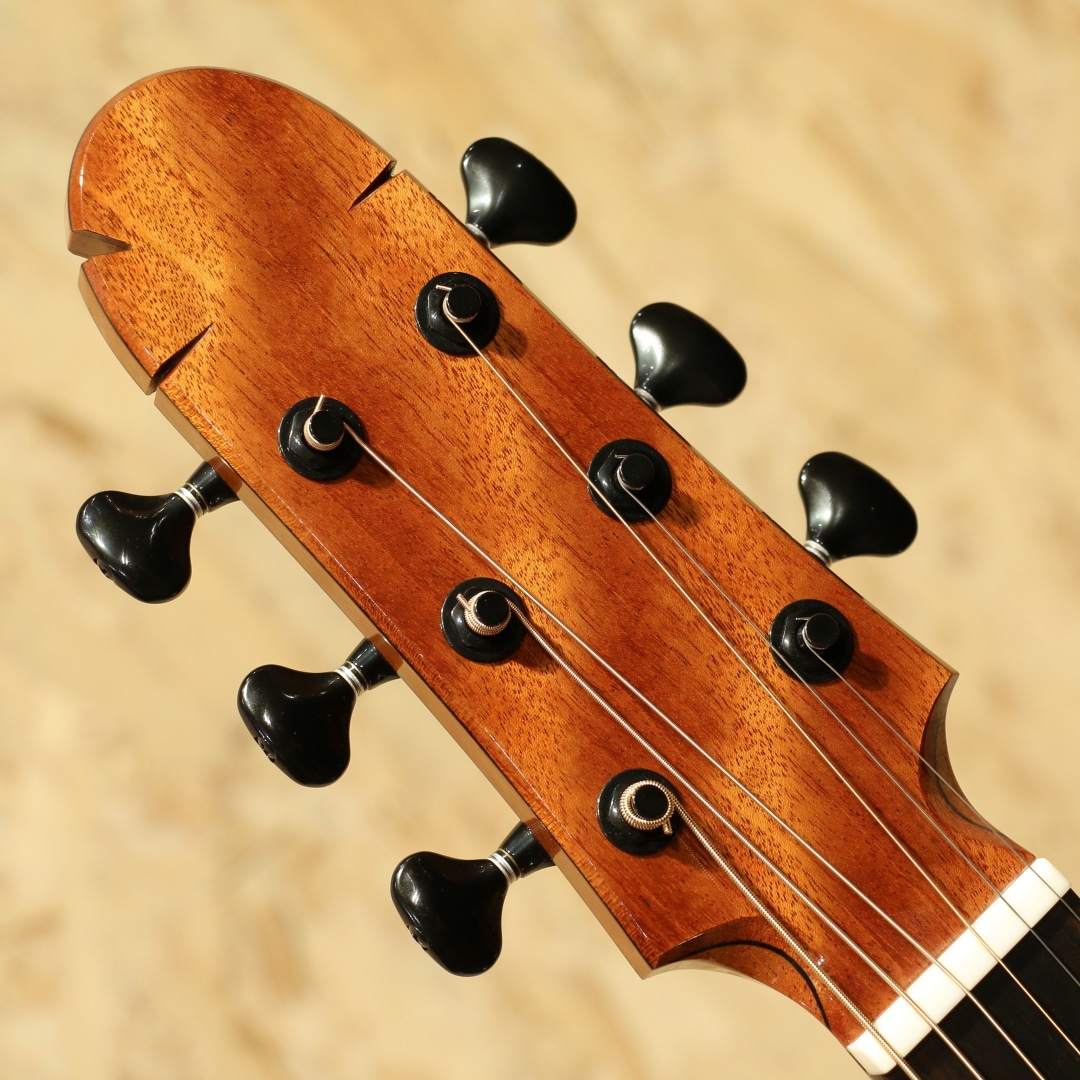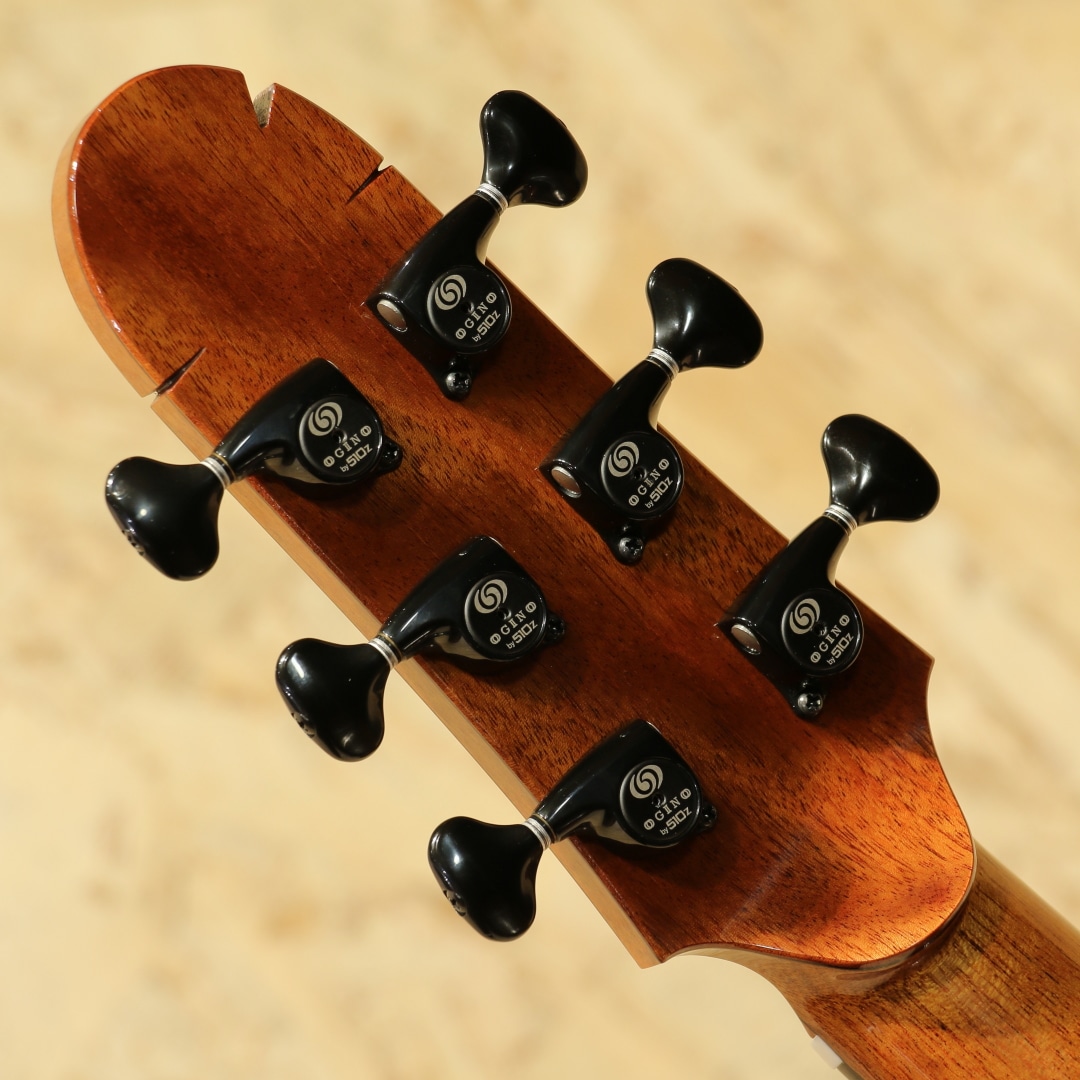 サウンドボード(トップ)に使われた木材はルネサンス・シダー。濃淡のグラデーションが何より美しく、その魅力的なオーラーは木材が背負ってきた長年の時を感じられます。放射性炭素年代測定にて約664(±21)年前に寿命を全うしたことを科学的にも確認されたものです。(証明書付き)その後何世紀にも渡り土と水の下に埋もれたまま時を過ごしてきた宝物のような木材です。サイドバック材には美しいカーリー杢のキューバ産のマホガニー、マホガニー材の中で最も優れていると評価されるキューバン産のマホガニー。美しさも去ることながらその音色はアフリカンマホガニーなど、現在に広く流通しているマホガニーとは完全に一線を画します。軸ぶれしない音色の芯の強さ、ぼやけない輪郭、そして美しい倍音。時を超えたシダーとの組み合わせはまさに時代を超えたコラボレーションでしょう。ワンピースホンジュラスマホガニーネック、マッカーサーエボニー指板、ハカランダブリッジ、ゴトー510ペグ、スポルテッドメイプルロゼッタ、クリアピックガード、マッカーサーエボニーバインディング、オリジナルラティスブレイシング。Ogino Guitarsの基本構造は3世代構造によって構成されており、持ち味が異なります。本器はその最先端となる第3世代。ソモジのコピー期となる第一世代から踏襲+アレンジ期となる第二世代、そして第三世代はソモジとは異なるサウンドメイクで双璧をなし、世を唸らせるもう一人の巨匠"ジェフ・トラゴット"の影響を色濃く受ける構造刷新が見られます。ソモジ系の"重厚な空気感"からより透明で整理された音響空間への羽ばたき。具体的には、低音の量感よりも"音の立体感""音像のフォーカス""全弦の均一性" を重視する方向へ舵を切ったと言えます。ソモジ氏の系譜から独立した設計思想への確立へ走るにはとても勇気のいる決断。スポーツの世界で例えるなら、すでに成功を収めフォームが確立した中でさらに一度それを崩し、さらなる成長への期待にビルドアップするような感覚でしょう。進化を続ける荻野氏の最新作、オリジナルのブルーのハードケース付属です。