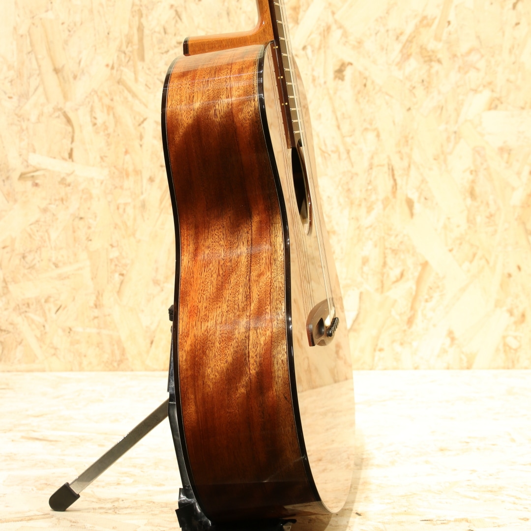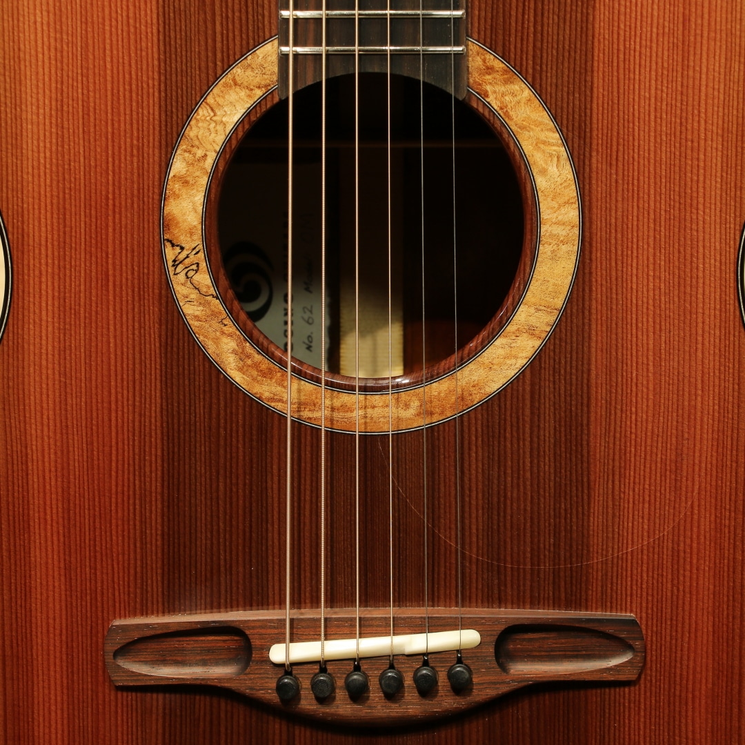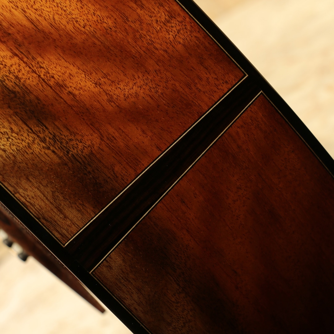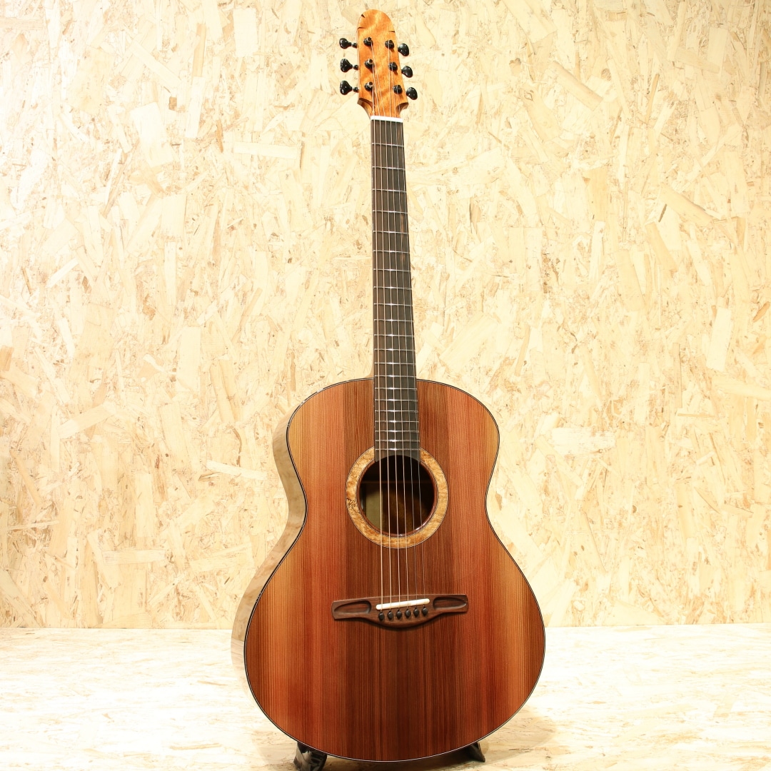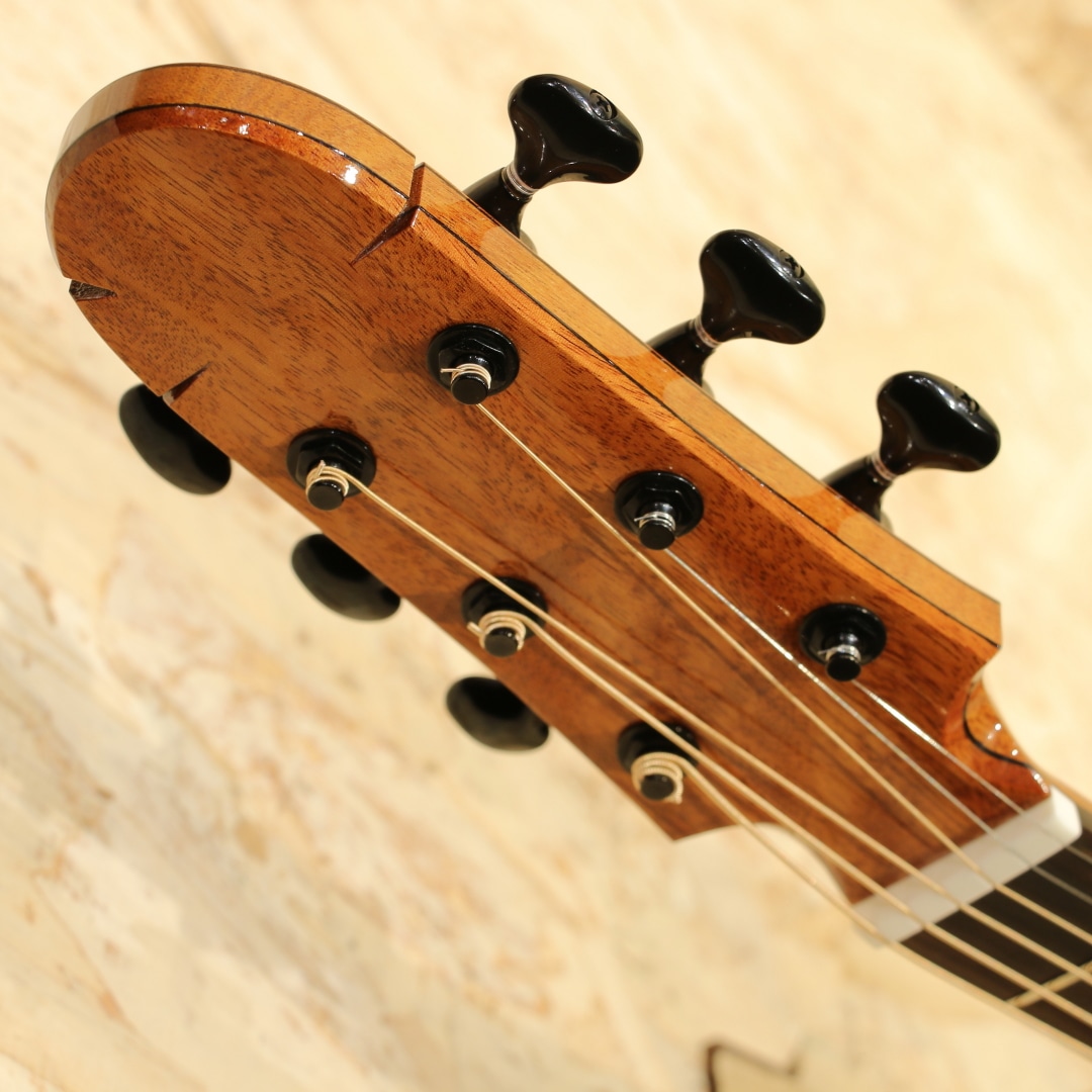 サウンドボード(トップ)に使われた木材はルネサンス・シダー。濃淡のグラデーションが何より美しく、その魅力的なオーラーは木材が背負ってきた長年の時を感じられます。放射性炭素年代測定にて約664(±21)年前に寿命を全うしたことを科学的にも確認されたものです。(証明書付き)その後何世紀にも渡り土と水の下に埋もれたまま時を過ごしてきた宝物のような木材です。サイドバック材には美しいカーリー杢のキューバ産のマホガニー、マホガニー材の中で最も優れていると評価されるキューバン産のマホガニー。美しさも去ることながらその音色はアフリカンマホガニーなど、現在に広く流通しているマホガニーとは完全に一線を画します。軸ぶれしない音色の芯の強さ、ぼやけない輪郭、そして美しい倍音。時を超えたシダーとの組み合わせはまさに時代を超えたコラボレーションでしょう。ワンピースホンジュラスマホガニーネック、マッカーサーエボニー指板、ハカランダブリッジ、ゴトー510ペグ、スポルテッドメイプルロゼッタ、クリアピックガード、マッカーサーエボニーバインディング、オリジナルラティスブレイシング。Ogino Guitarsの基本構造は3世代構造によって構成されており、持ち味が異なります。本器はその最先端となる第3世代。ソモジのコピー期となる第一世代から踏襲+アレンジ期となる第二世代、そして第三世代はソモジとは異なるサウンドメイクで双璧をなし、世を唸らせるもう一人の巨匠"ジェフ・トラゴット"の影響を色濃く受ける構造刷新が見られます。ソモジ系の"重厚な空気感"からより透明で整理された音響空間への羽ばたき。具体的には、低音の量感よりも"音の立体感""音像のフォーカス""全弦の均一性" を重視する方向へ舵を切ったと言えます。ソモジ氏の系譜から独立した設計思想への確立へ走るにはとても勇気のいる決断。スポーツの世界で例えるなら、すでに成功を収めフォームが確立した中でさらに一度それを崩し、さらなる成長への期待にビルドアップするような感覚でしょう。進化を続ける荻野氏の最新作、オリジナルのブルーのハードケース付属です。