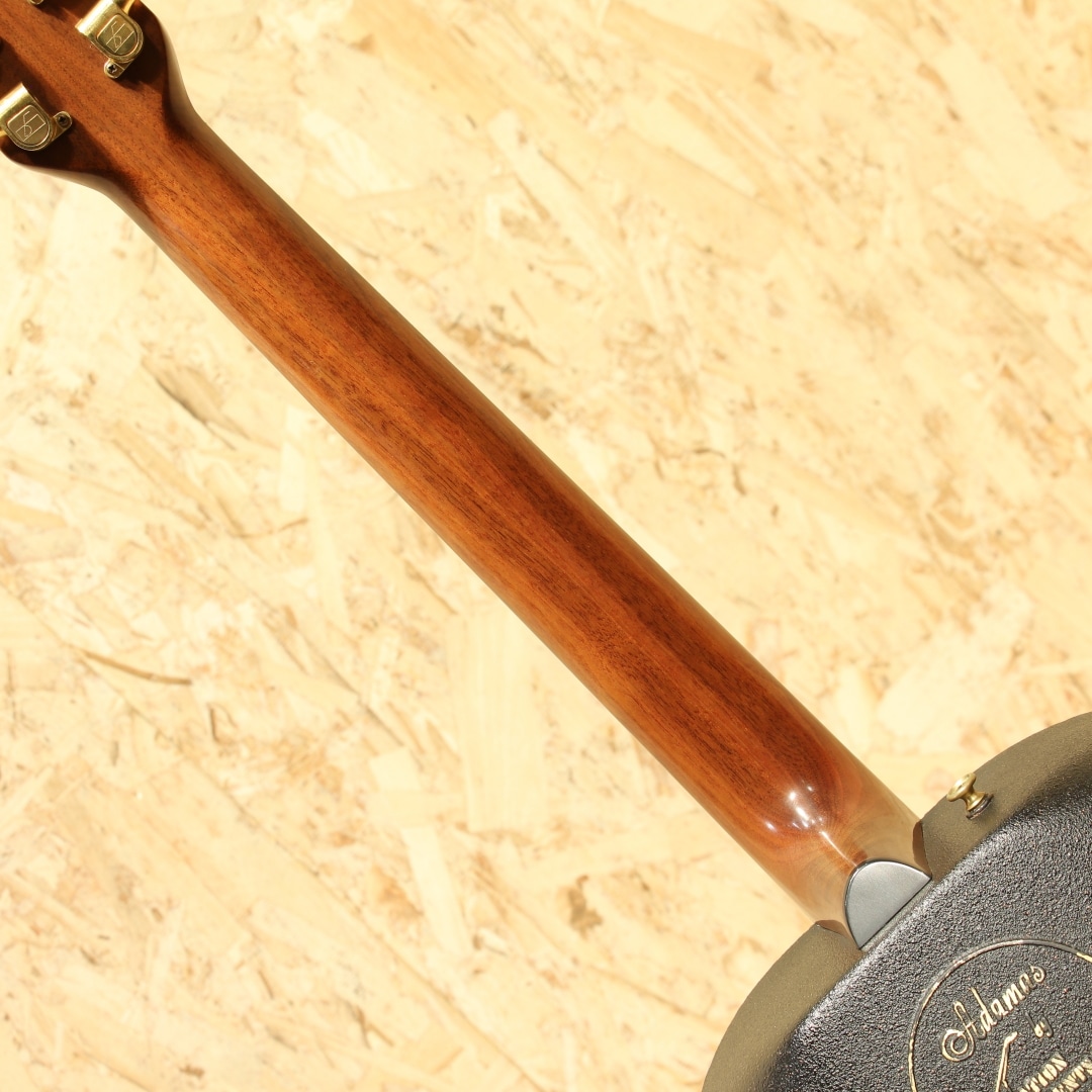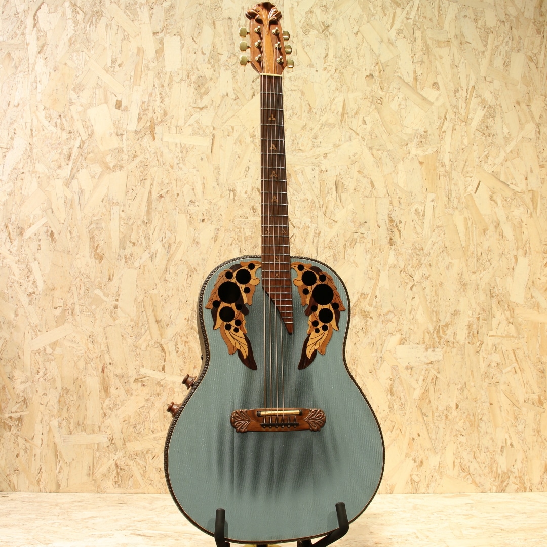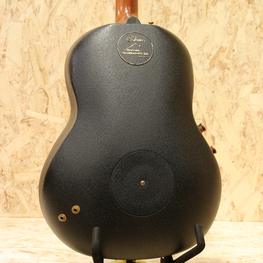 オべーションの創始者チャーリー・カマンの生音へのさらなる探究心から1976年に誕生したアダマス。こちらは一番人気のブルーの個体"1687-8"。本器は1984年製ウッドノブステレオアウトプット期。ウッドトップの約三分の一の薄さでも十分な強度を得られるアダマス独自のカーボングラファイトトップ、リラコード樹脂ディープボウル、ウォルナットネック、ウォルナット指板&ブリッジ、オリジナルシャーラーペグ、ウッド指板インレイ、マルチプルエポーレットサウンドホール、ファンブレイシング、トーンとボリュームの2wayウッドノブ。つややかな質感のヘッドと駒の彫刻等、この頃ならではともいえる芸術品のような精巧な仕上げも人気の1つです。アダマス特有の深みのある野太い響き。ラインでアウトした時の温かみのある音色は近年モノとは一線を画します。1979年から採用されたステレオアウト仕様のピックアップを搭載。シンプルな回路からは現行品にはない音の太さが生まれます。ステレオ出力時、偶数弦の出力がやや弱めですが、アンプやミキサーでの調整にて問題なくご使用いただけるかと思います。指板エンドとトップ面に接着された形跡、また6弦側ネックジョイント箇所の指板とネックの間に埋め跡が見られます。同作業に伴いネック裏に薄く上吹きが施されていますが丁寧なリペア作業の為、雰囲気を損なわない仕上がりです。1弦側の3フレット指板縁に打痕修正跡、同箇所6弦側ネック裏に表面上の打痕、ヘッド彫刻箇所によく見られる白濁が若干ありますが美しい艶やかさは保たれています。ボディトップ、バックのラメも残っており、バック面ロゴも若干の剥がれが見られるものの良い状態が保たれております。斬新なルックスとサウンドでエレアコの最高峰に登り詰めたともいえるアダマス。一見無機質に見えるカーボンボディと工芸品のようなヘッド&ブリッジデザイン、様々な木材でまとめられたサウンドホールエポレット、手作業にて仕上げられた美しいウッドノブ等はサウンドのみならず唯一無二の融合美を持つルックスです。依然として初期モノのアダマスはとりわけ出物が少なく、探されている方も多いのではないでしょうか。ネックコンディションも素晴らしく、プレイコンディション共に大変良い状態、実践仕様の良き相棒としても是非チェックして頂きたい一本です。オリジナルブラウンハードケースが付属します。(一部欠損のサウンドホールカバーが付属します)
