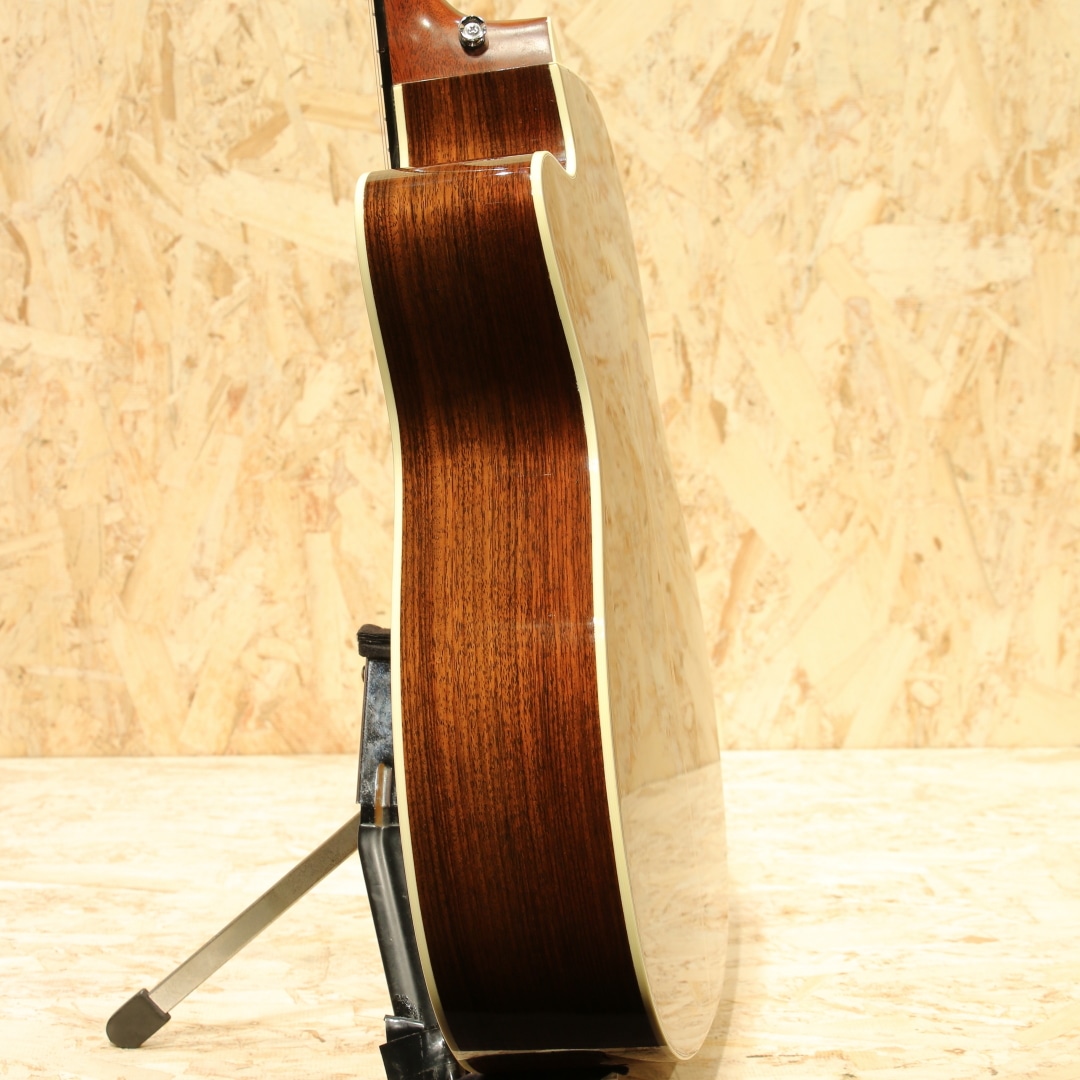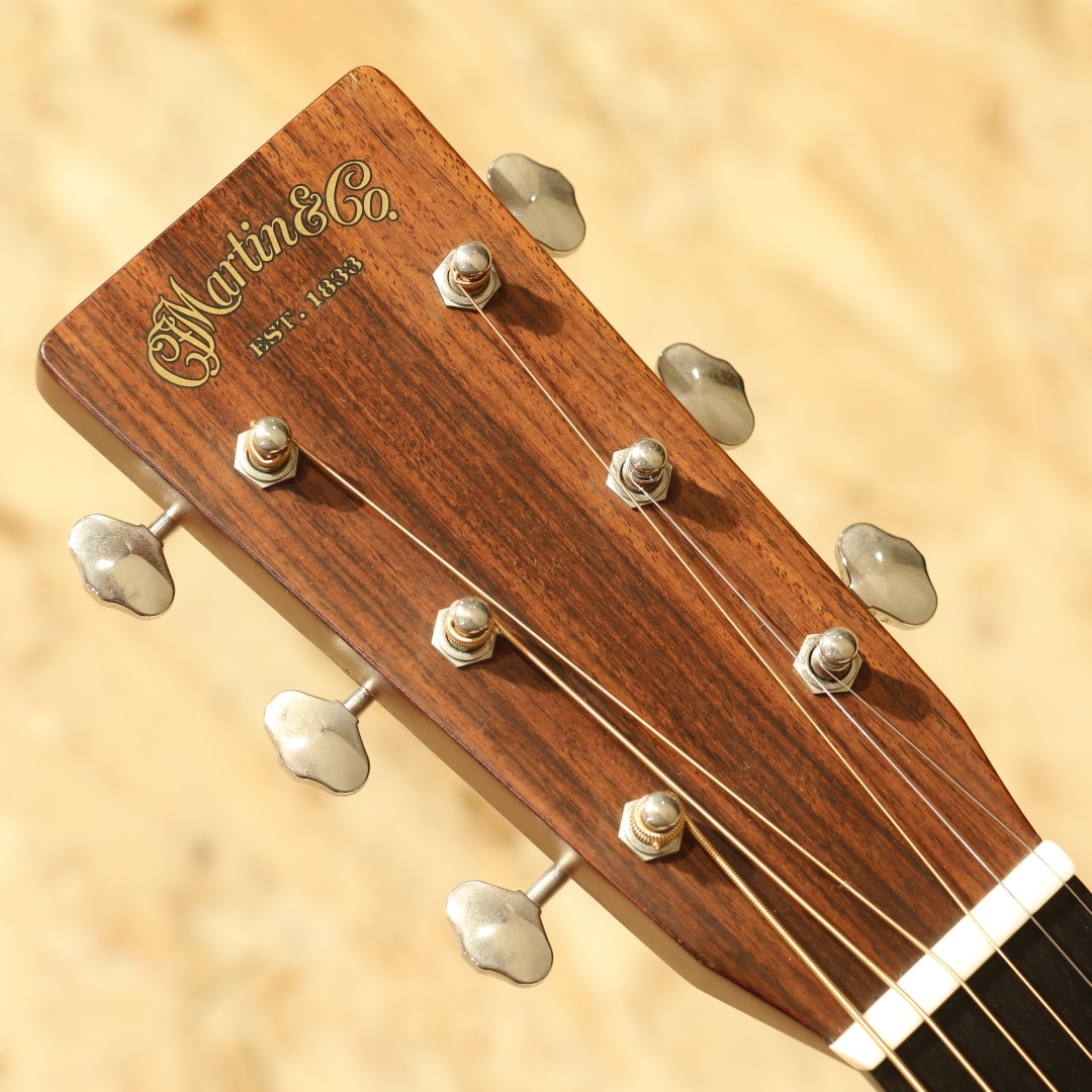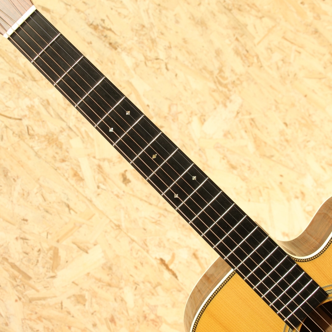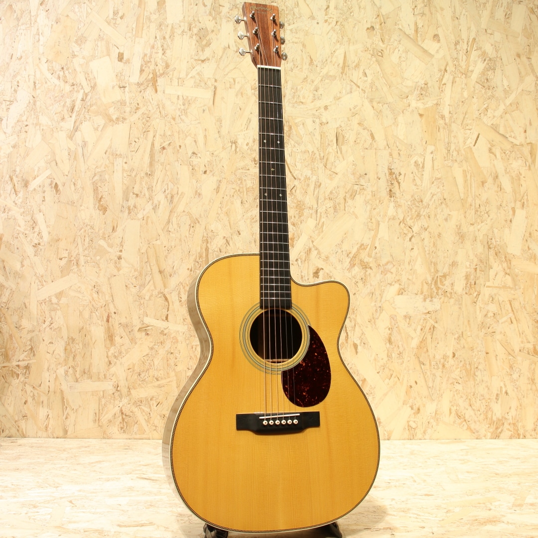 現マーチン工場の中でも、卓越した技術と豊富な経験から至極のギターを造り出す"Martin Custom Shop"。ここ数年一際話題を集めるオーセンティックシリーズの製作をはじめ、高い完成度を誇るこだわりのカスタムモデルを製造するトップクラスの部門。本器はカスタムショップ製OM28カッタウェイスタイルの”CTM OMC-28 Adirondack Spruce”、2017年製USED品。アディロンダックスプルーストップ、ローズウッドサイド&バック、ジェニュインマホガニーネック、44.5mmナット幅、モディファイドローオーバルネックプロファイル、パフォーミング・アーティスト・テーパー、エボニー指板&ブリッジ、ダイヤモンドスクエア指板ポジション、アイボロイドバインディング、ゴトーオープンバックバタービンノブペグ、ベッコウ柄ピックガード、2wayアジャスタブルロッド、アディロンダックスプルースGEスキャロップドXブレイシング、ネックヒールにストラップピン装着、FISHMAN Ellipse Blendが後付け搭載。本器はOMシェイプをベースにベネティアンカッタウェイを採用、ハイポジションへのアクセスが容易となりフィンガースタイルでのソロ弾きの演奏性の向上は勿論のこと、フレーズを多用するギターソロなどでも大いに演奏の幅が広がります。ロングスケールがゆえに抱えやすい小振りやサイズながらしっかりとした音圧を感じることができ、スタイル問わず幅広く扱いやすいことから大変人気の高いボディシェイプです。トップ&ブレイシング材にはアディロンダックスプルースを使用。アディロンダック特有の跳ねる様な膨らむサウンドの爆発力を持ちながら、スキャロップで空気感を含んだトーンを生み出し、OOOボディでサウンドバランスが整えられています。現代的な44.5mmナット幅で音の分離感良く、押弦の際に横の弦に指が干渉しにくい仕様。薄めで演奏性の高いモディファイドローオーバルネックシェイプとの組み合わせで実数値ほどの幅広さを感じることなく、違和感なく演奏いただけます。カスタムショップならではの緻密な木工精度や組み込み精度は音色の解像度が高く、瑞々しく艶やかなトーンはレギュラーラインではなかなか感じることのできない仕上がりです。後付け搭載ピックアップはFISHMAN製Ellipse Blend。アンダーサドルピエゾピックアップとグースネック付きマイクの2Way仕様、サウンドホール縁に取り付けられたコントロールパネルでブレンド加減も直感的に操作できます。プレイスタイルに合わせたサウンドメイクが手元で操作でき、様々なシチュエーションにも難なく対応します。ブリッジ上部の塗装にブリッジに沿って空気が入った箇所が見られますが、よく見てわかる程度のもので現状ご使用への影響はありません。その他、ブリッジ際に沿った塗装面のみのチェッキング、トップやバック面の擦り傷、ネックヒール付近のへこみ傷、ヘッド裏先端にチューナーが塗装に反応した形跡、バックバインディングの剥がれ修正により一部継ぎ足された箇所など表面的な使用感はあるものの、しっかりと手入れのされた個体です。ネックコンディションも良好。ネックヒールへのストラップピンも取り付けられており、すぐにでもステージやレコーディングで活躍できるポテンシャルを持ったカスタムショップOMモデル。憧れのマーティンカスタムショップでガンガン使えるメイン機をお探しの方は是非お試しください。オリジナルハードケースが付属します。