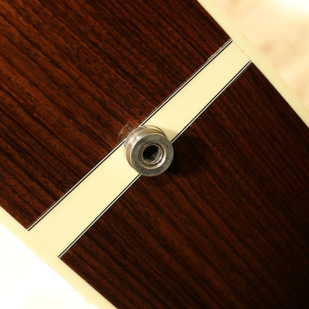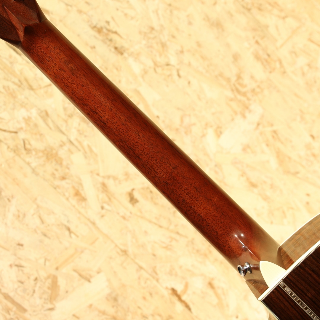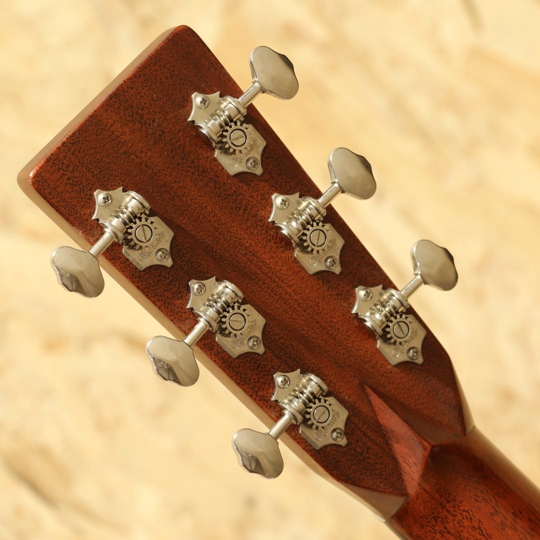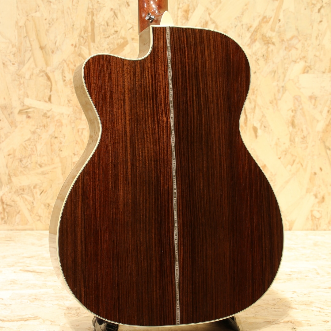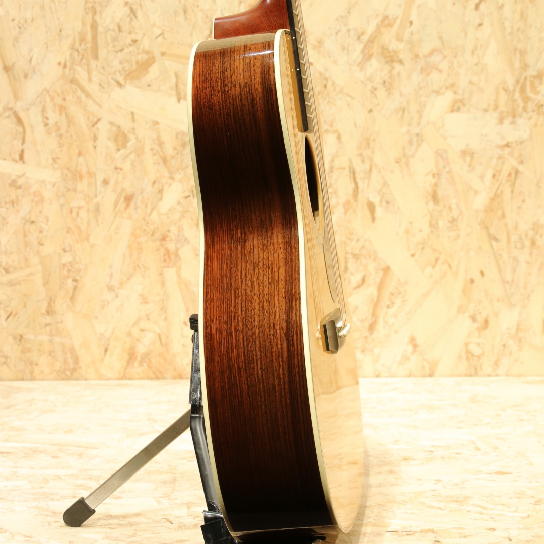 現マーチン工場の中でも、卓越した技術と豊富な経験から至極のギターを造り出す"Martin Custom Shop"。ここ数年一際話題を集めるオーセンティックシリーズの製作をはじめ、高い完成度を誇るこだわりのカスタムモデルを製造するトップクラスの部門。本器はカスタムショップ製OM28カッタウェイスタイルの”CTM OMC-28 Adirondack Spruce”、2017年製USED品。アディロンダックスプルーストップ、ローズウッドサイド&バック、ジェニュインマホガニーネック、44.5mmナット幅、モディファイドローオーバルネックプロファイル、パフォーミング・アーティスト・テーパー、エボニー指板&ブリッジ、ダイヤモンドスクエア指板ポジション、アイボロイドバインディング、ゴトーオープンバックバタービンノブペグ、ベッコウ柄ピックガード、2wayアジャスタブルロッド、アディロンダックスプルースGEスキャロップドXブレイシング、ネックヒールにストラップピン装着、FISHMAN Ellipse Blendが後付け搭載。本器はOMシェイプをベースにベネティアンカッタウェイを採用、ハイポジションへのアクセスが容易となりフィンガースタイルでのソロ弾きの演奏性の向上は勿論のこと、フレーズを多用するギターソロなどでも大いに演奏の幅が広がります。ロングスケールがゆえに抱えやすい小振りやサイズながらしっかりとした音圧を感じることができ、スタイル問わず幅広く扱いやすいことから大変人気の高いボディシェイプです。トップ&ブレイシング材にはアディロンダックスプルースを使用。アディロンダック特有の跳ねる様な膨らむサウンドの爆発力を持ちながら、スキャロップで空気感を含んだトーンを生み出し、OOOボディでサウンドバランスが整えられています。現代的な44.5mmナット幅で音の分離感良く、押弦の際に横の弦に指が干渉しにくい仕様。薄めで演奏性の高いモディファイドローオーバルネックシェイプとの組み合わせで実数値ほどの幅広さを感じることなく、違和感なく演奏いただけます。カスタムショップならではの緻密な木工精度や組み込み精度は音色の解像度が高く、瑞々しく艶やかなトーンはレギュラーラインではなかなか感じることのできない仕上がりです。後付け搭載ピックアップはFISHMAN製Ellipse Blend。アンダーサドルピエゾピックアップとグースネック付きマイクの2Way仕様、サウンドホール縁に取り付けられたコントロールパネルでブレンド加減も直感的に操作できます。プレイスタイルに合わせたサウンドメイクが手元で操作でき、様々なシチュエーションにも難なく対応します。ブリッジ上部の塗装にブリッジに沿って空気が入った箇所が見られますが、よく見てわかる程度のもので現状ご使用への影響はありません。その他、ブリッジ際に沿った塗装面のみのチェッキング、トップやバック面の擦り傷、ネックヒール付近のへこみ傷、ヘッド裏先端にチューナーが塗装に反応した形跡、バックバインディングの剥がれ修正により一部継ぎ足された箇所など表面的な使用感はあるものの、しっかりと手入れのされた個体です。ネックコンディションも良好。ネックヒールへのストラップピンも取り付けられており、すぐにでもステージやレコーディングで活躍できるポテンシャルを持ったカスタムショップOMモデル。憧れのマーティンカスタムショップでガンガン使えるメイン機をお探しの方は是非お試しください。オリジナルハードケースが付属します。