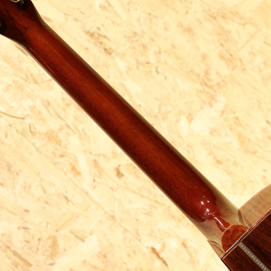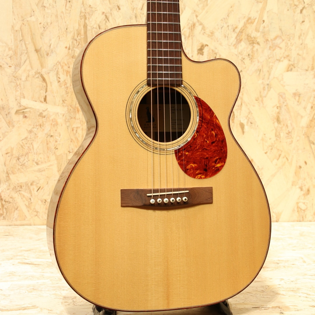 千葉市稲毛区にて工房を構える"沖田ギター工房"。40年を越えるキャリアで数多くの修理を手がけ、そこから得たノウハウと技術をもって製作される"Okita Guitars"。鉄弦の製作は2007年頃から開始されています。鉄弦とナイロン弦に共通する信念、一音一音が力強く太い音色であり、各弦の音が重なり合った時に音がとろけるような音作り。そのためにトップを極力厚めにし、ネックとボディは一体化するようなスペイン式ネックジョイントでの製作が行われています。沖田正和氏の信念をカタチにした拘り溢れるギター。本器はOMスタイルで製作が行われた"OMOM NAT CW"。2021年製USED品。アディロンダックスプルーストップ、インディアンローズウッドサイド&バック、マホガニーネック、ローズウッド指板&ブリッジ、グローバーロトマチックゴールドペグ、べっ甲柄バインディング、べっ甲柄ピックガード、スキャロップドXブレイシング。トラディショナルなスタイル、ルックスを持ちながら独自の解釈とアレンジが施されたギター。装飾や指板ブリッジは18風、木材やバックのセンターストリップは28風。所謂スタイル21のようなデザインを持ったOMです。スケールは640mmに設定されており、ほんの僅かショートスケールへとアレンジ。設計コンセプトの通りに一音一音が太く明瞭な音色。各弦の音が程よく混じり合い、やや飽和感のあるトーンには音作りの拘りを感じさせます。ボリューミーに、クリアに。アディロン特有の太くダイナミックなサウンドを上手く制御されたようなトーンを持つ1本です。ピックでのアグレッシブな演奏には潰れない響きで、フィンガーでの繊細なタッチには太く繊細なトーンで応えてくれます。演奏スタイルを問わない辺りも扱いやすさを感じさせます。ボディサイド6弦側ショルダーの角に当てキズによる僅かな塗装欠け、ヘッド表の上部に当てキズによって白くなっている箇所こそ見られますが、その他は全体を通して塗装表面上に極薄い擦れキズが見られる程度と良好な状態をキープ。ネックのコンディションも良いまま保たれており、サドル残りも充分。クラシックの製作から鉄弦へ。他ブランドでもこの経緯を持つところは存在しますが、こと修理において高い難易度のモノを直してきた実績を持つ沖田氏。その過程で得てきた経験値は数知れません。中々出回りの少ない沖田ギター、お探しだった方は是非お試し下さいませ。