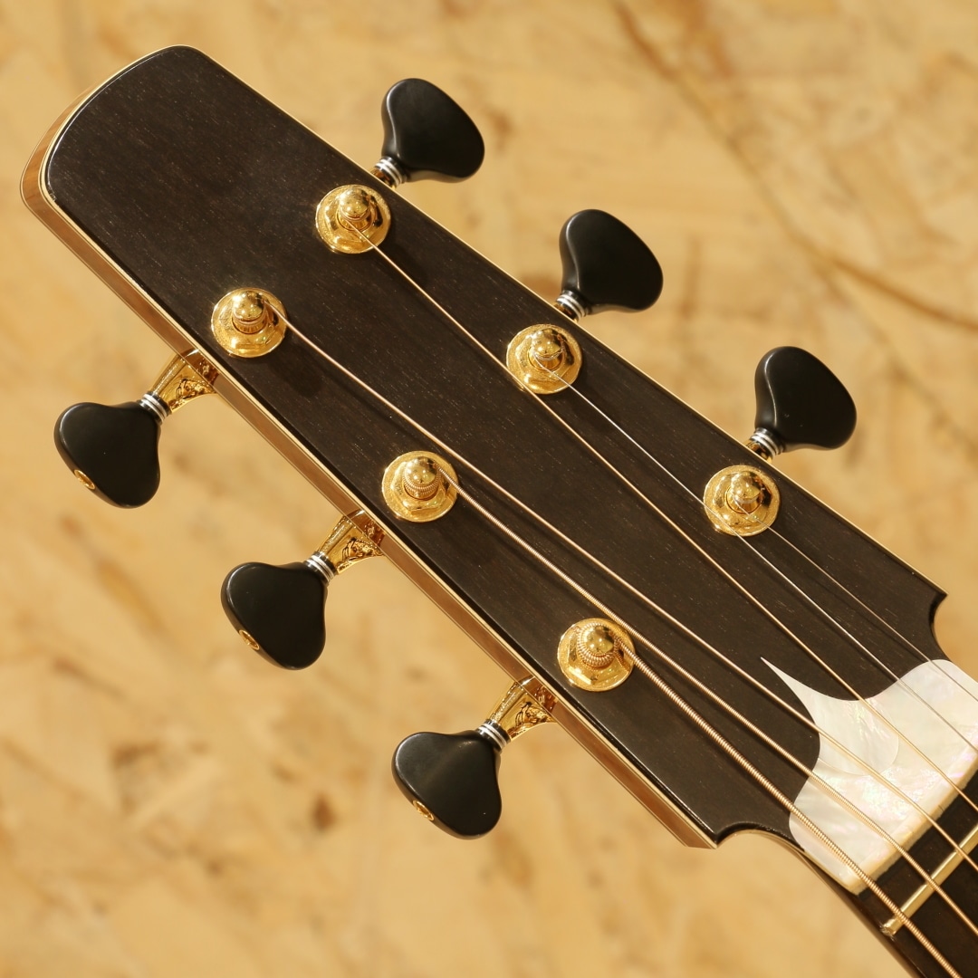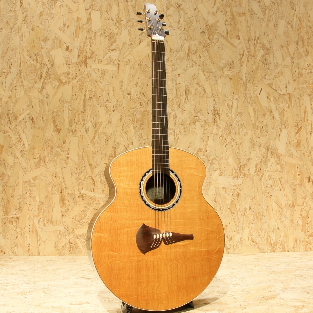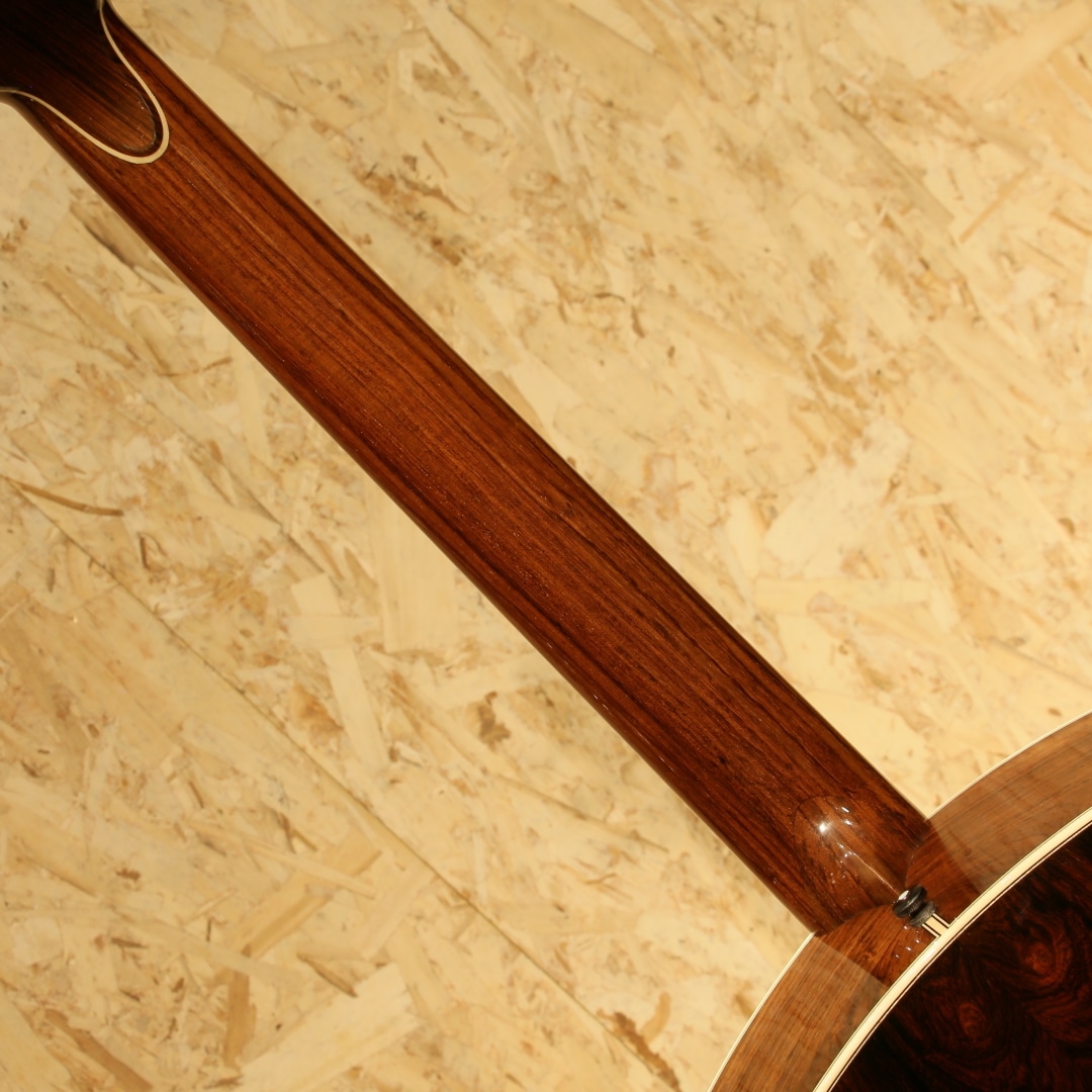 Steve Klein。50年もの間、ギター業界のトップを走り続ける一人の偉大なルシアーでもあり設計者です。独創的なデザインの一つ一つは人間工学的理論に基づき設計され、発明家的思考でストレスなどが解消されています。しかしそれは彼のアイディアのみで生み出したものではなく、長年築き上げた一流のアーティストとのコミュニケーションなどから得たトライ&エラーから構築されたもので、その一つ一つは実から得たものです。その一つ一つが革新的で先を行く彼のデザインや構造理念がギター業界に与えた影響は計り知れません。現在、KleinギターはSteve Klein氏とその設計を完全に具現化できる熟練ビルダーのSteven Kauffman氏のパートナーシップで製作されています。カフマン氏の技術の高さはクライン氏がパートナーシップとして選んだというだけでも言うまでもないでしょう。天才的な技術の高さでクライン氏の頭脳を具現化しています。本器は2017年の作品USEDです。"457"という約18インチのボトム幅を持つジャンボサイズのモデル。もっともクラインギターらしいサウンドが堪能できる一本です。白肌のシトカスプルーストップ、この上ない質感のCSA RWサイド&バックが採用されています。ローズウッドネック、エボニー指板、CSA RWブリッジ、セパレートサドル、ゴトー510ペグ、ウッド&パールロゼッタ、クリアピックガード、ホリーウッド・バインディング、0フレット仕様。トップ構造はエックスブレイシングと双璧をなすカーシャブレイシングとなります。蜘蛛の巣状に貼り巡らせたクラインギター唯一のスタイルです。Steve Klein氏とSteven Kauffman氏は二人とも伝説的な人達です。カフマン氏はビルダーの間でも有名な腕前の持ち主で、奇想天外なクライン氏の設計を天才的な技術で実現しています。正直、全く免疫のない角度から言葉を失うレベルの凄いサウンドで、音出し一発目で月並みのギターではないことを誰もが理解できるはずです。腹とネックを持っている左手に走る楽器の揺れが尋常ではなく、圧巻のボリュームを身上としています。クリアな中高音はもちろん、バズーカ級の低音の響きが持ち味です。爪が弦に当たる生々しい音まで再生されます。とにかくアクセル全開。こんなブースト感満載のサウンドをほかに知りません。実際に早く確かめていただきたいです。氏のギターは使う木材、デザイン、音色。すべてが個性的ですが、ただの奇抜なギターとはワケが違い、そのすべてが綺麗に混ざり、高い水準で完成されています。経年のラッカー引けによる木の導管のくぼみやヘッドとネックの木継ぎ目に小さく極わずか表面的な塗装の曇りが見られる程度の極上品。ネックのコンディションもストレートで大変良く、プレイアビリティーも極上。商品状態はほぼパーフェクトに近いコンディションをキープしています。新品中古問わず見かけることは稀で、日本においてもなかなか流通することがありません。世界には次元を超えた天才が存在するのだと改めて気づかせてくれる、至高の一品です。オリジナルホワイトカラーカールトンケース付属。